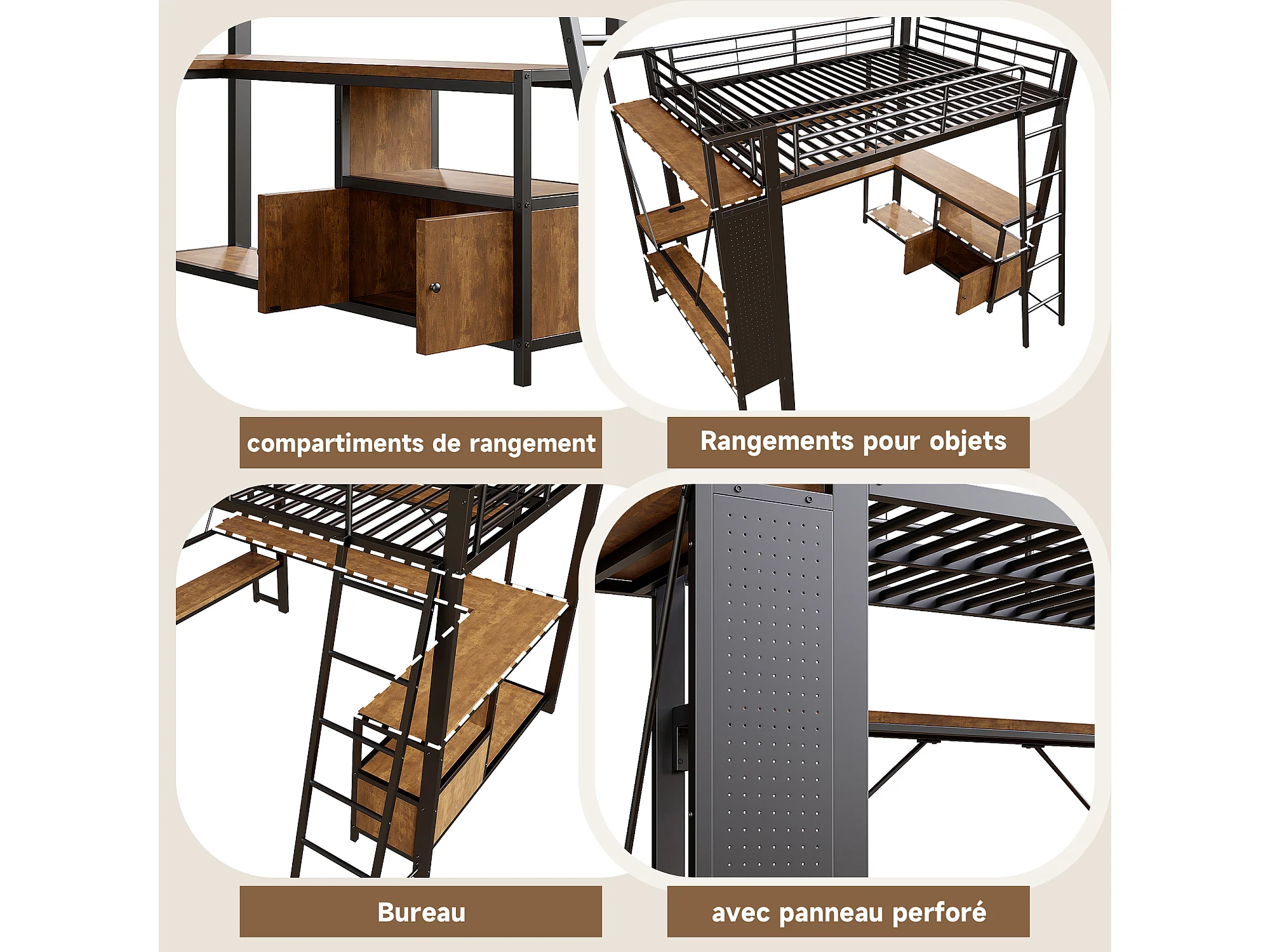 Lit mezzanine enfant - 140 x 200 cm - structure en fer - avec Leds + bureau + étagère de rangement + USB - métal - noir