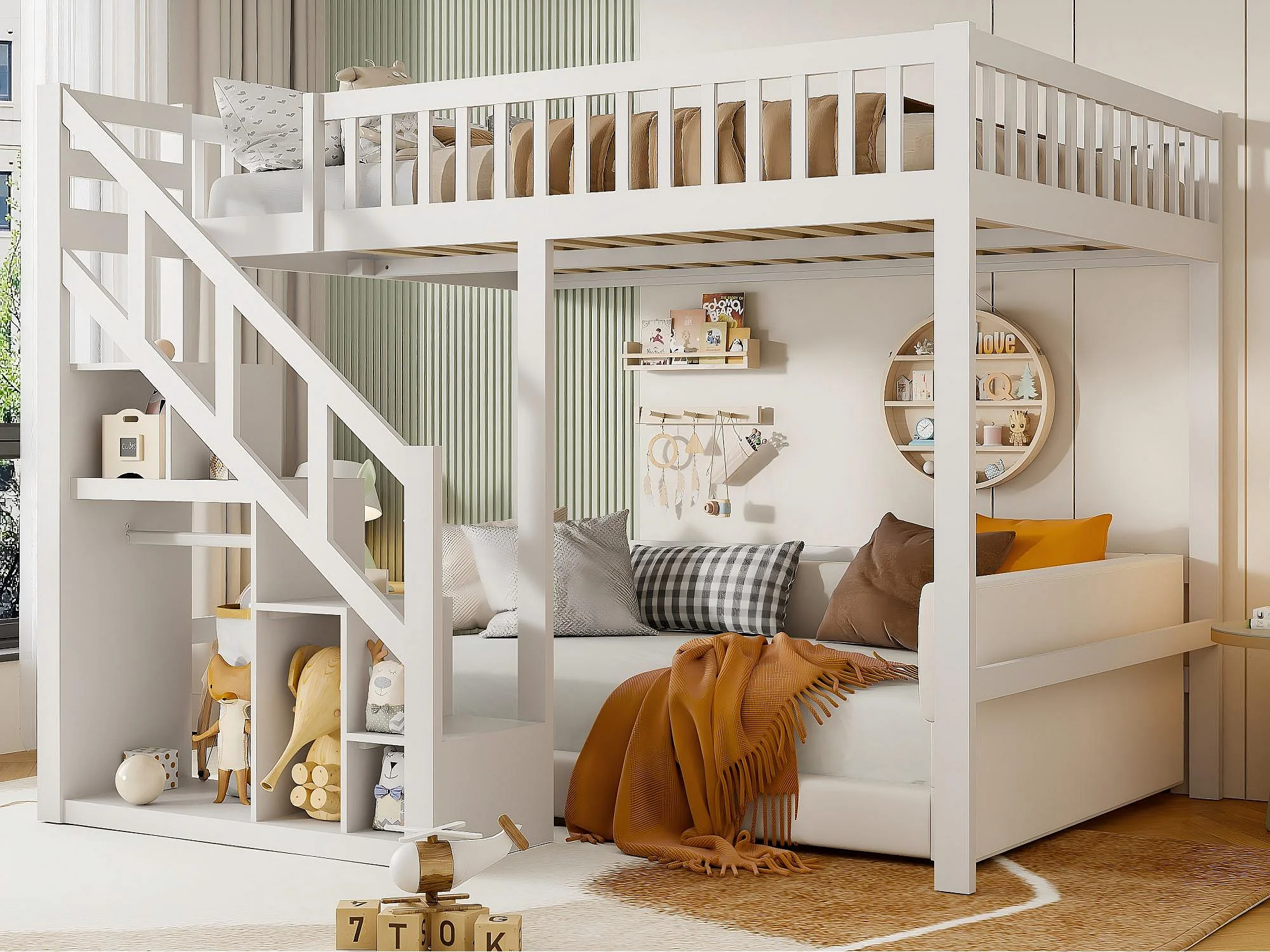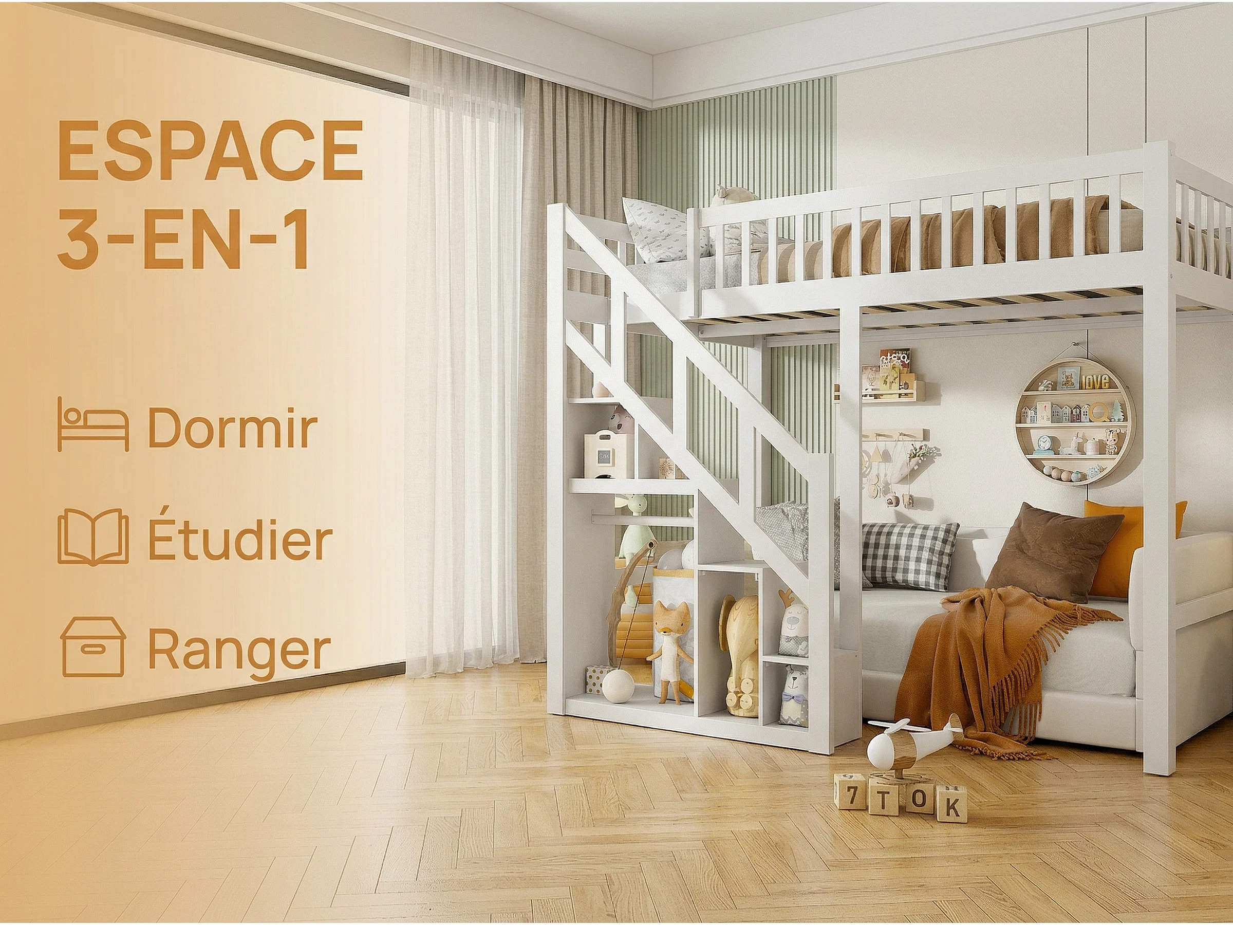Lit mezzanine enfant 140x200 cm avec escalier de rangement, lit en bois massif avec barrières, gain de place, blanc