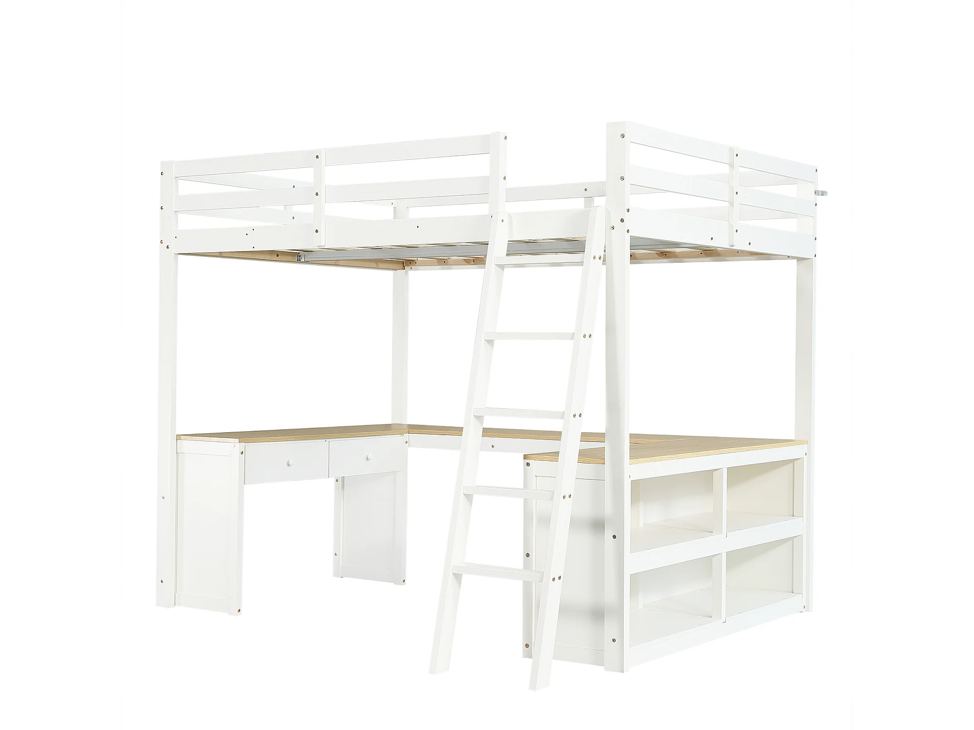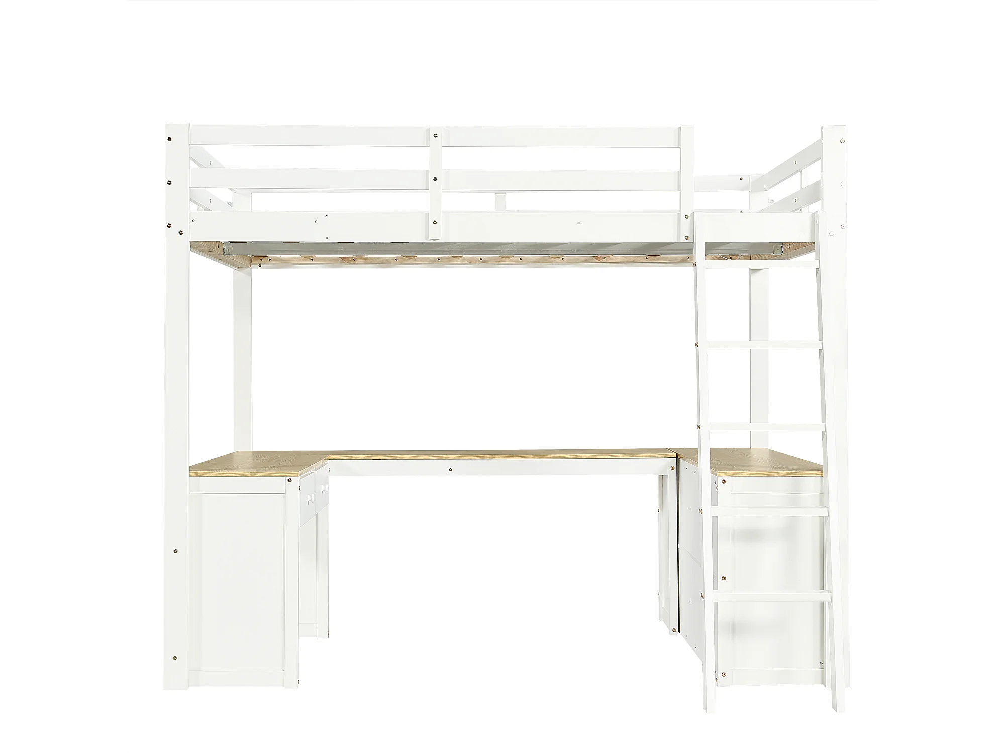 Lit mezzanine enfant 140x200 cm avec table en forme de U, 2 tiroirs et rangement - Bois blanc
