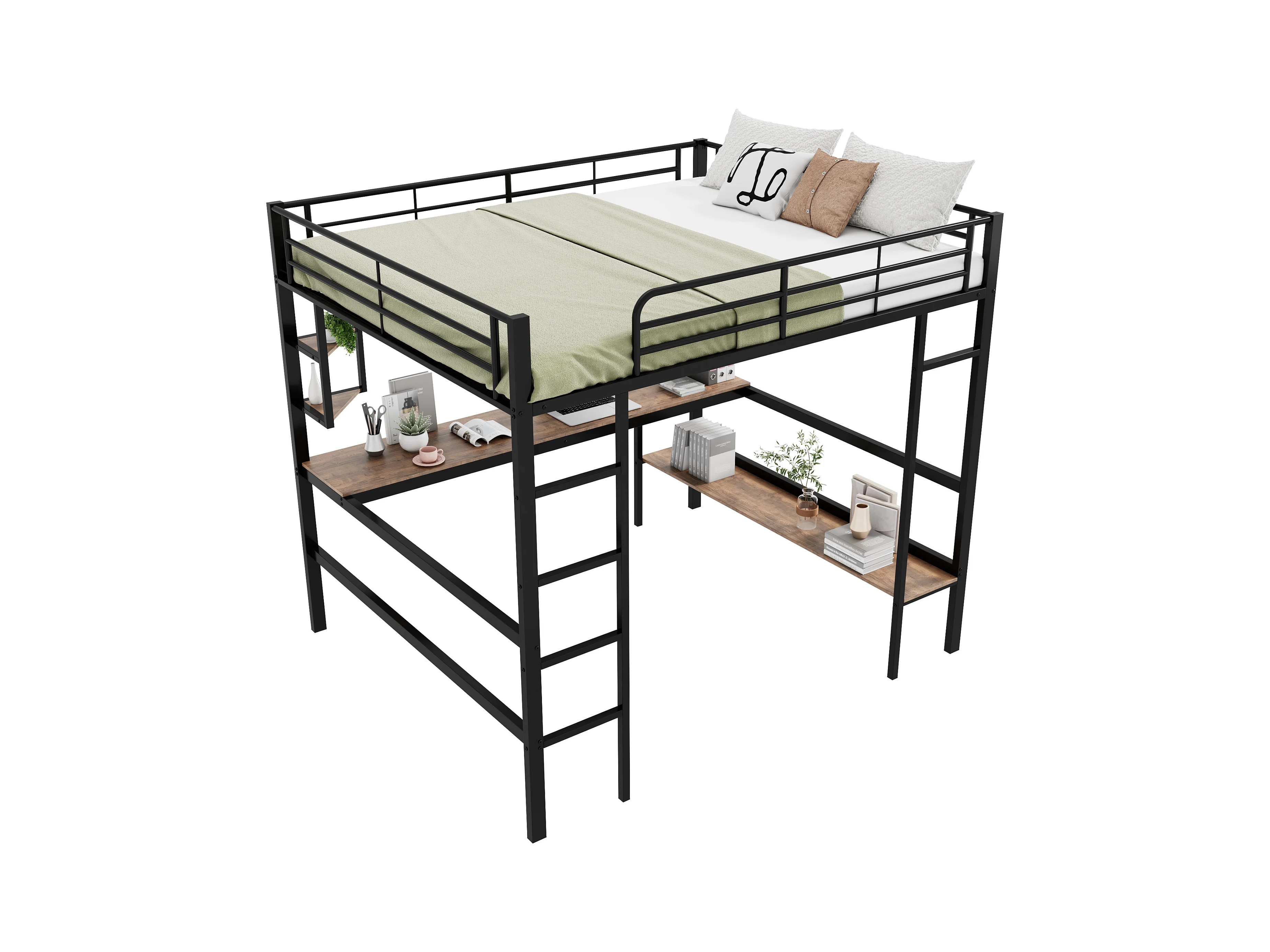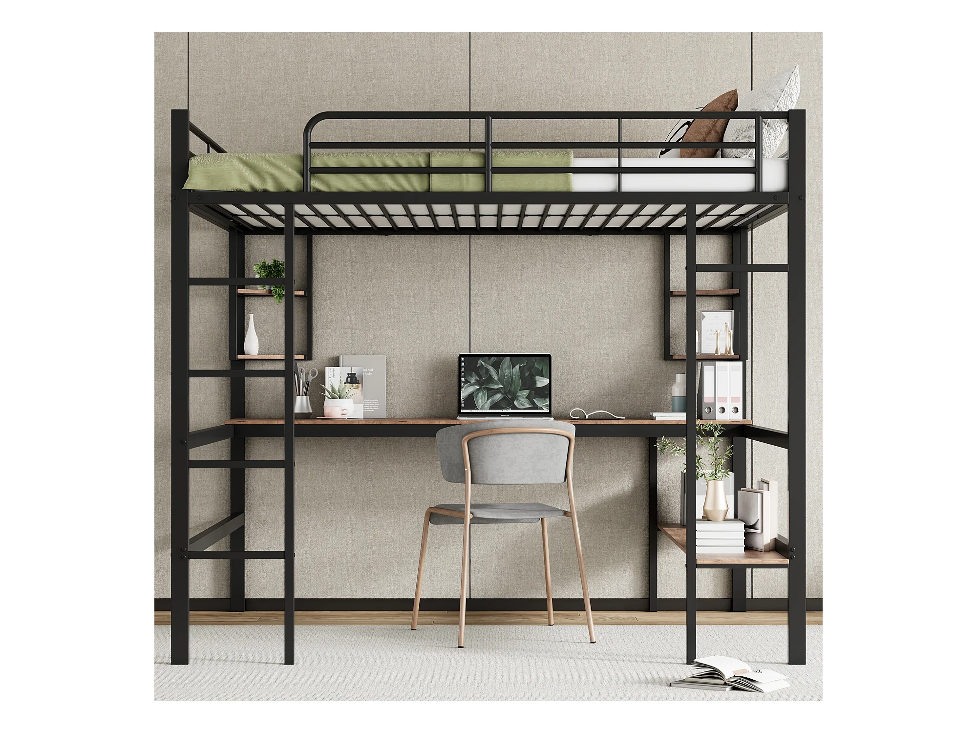 Lit mezzanine enfant 140x200 cm noir, avec bureau plat et étagère de rangement, lit métal, sans matelas