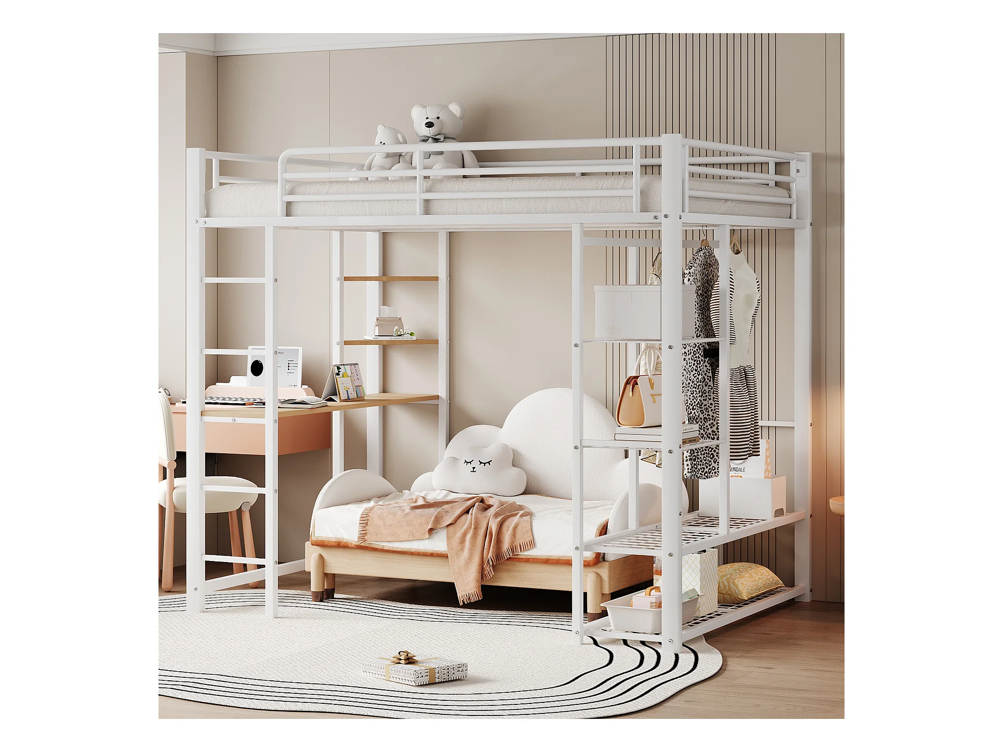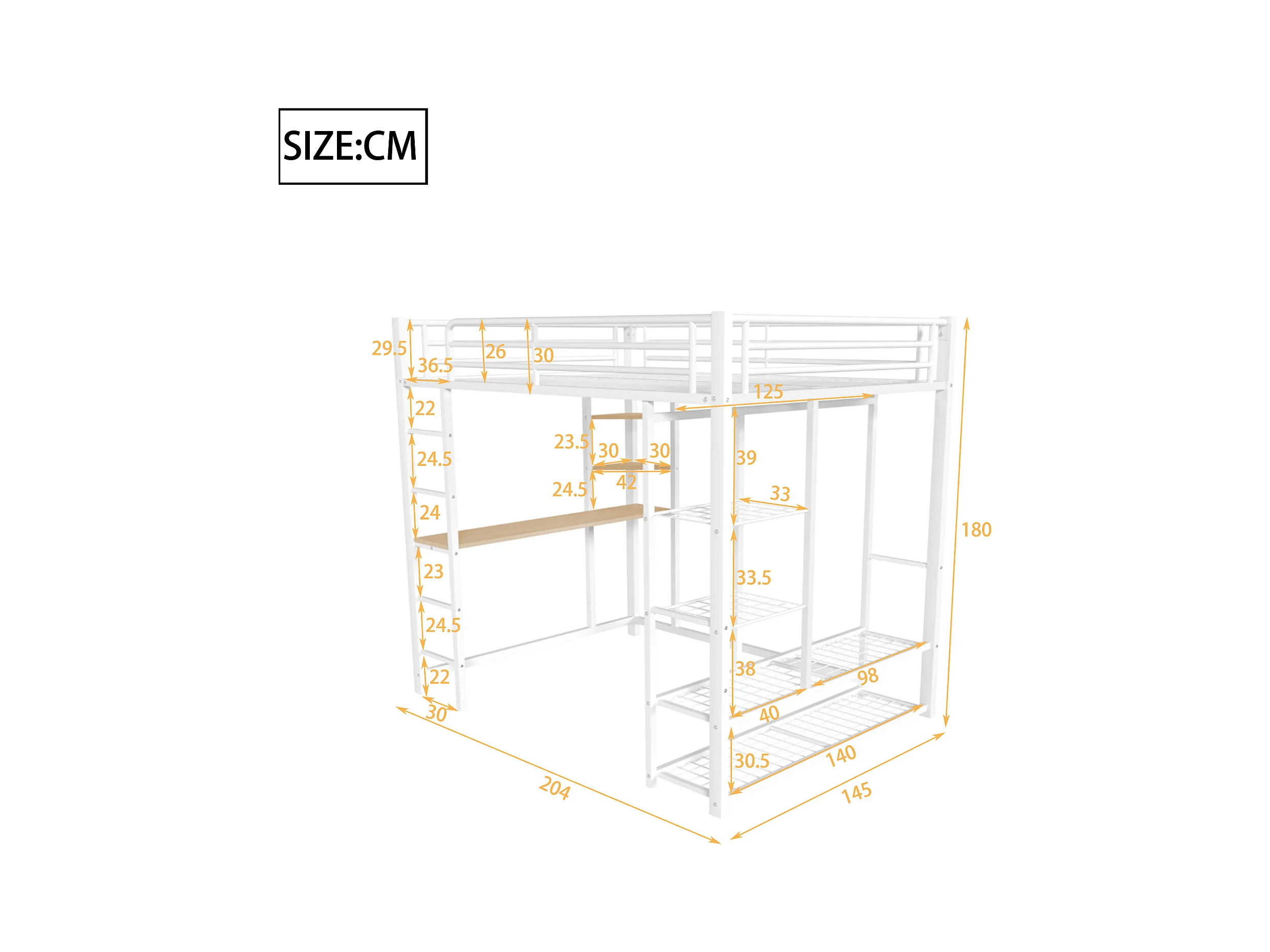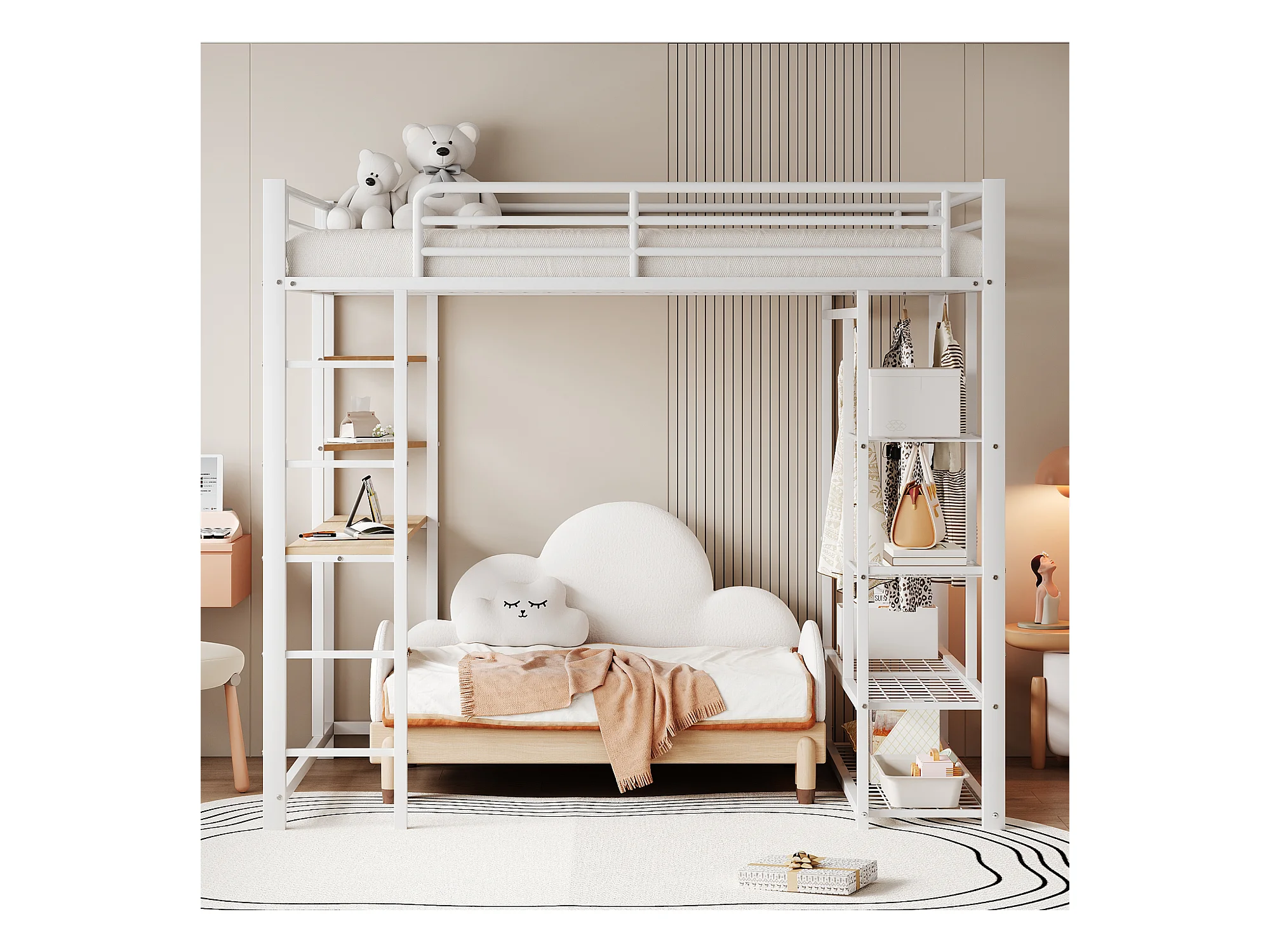 Lit mezzanine enfant 140x200cm en fer blanc avec bureau, escalier et Etagère, sommier inclus, sans matelas