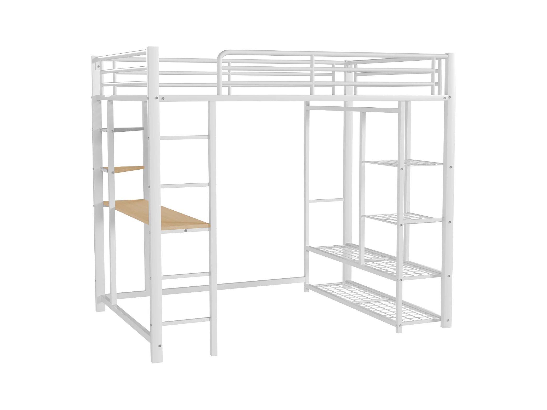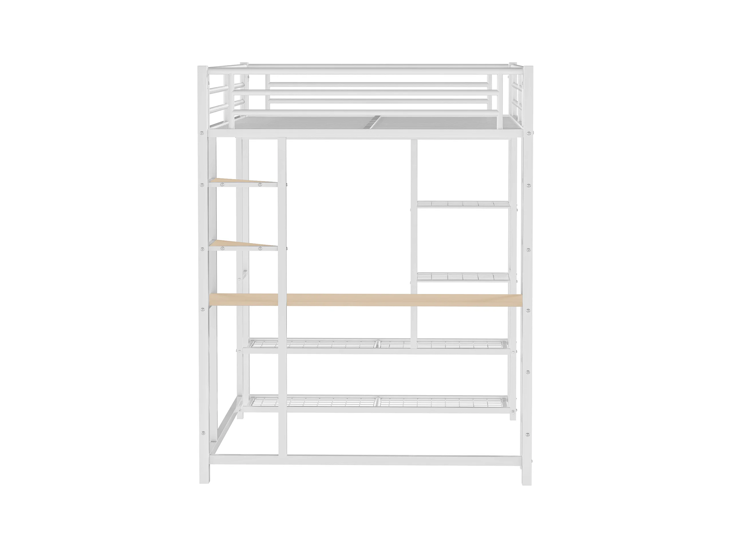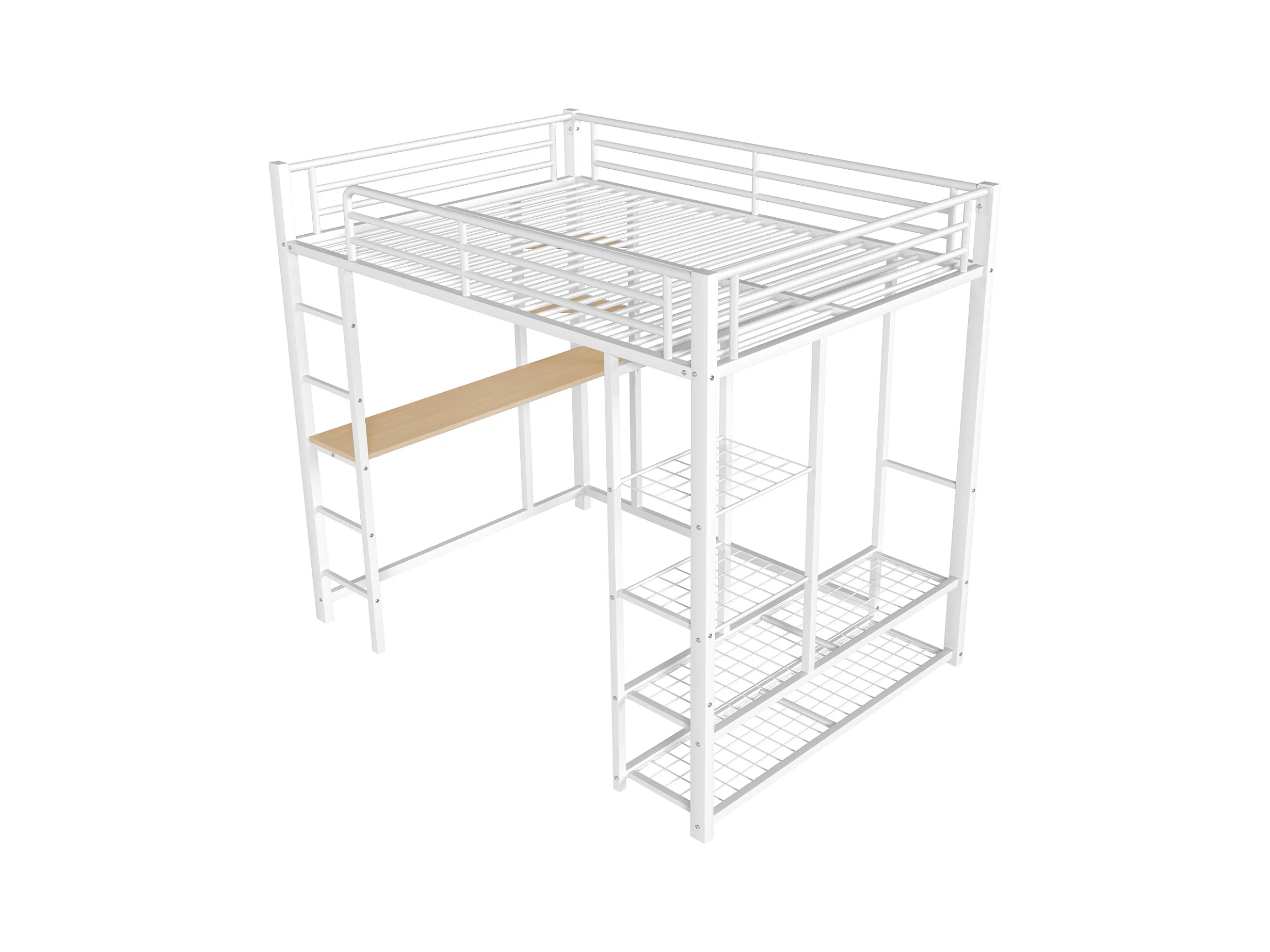 Lit mezzanine enfant 140x200cm en fer blanc avec bureau, escalier et Etagère, sommier inclus, sans matelas