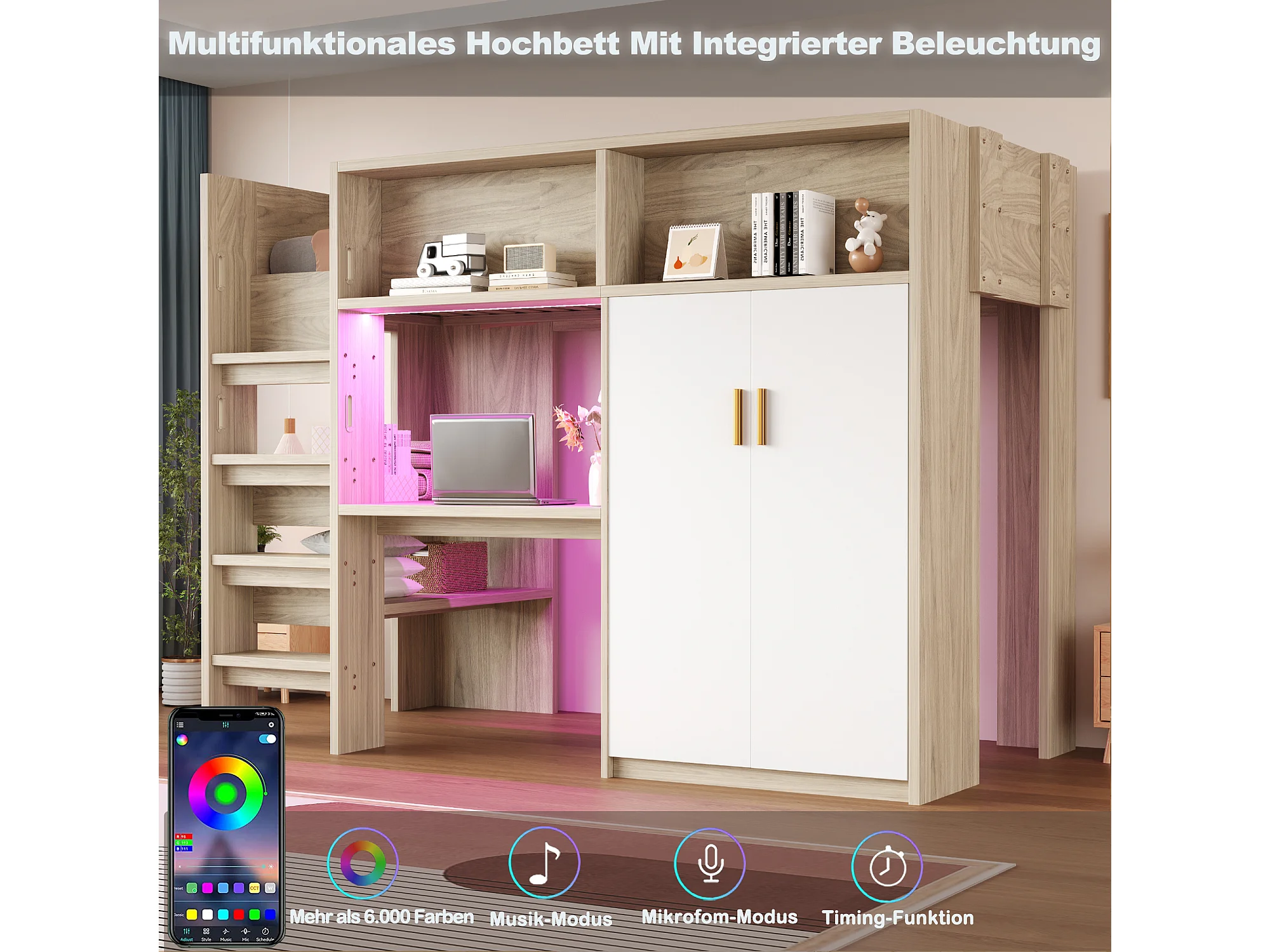 Lit mezzanine enfant - 90 x 200 cm - avec bureau + armoire + rangements + Leds - MDF + aggloméré - naturel
