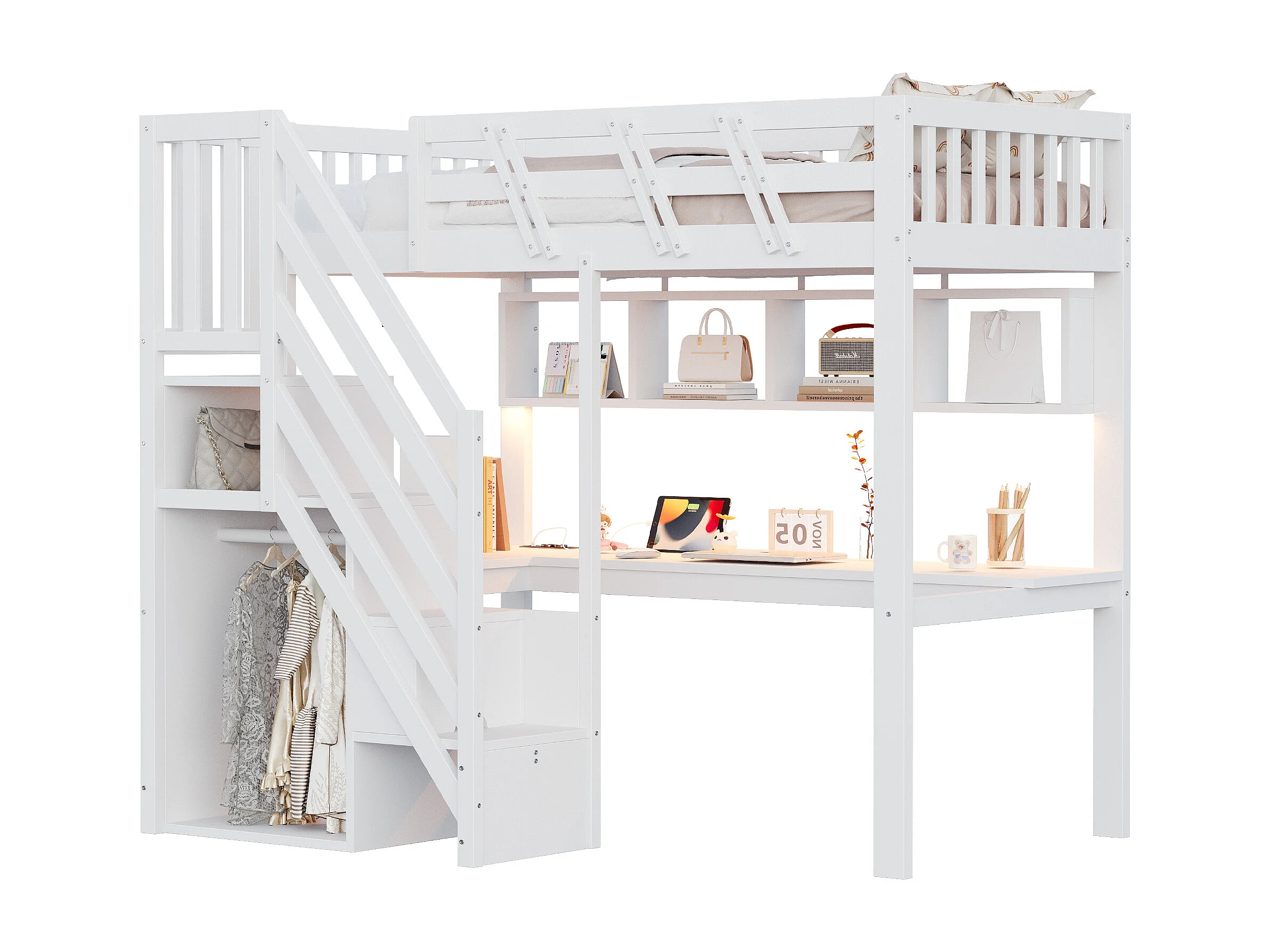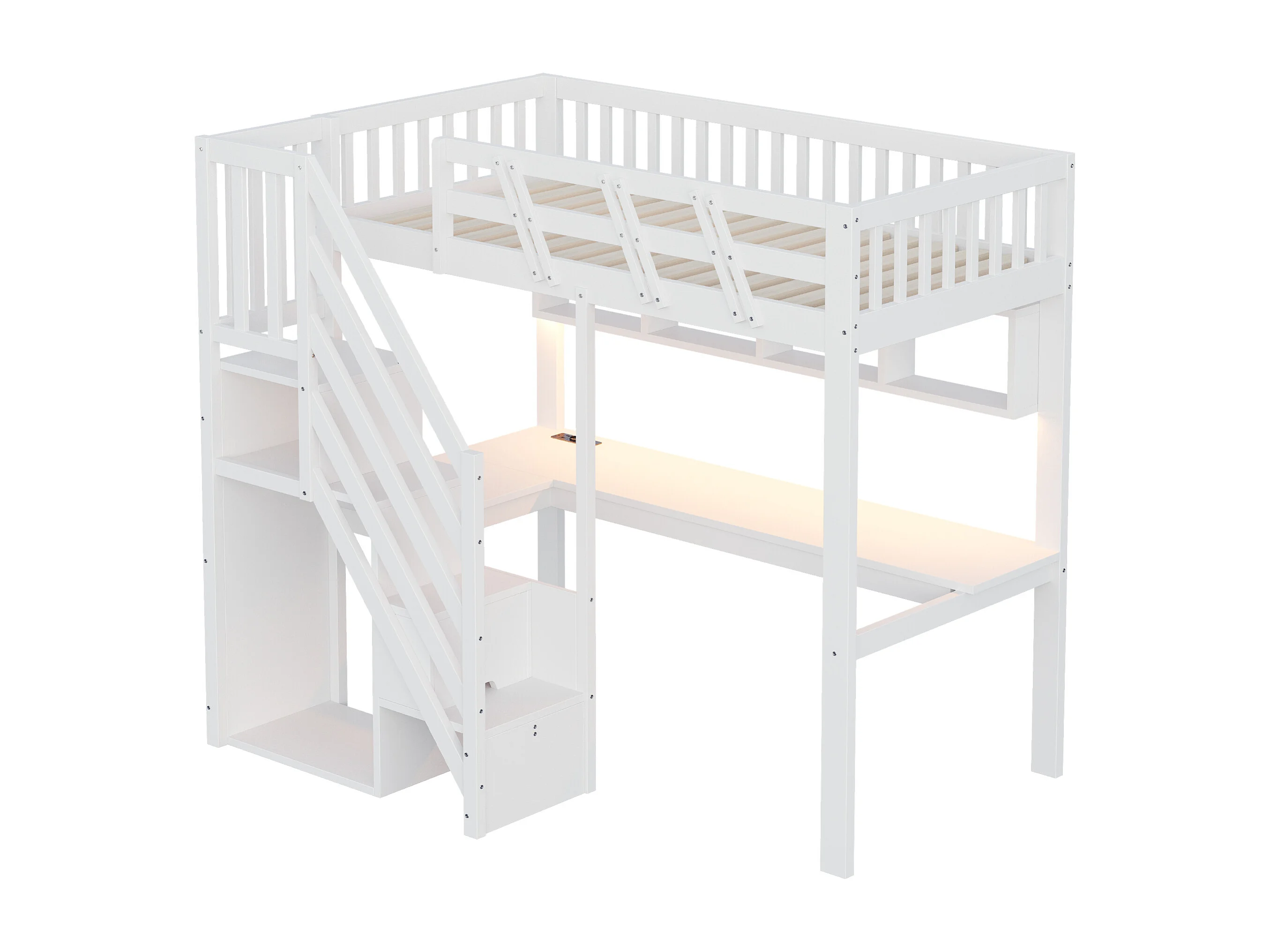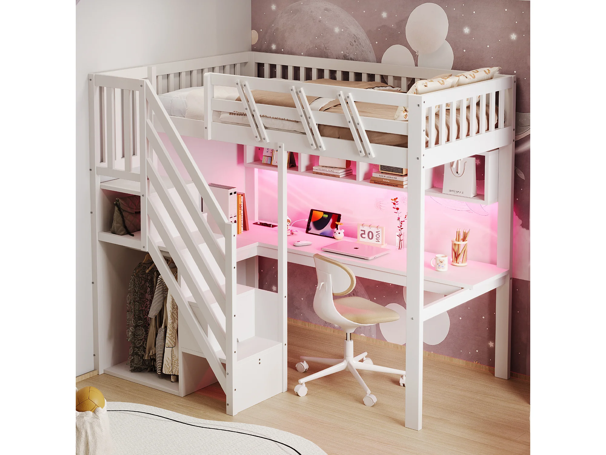 Lit mezzanine enfant - 90 x 200 cm - avec escalier de rangement + bureau + USB + Leds - bois - blanc