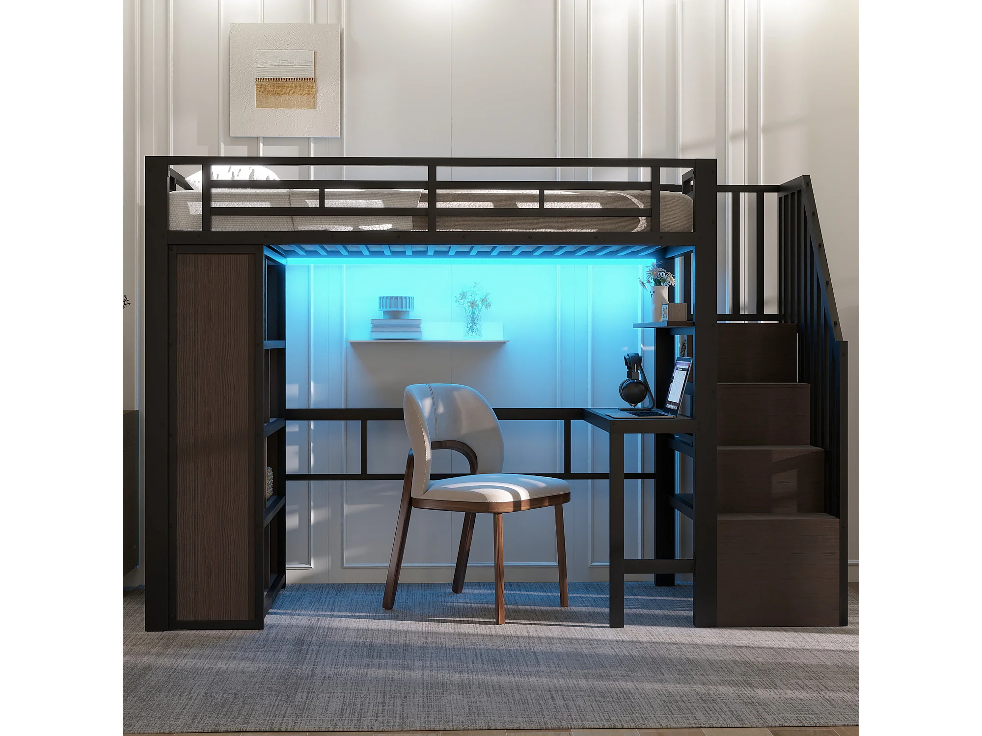 Lit mezzanine enfant - 90 x 200 cm - structure en fer - avec bureau + bibliothèque + Leds + escalier de rangement - métal - noir