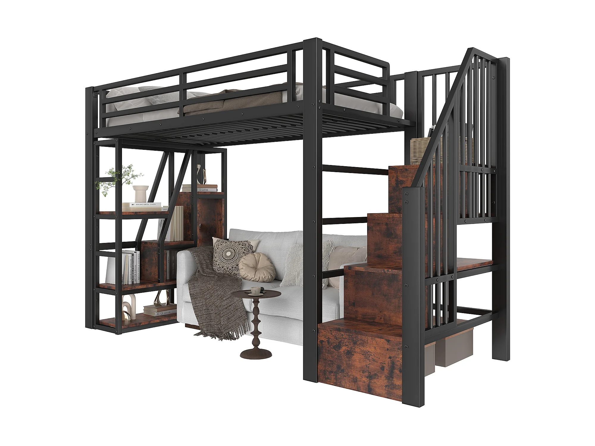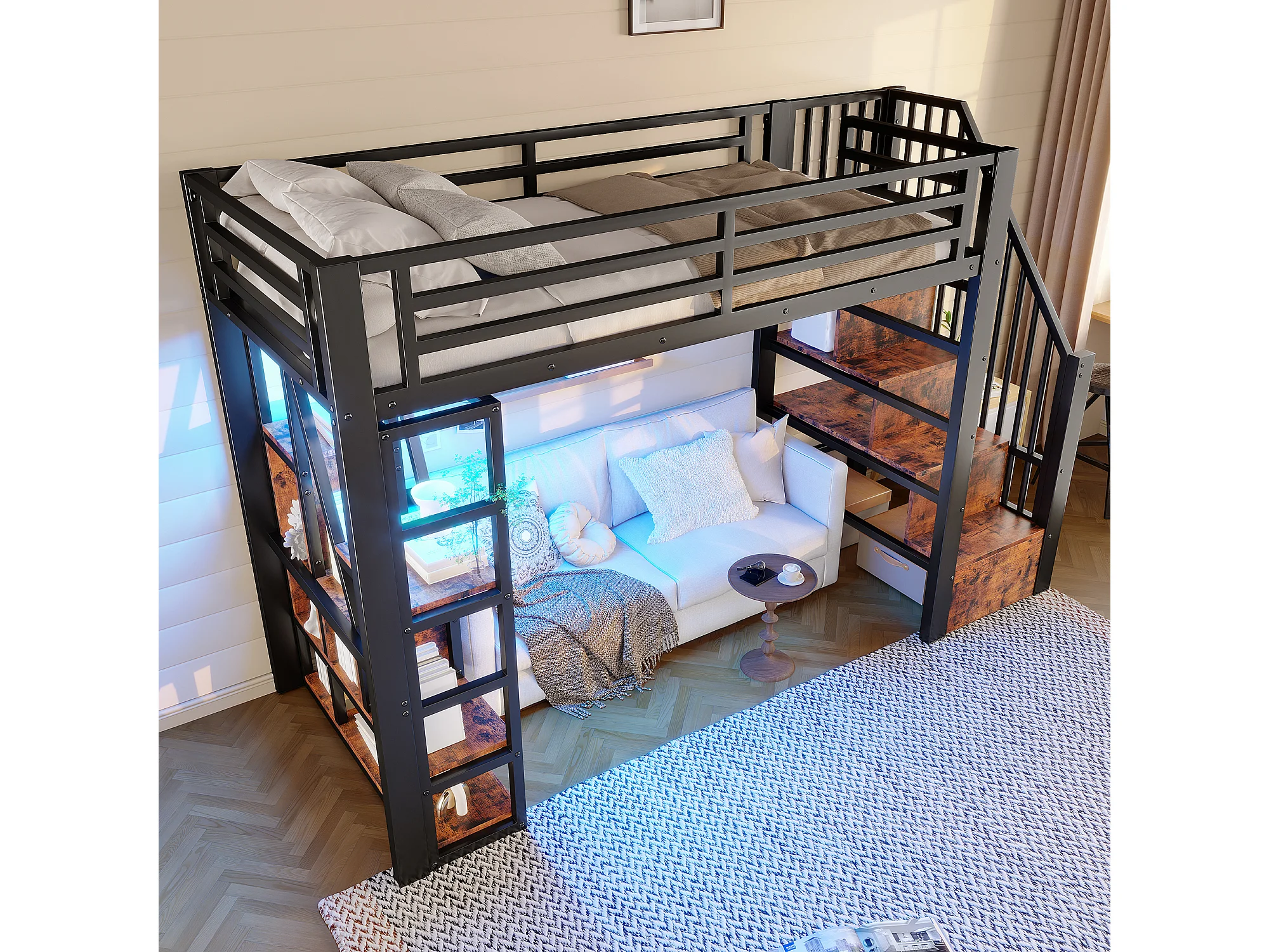 Lit mezzanine enfant - 90 x 200 cm - structure en fer - avec escalier et étagère de rangement + Leds - MDF + métal - noir