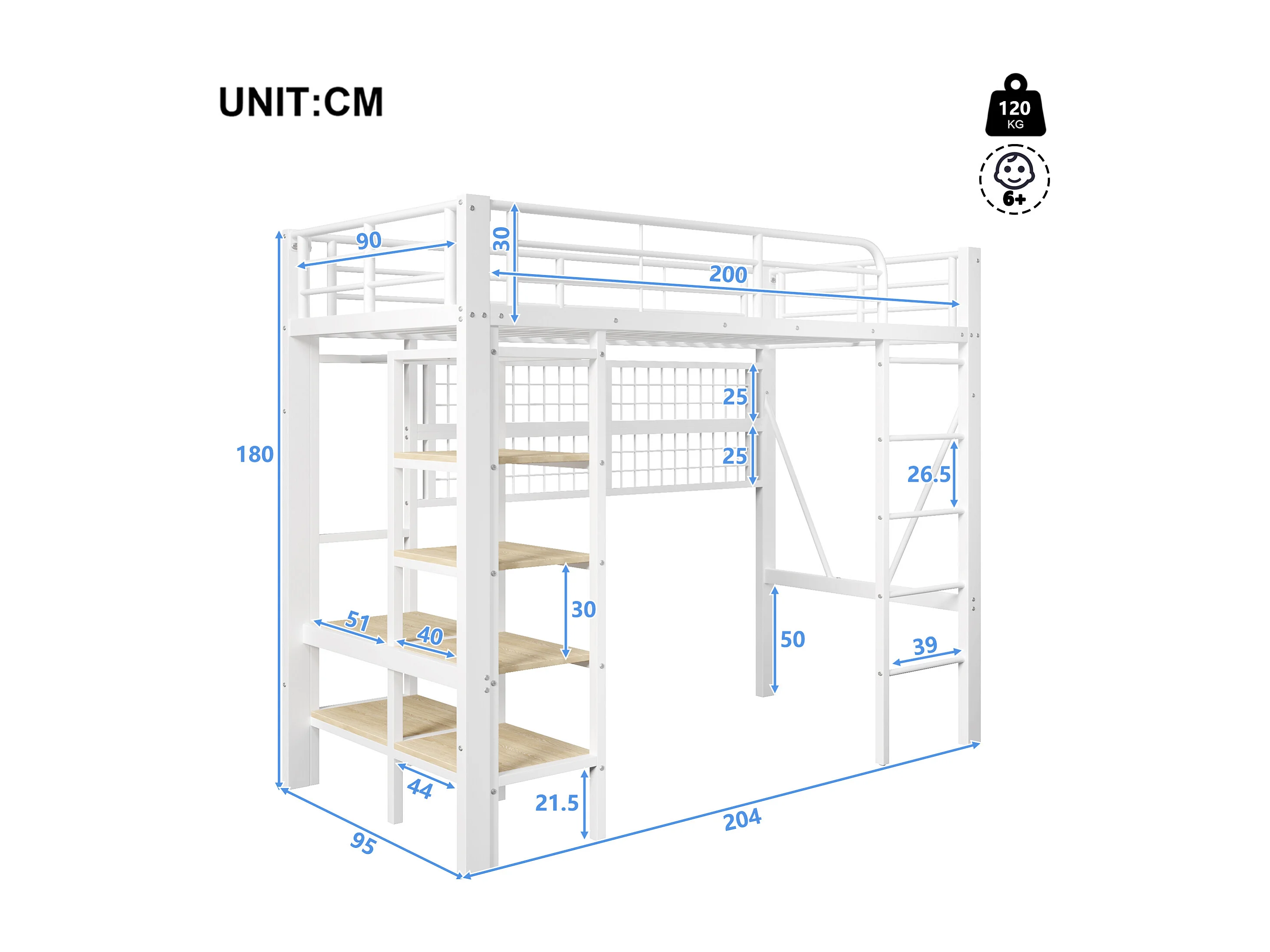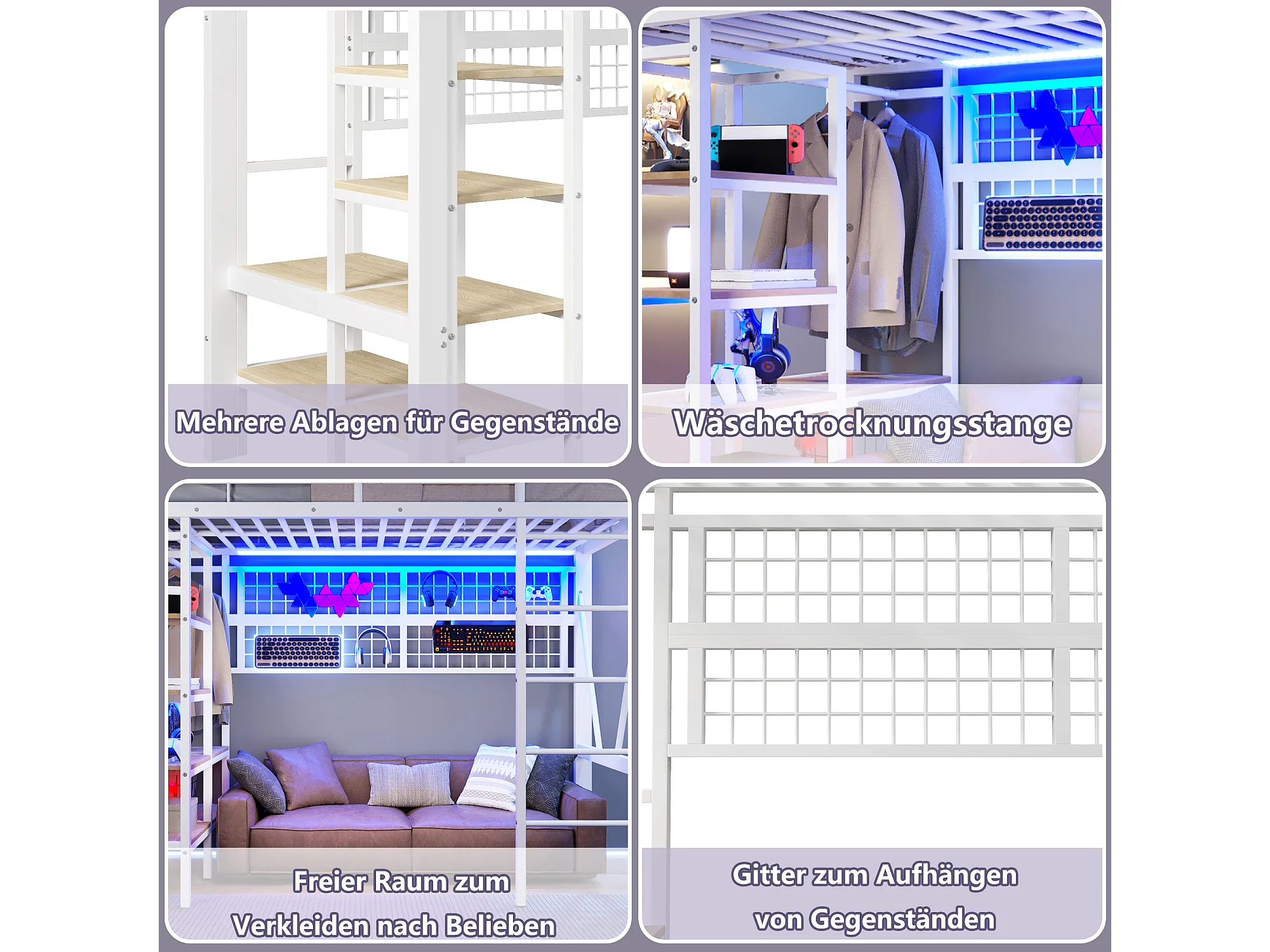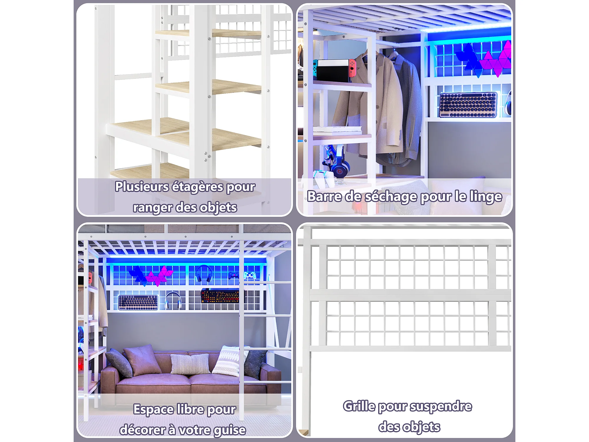 Lit mezzanine enfant - 90 x 200 cm - structure en fer - avec étagère de rangement + tringle à vêtements + Leds - métal - blanc