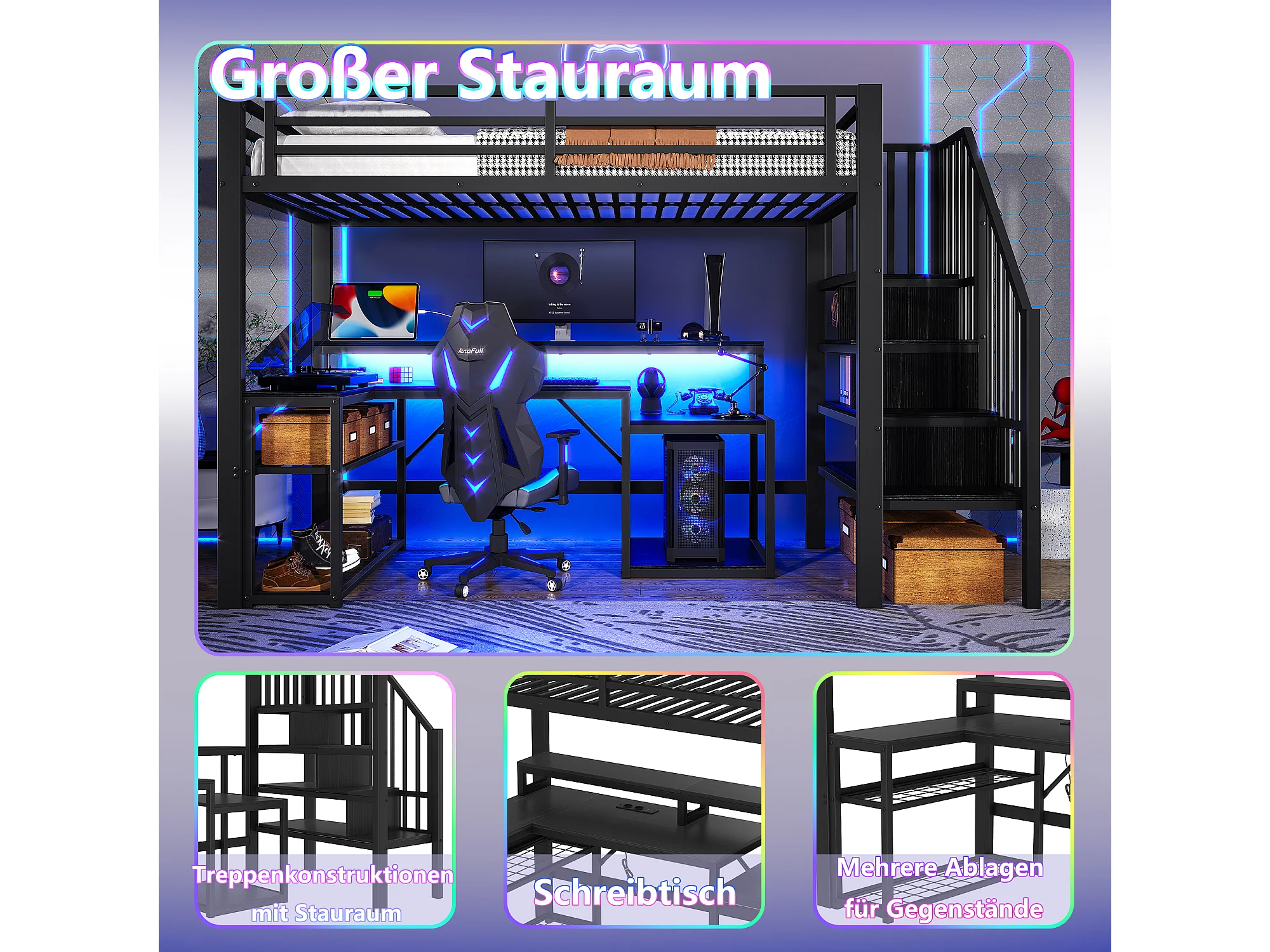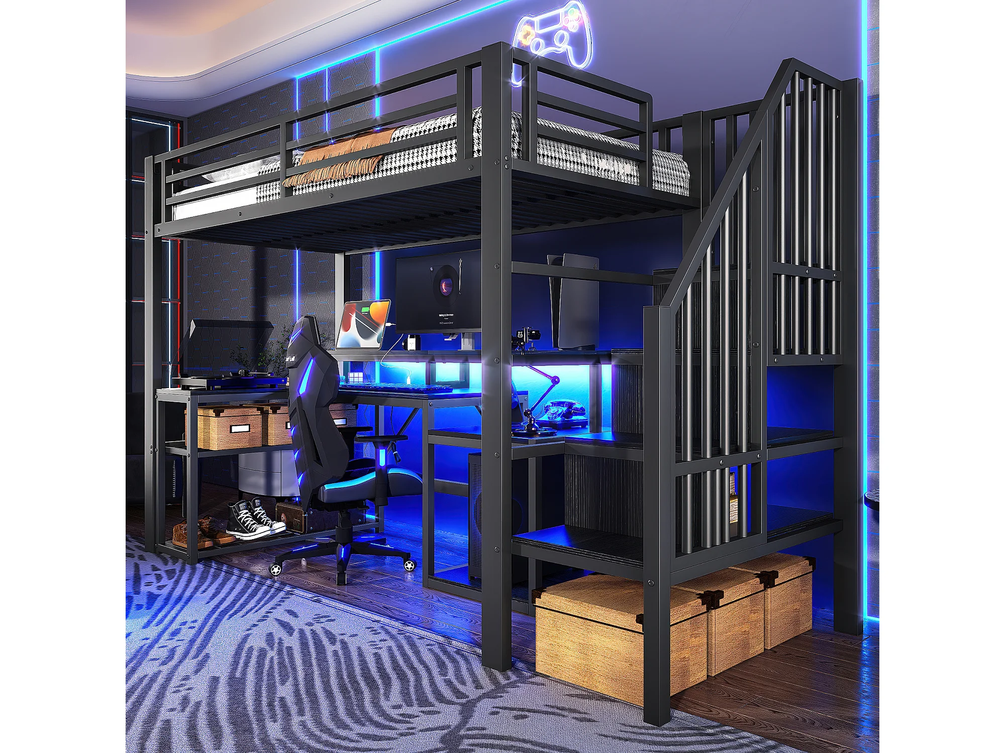 Lit mezzanine enfant - 90 x 200 cm - structure en fer - avec étagère + escalier de rangement + Leds + bureau + USB - métal - noir