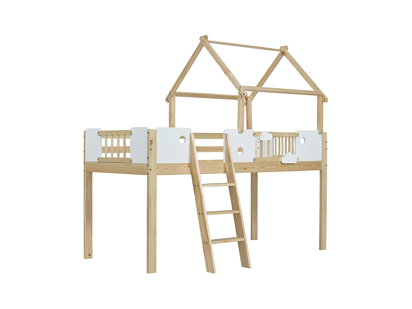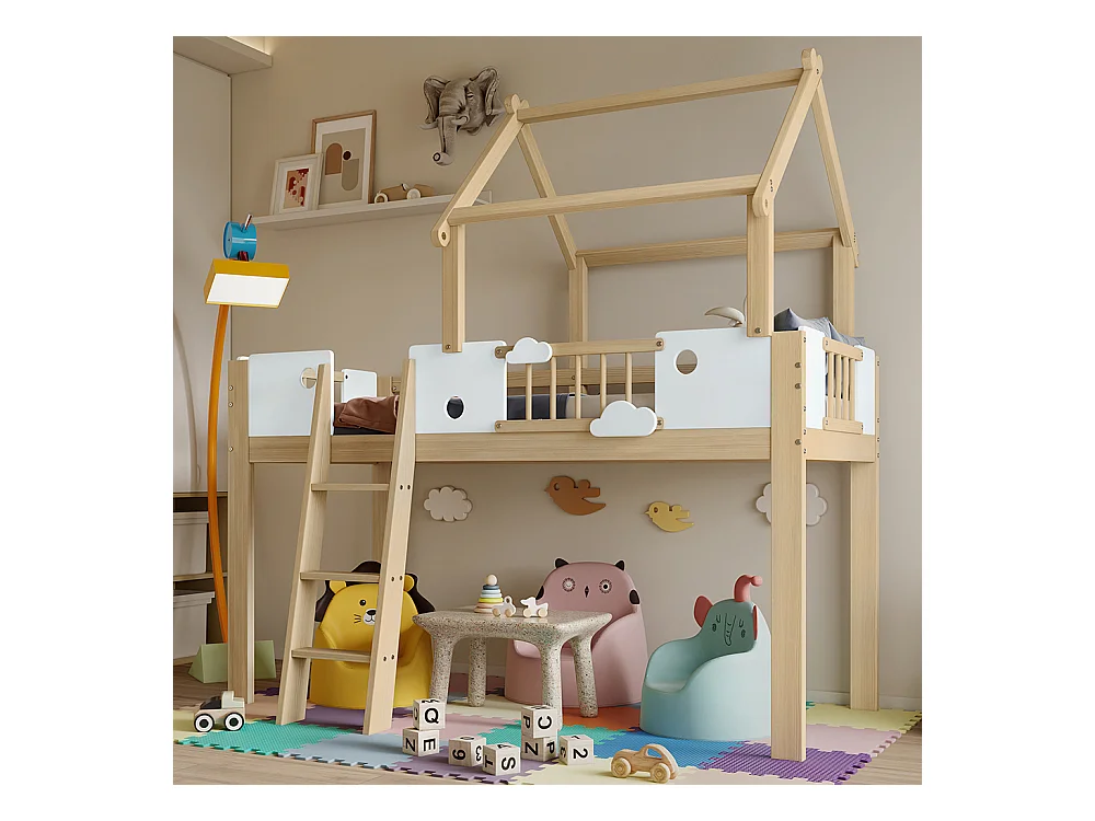 Lit mezzanine enfant 90x200 avec protection anti-chute et barre de sécurité avec échelle inclinée à trois marches pin+MDF+contreplaqué blanc+naturel