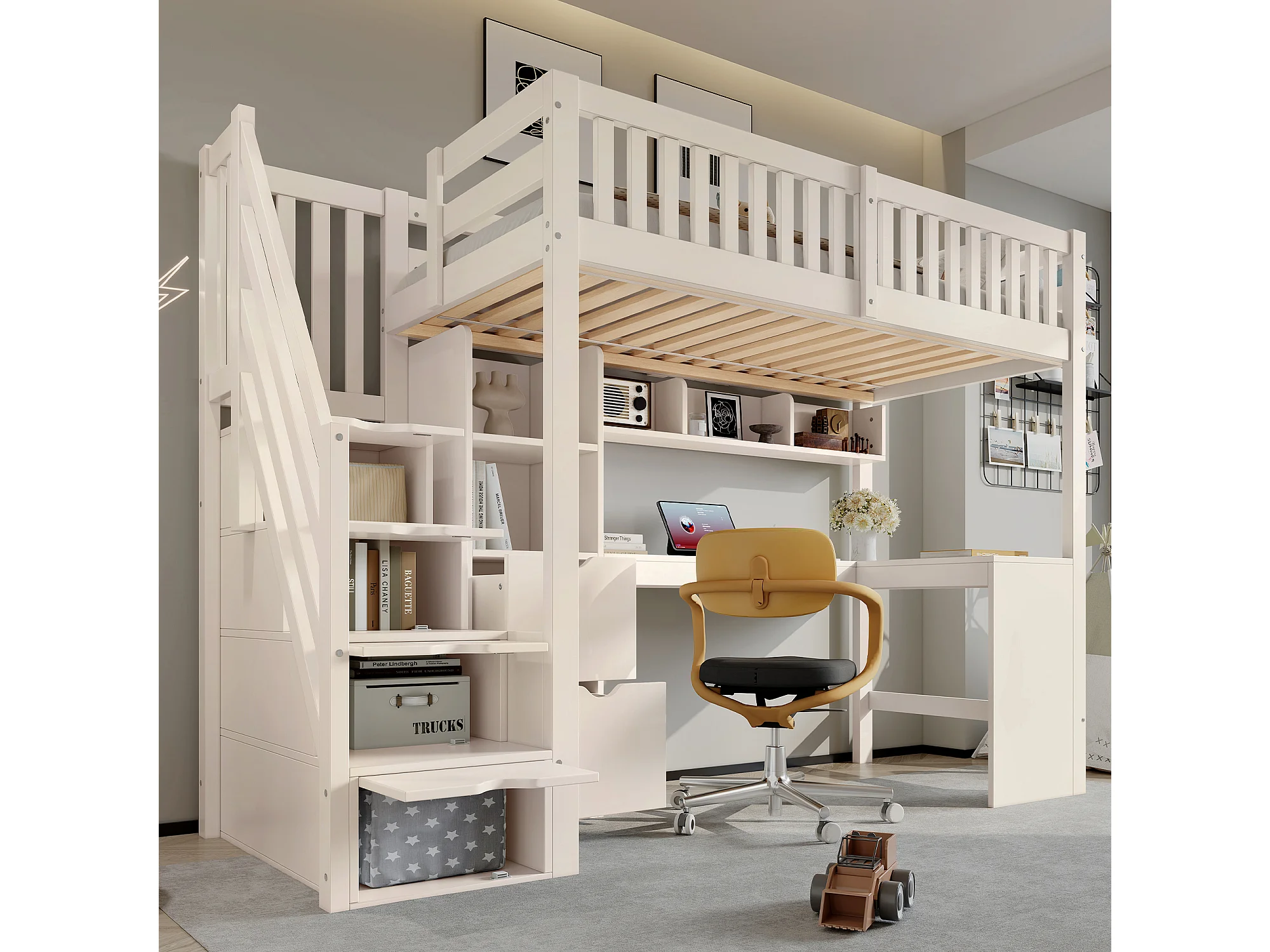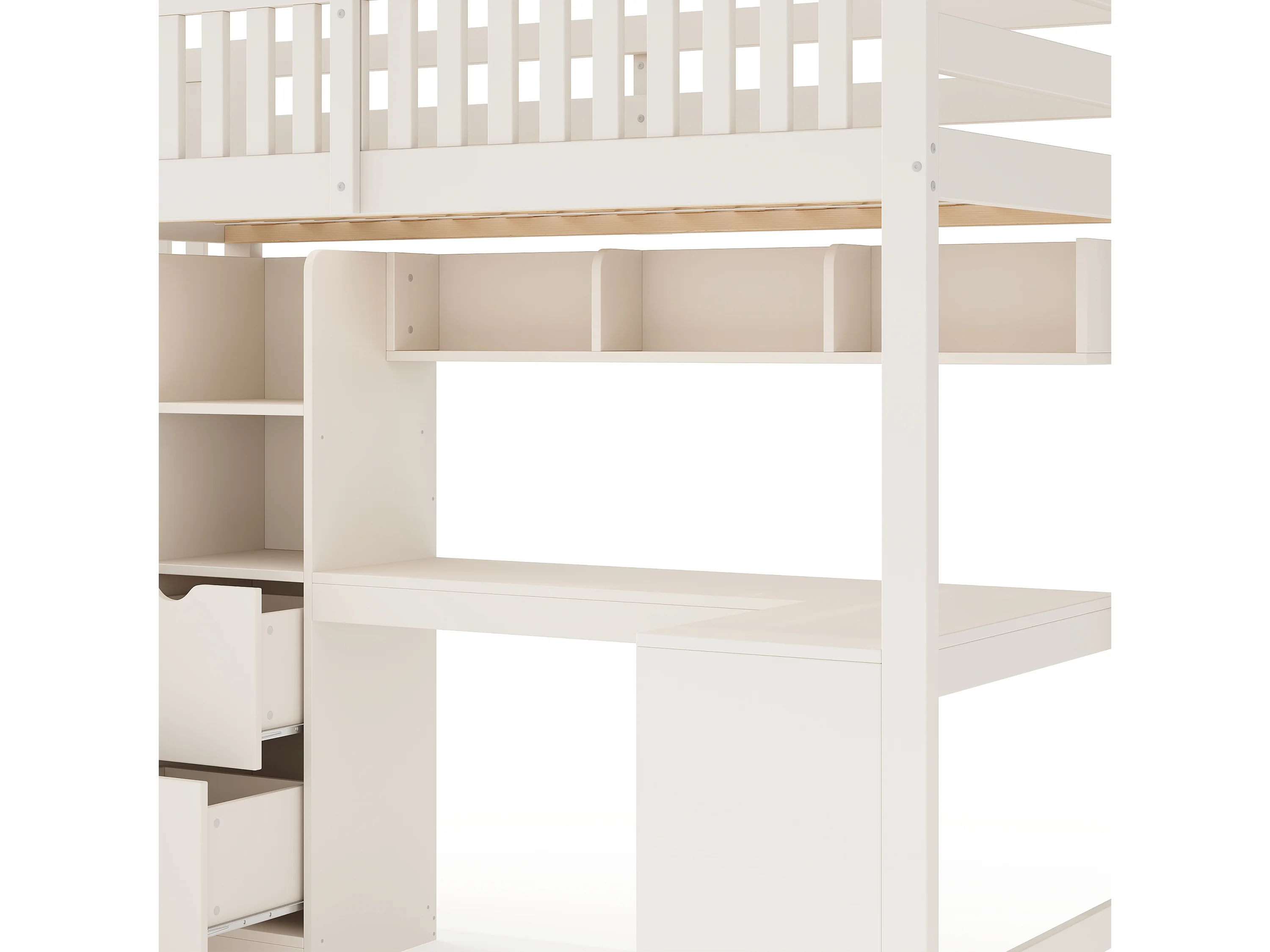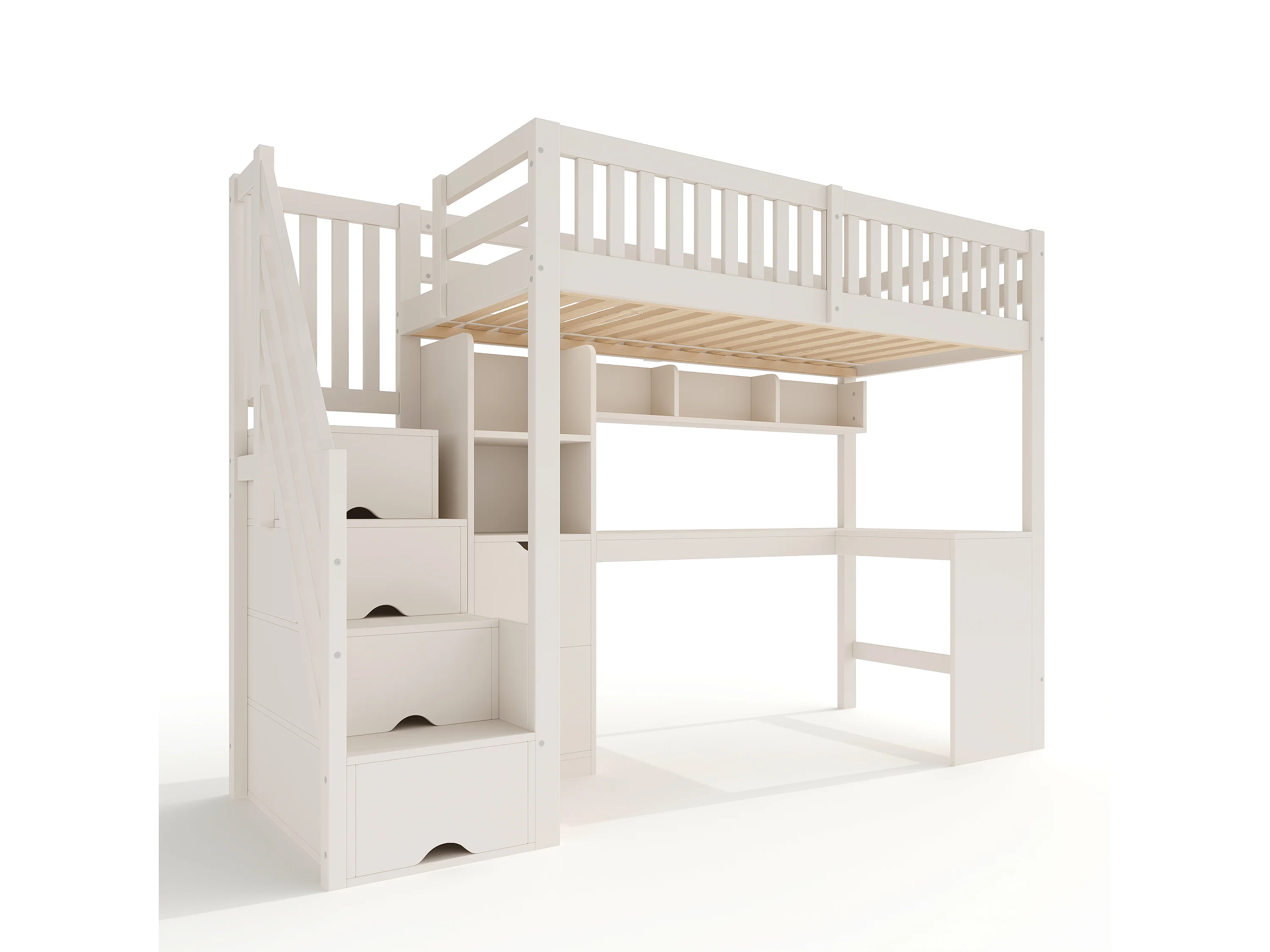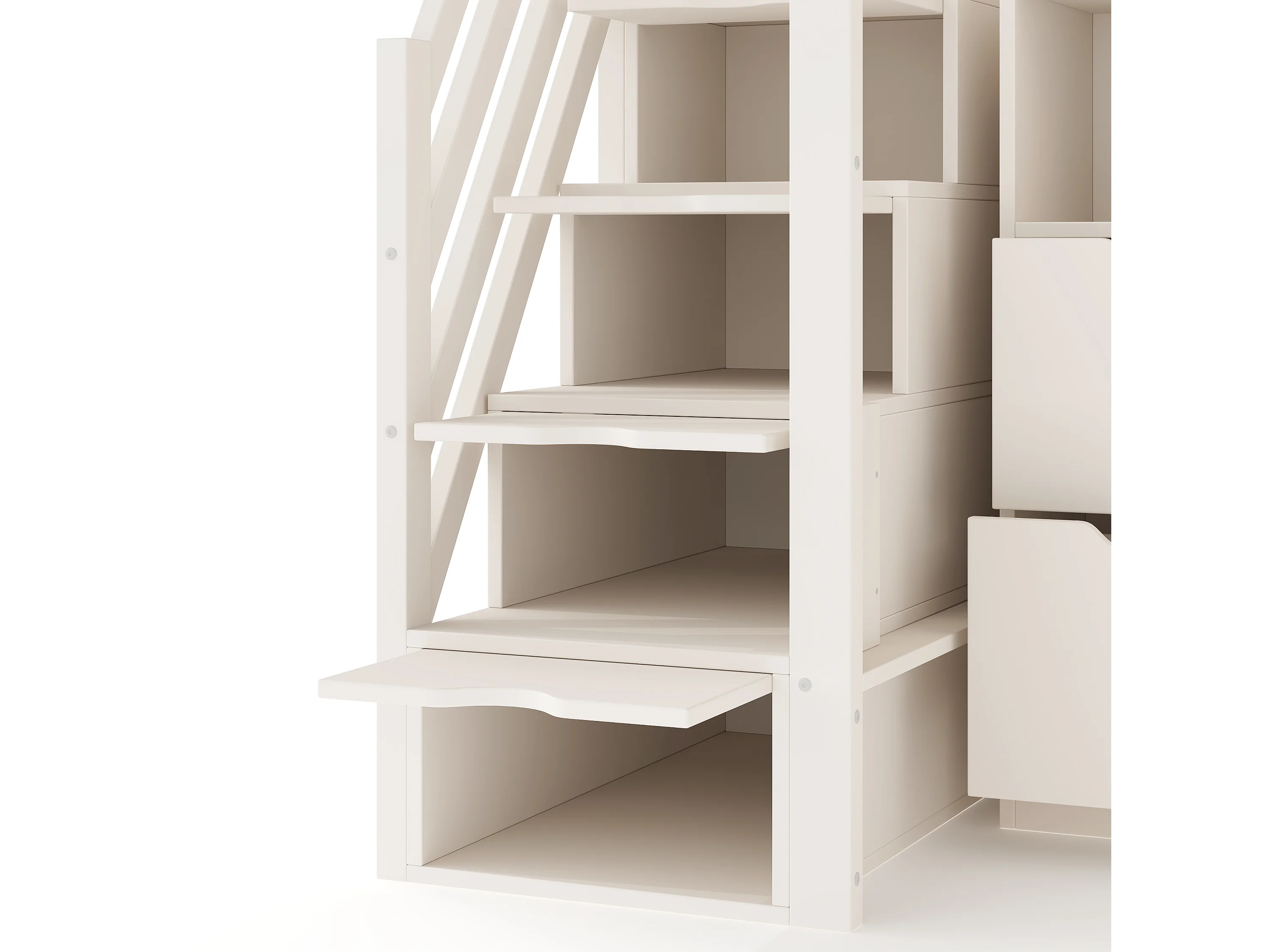 Lit mezzanine enfant 90x200 cm avec bureau d’angle, escalier de rangement et tiroirs - Blanc