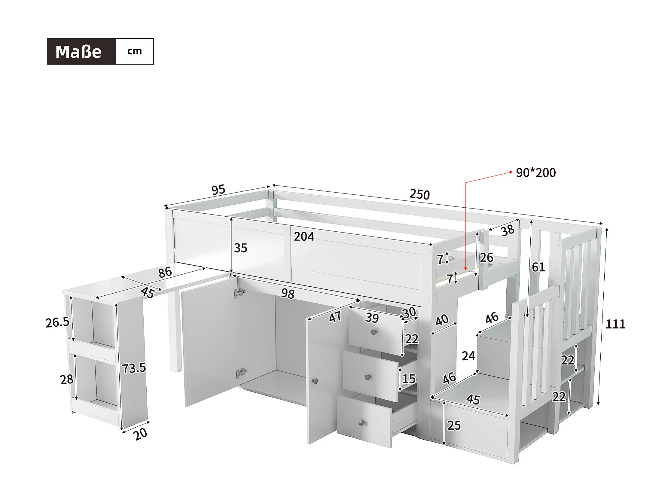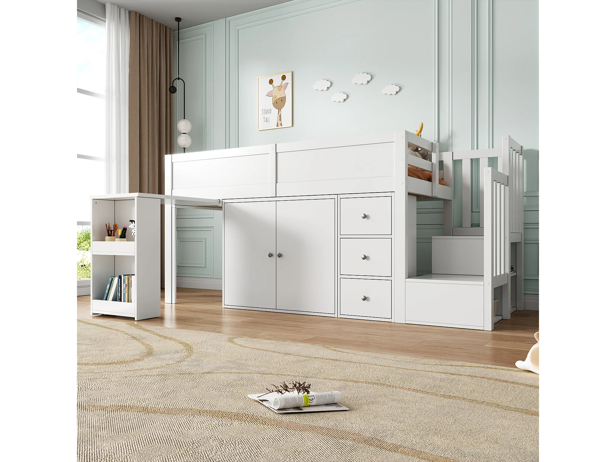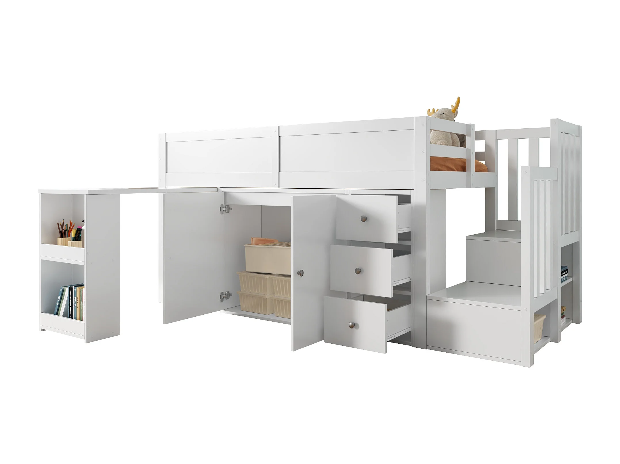 Lit mezzanine enfant 90×200 cm blanc MDF, avec bureau coulissant, armoire, tiroirs, escaliers et rangement latéral