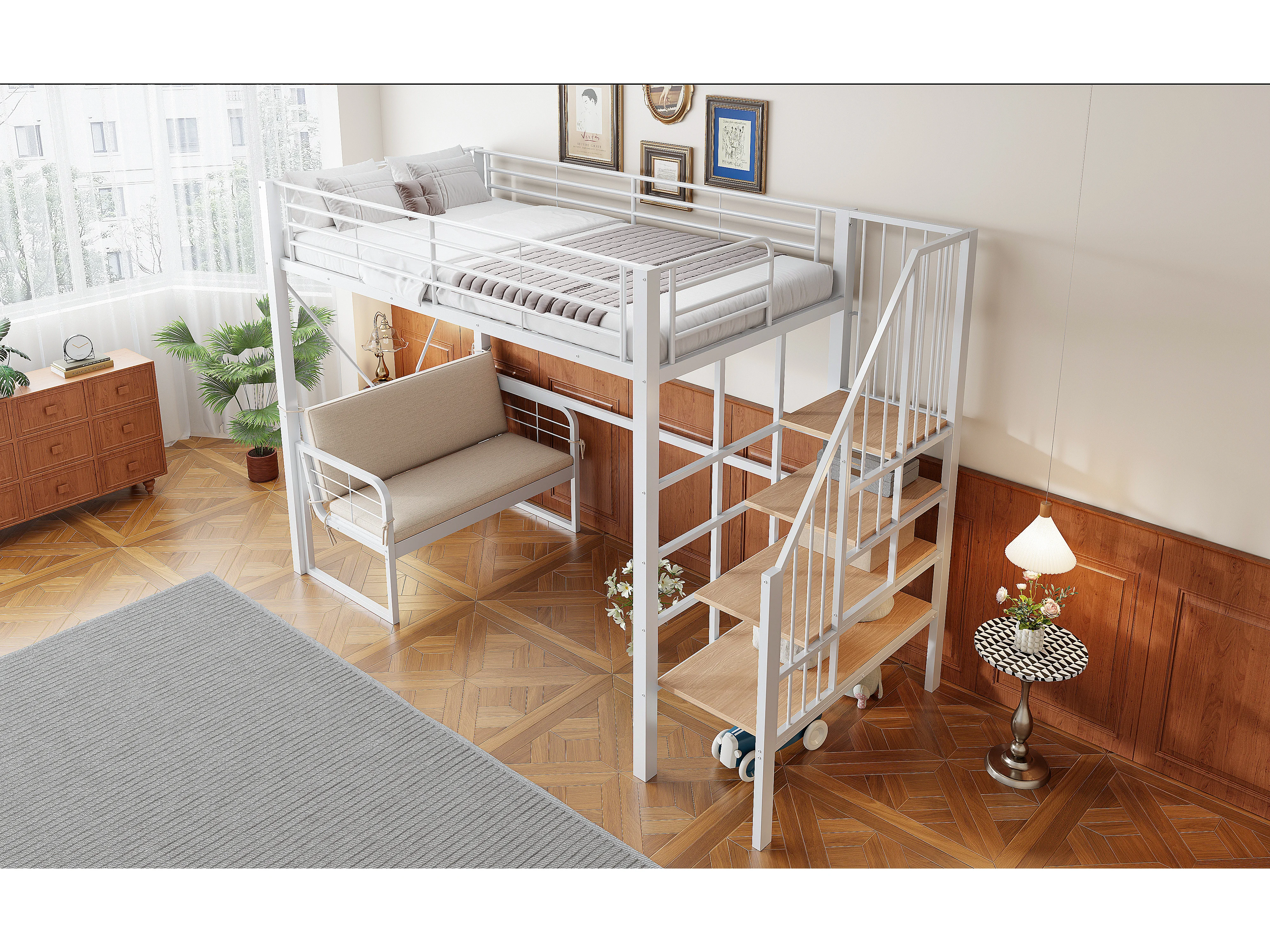 Lit mezzanine enfant 90x200 cm en métal avec canapé et rangement - Blanc