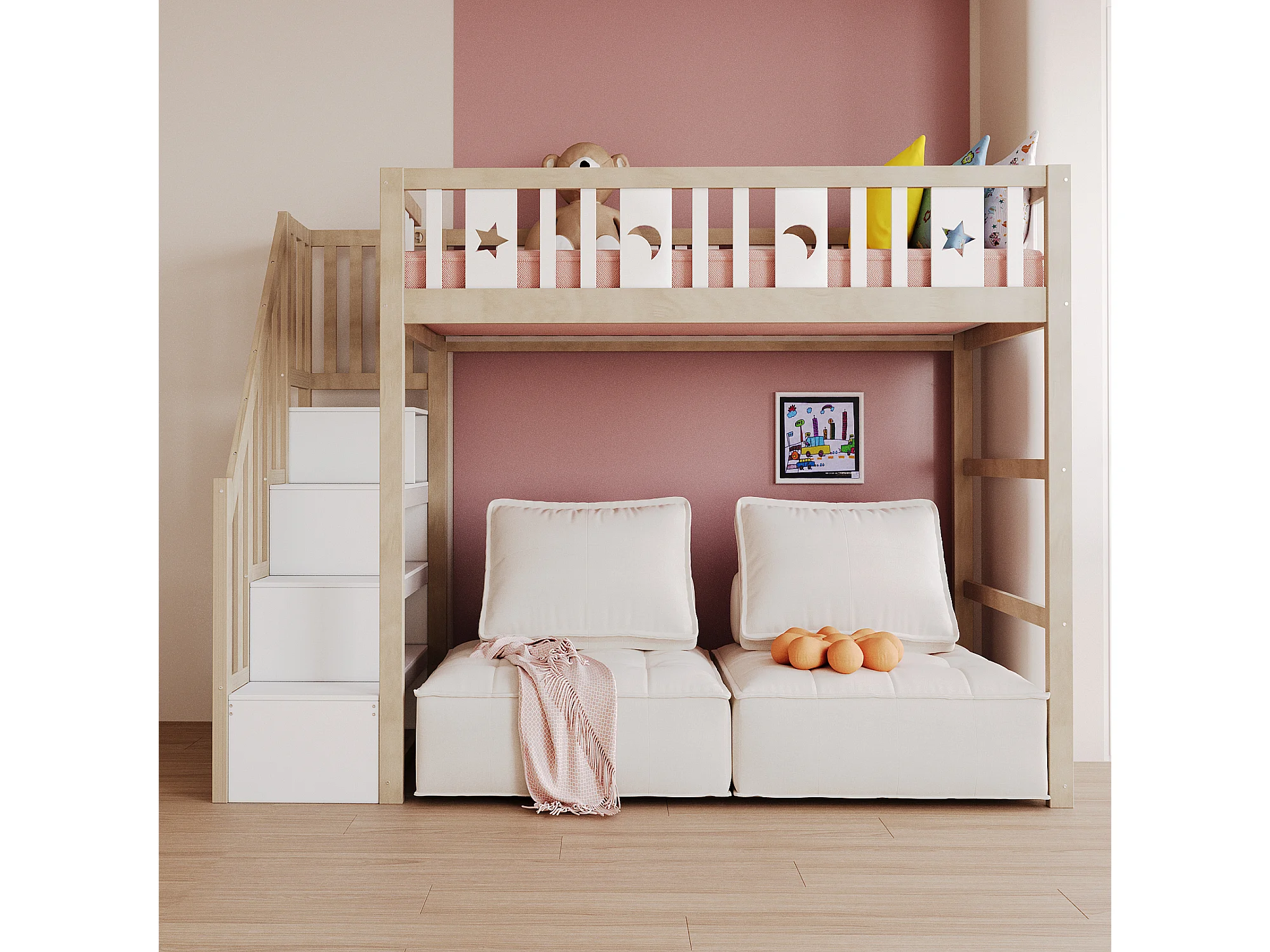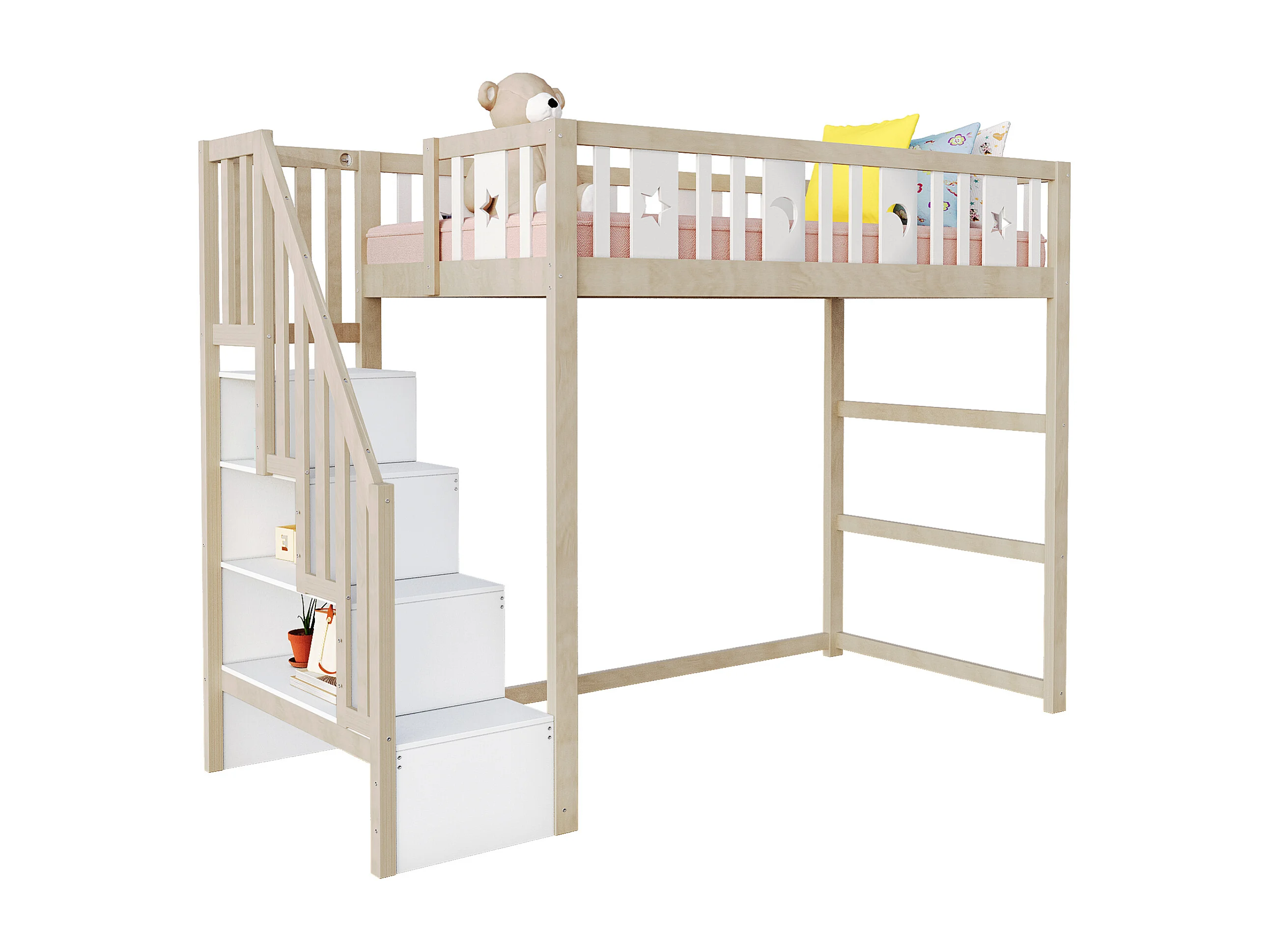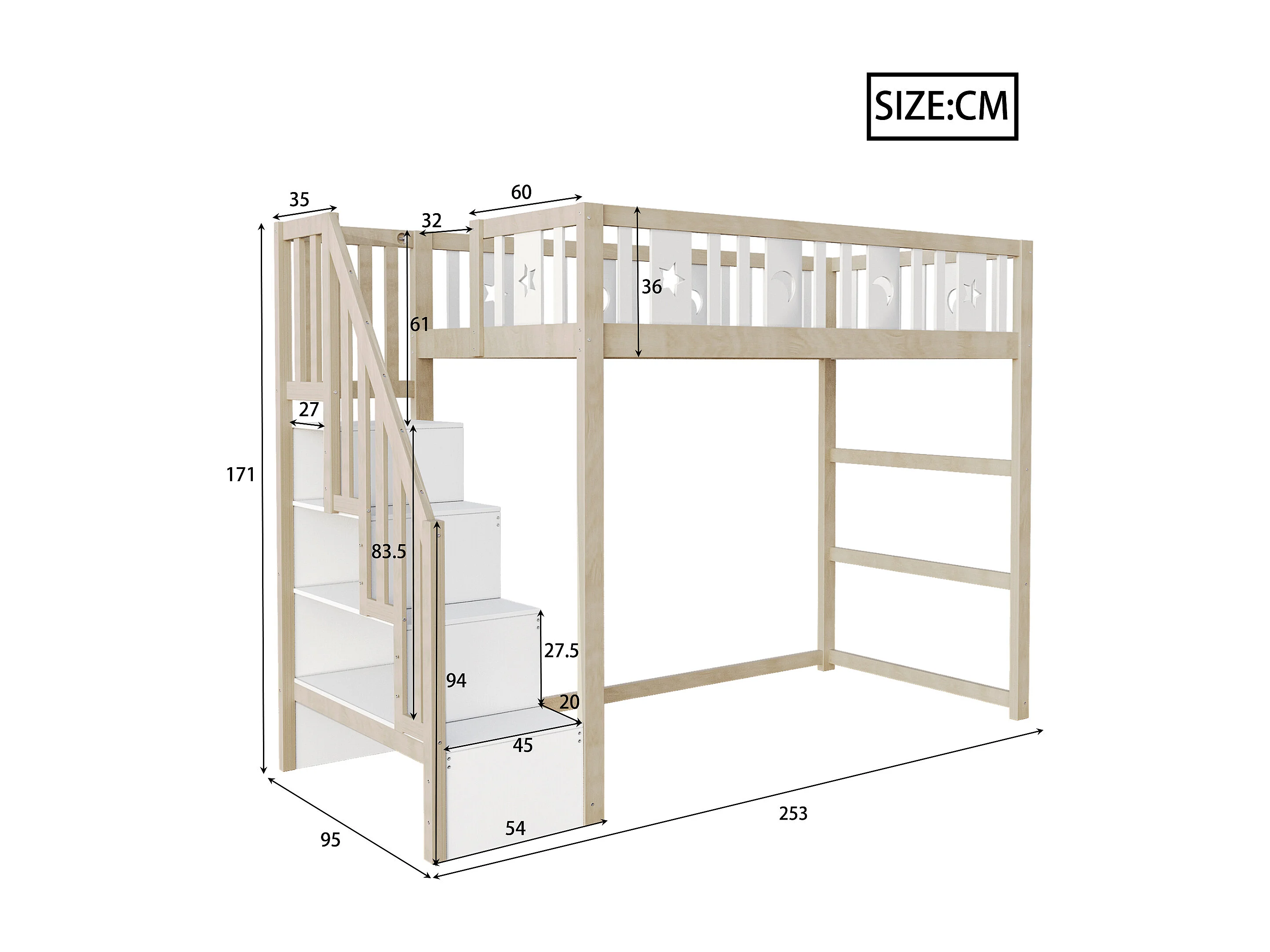 Lit mezzanine enfant 90x200cm avec échelle rangement, bois massif, barrières, déco étoiles/lune, bois/blanc (253x95x171cm)