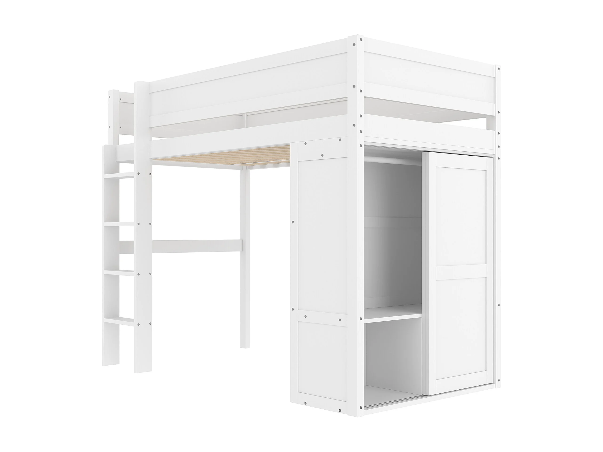 Lit mezzanine enfant 90x200cm avec escalier et penderie, Barrière de sécurité robuste, cadre en pin, blanc, sans matelas