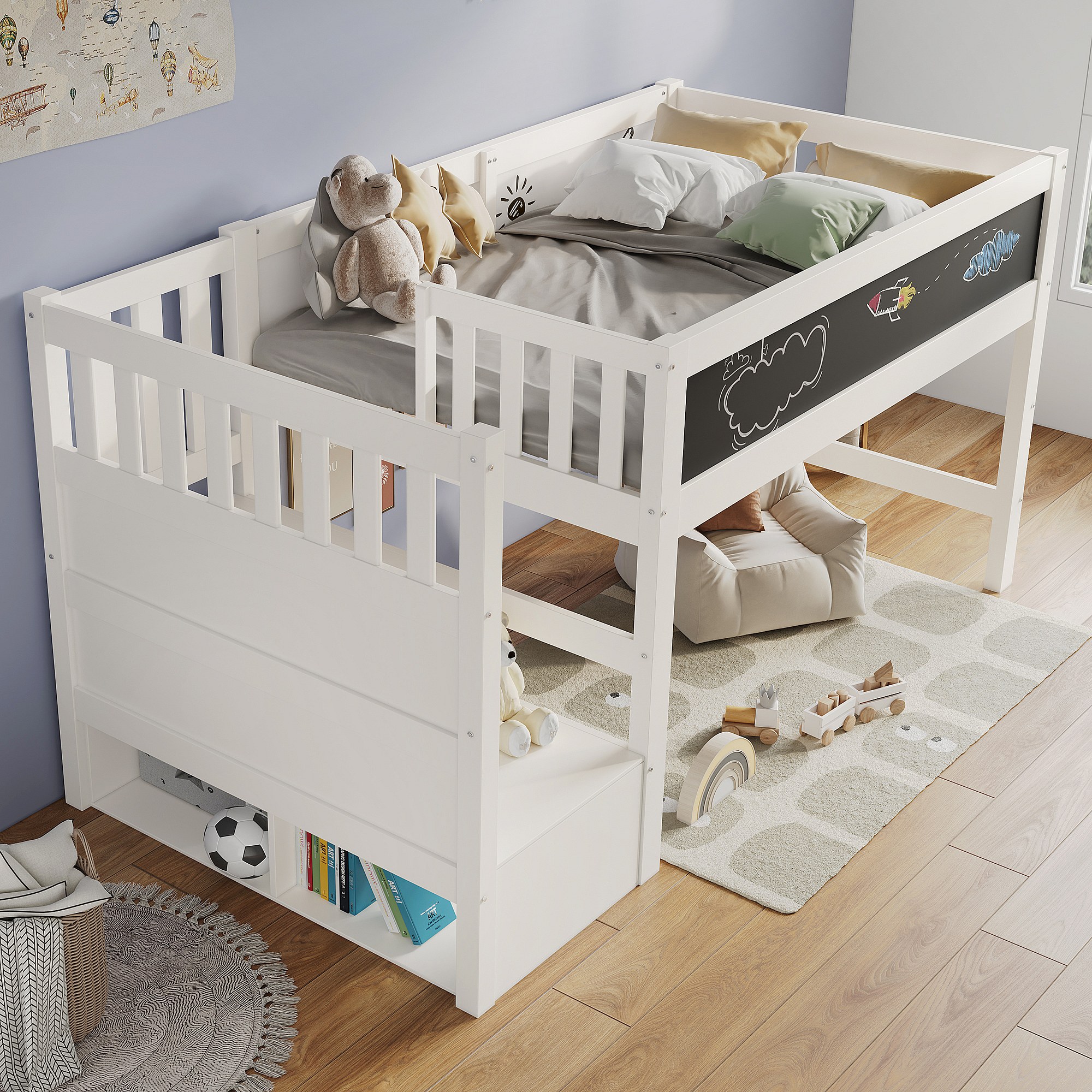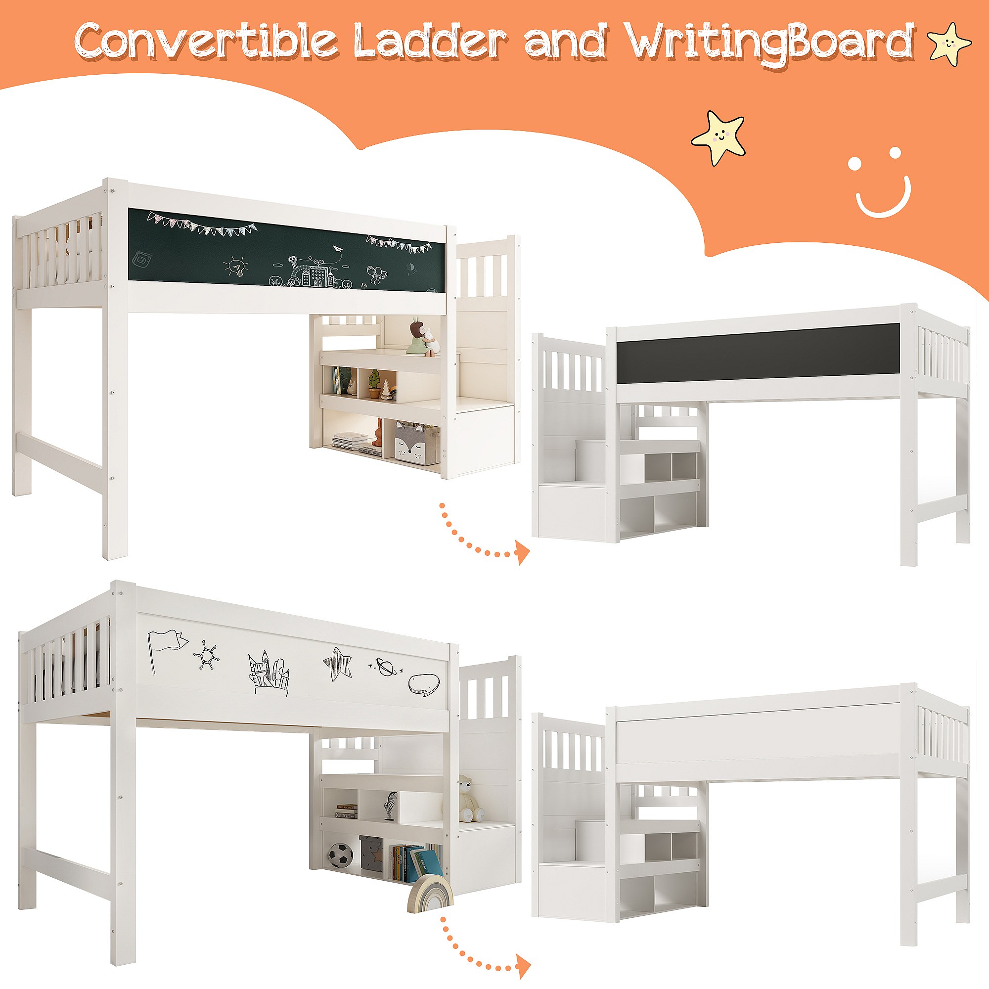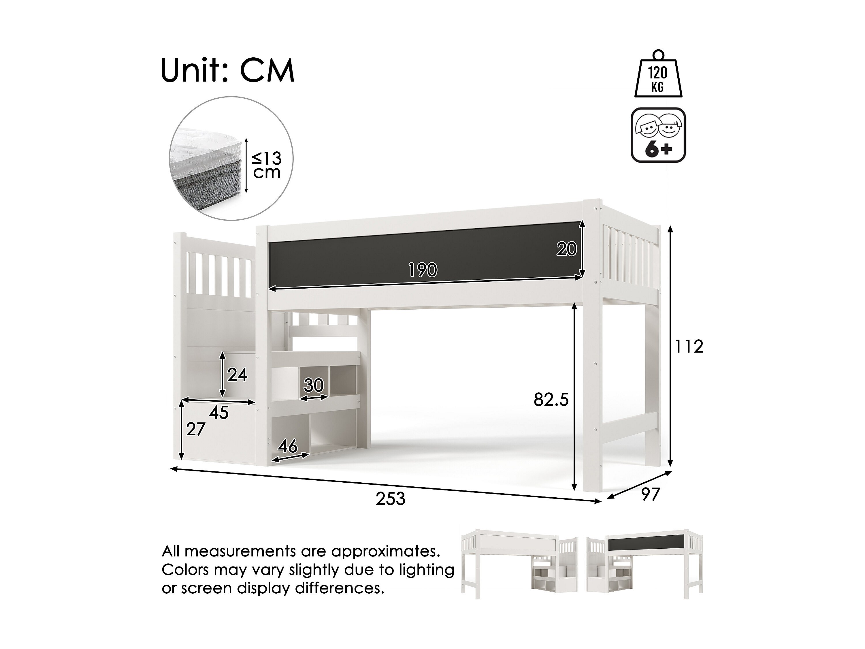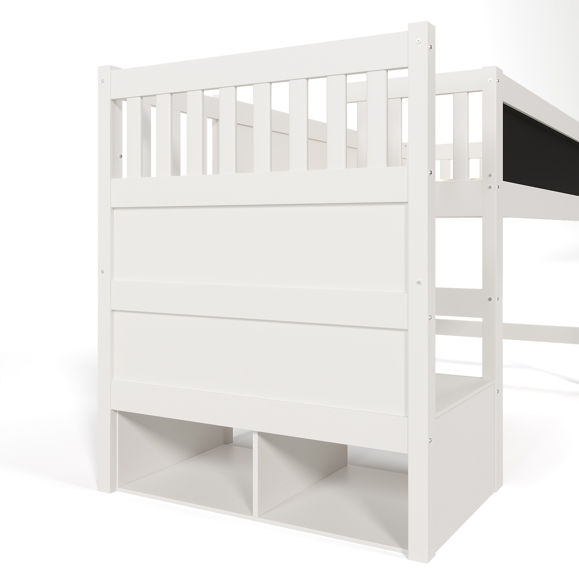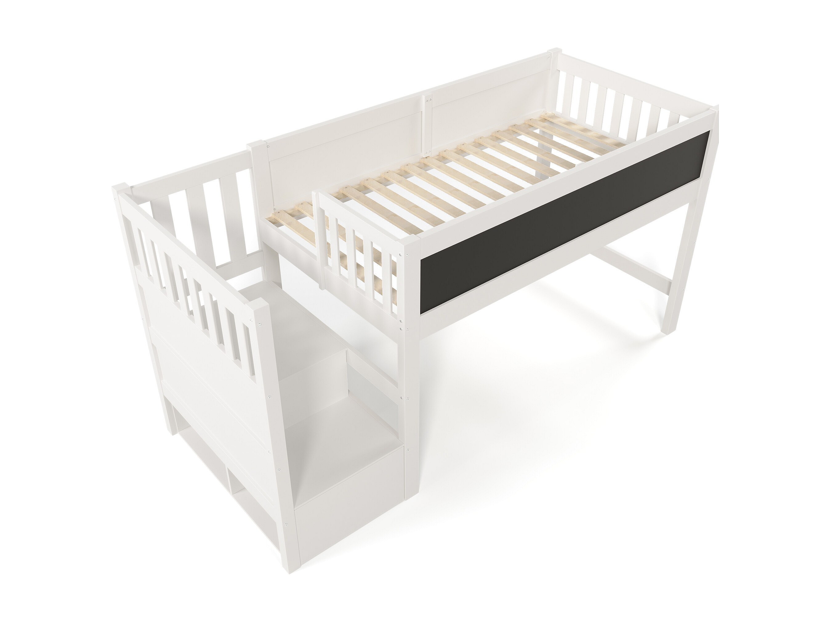 Lit mezzanine enfant blanc 90x200cm avec escalier de rangement et tablette écritoire, sans matelas