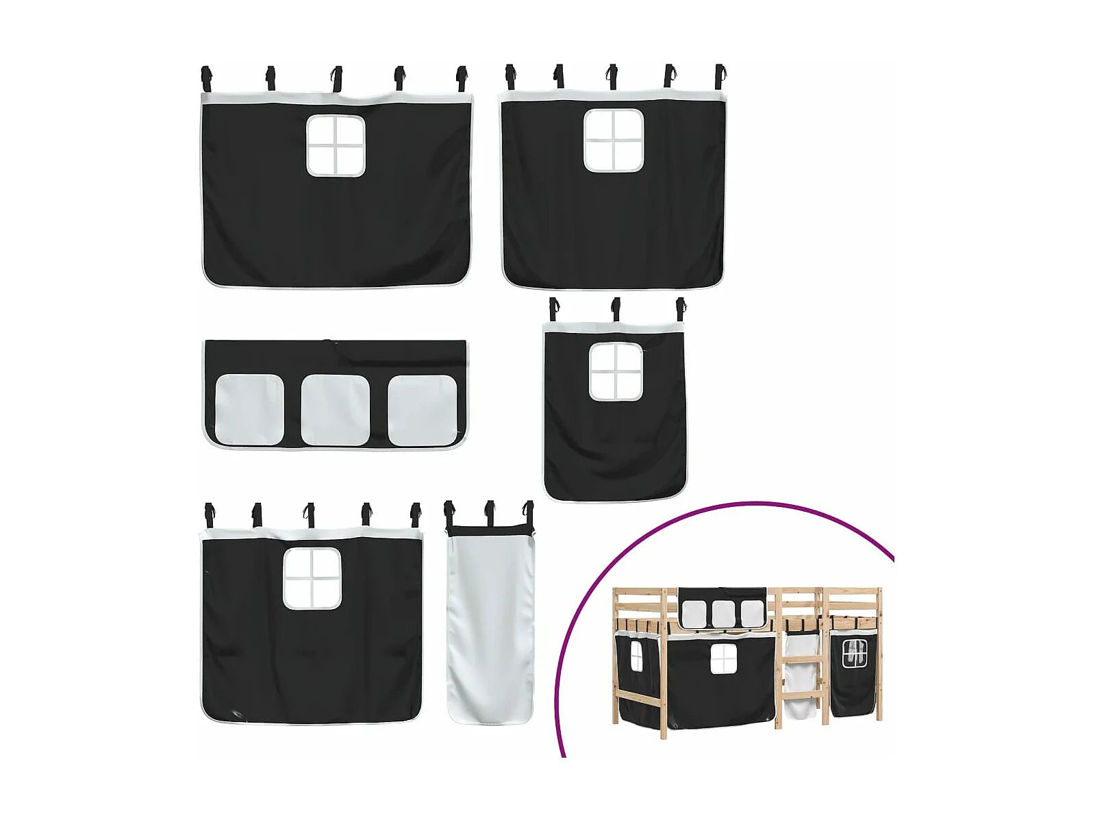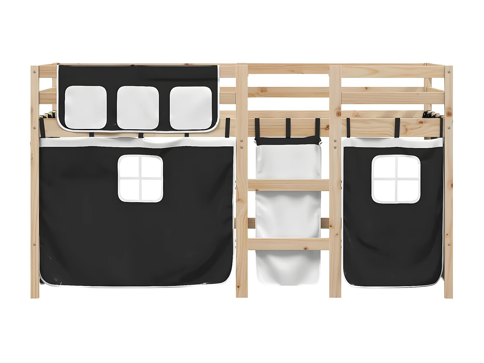 Lit mezzanine enfants et rideaux blanc/noir 90x190cm pin massif