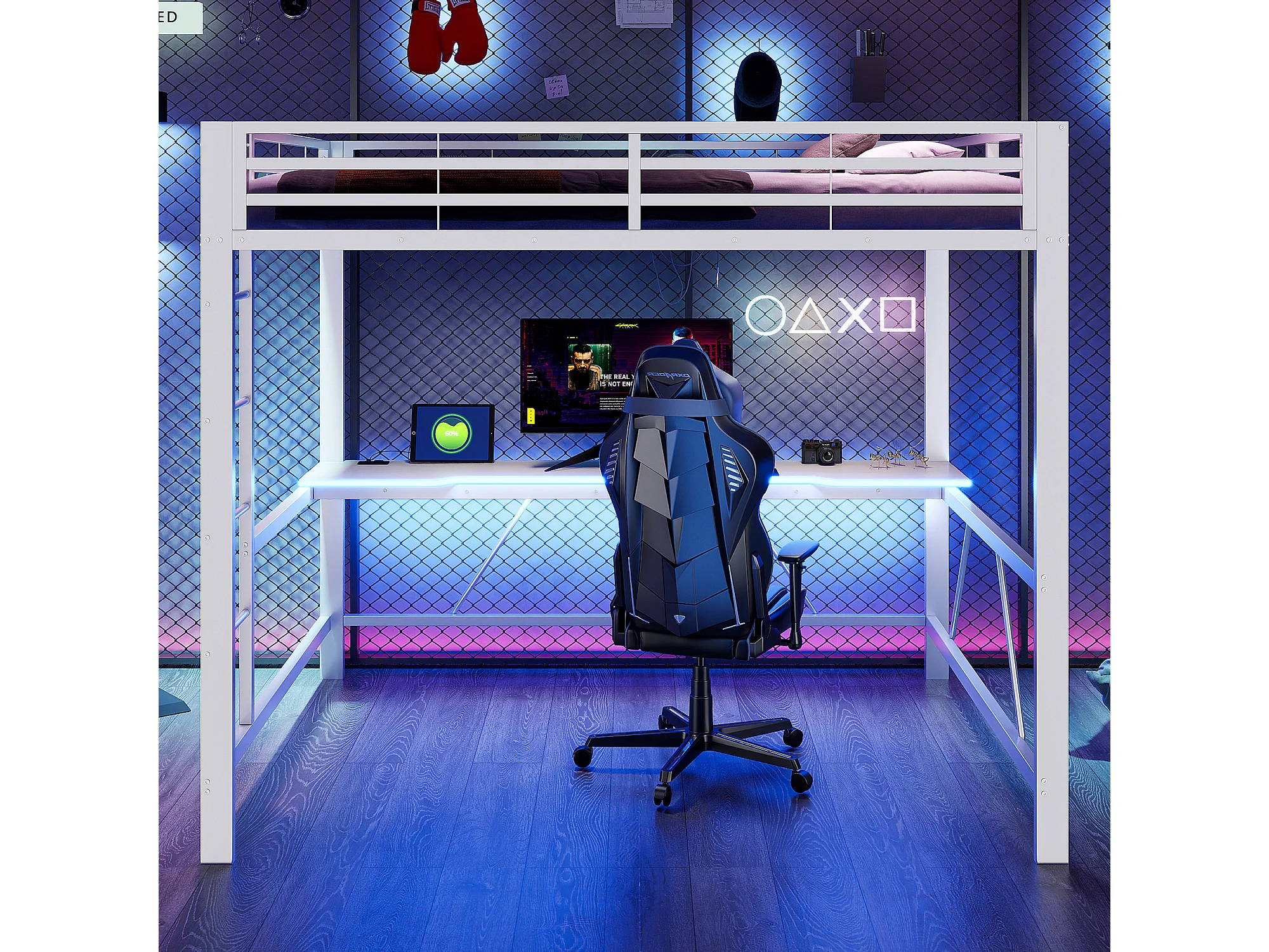 Lit mezzanine gaming en métal pour enfant - 160 x 200 cm - avec Leds + USB + bureau - blanc