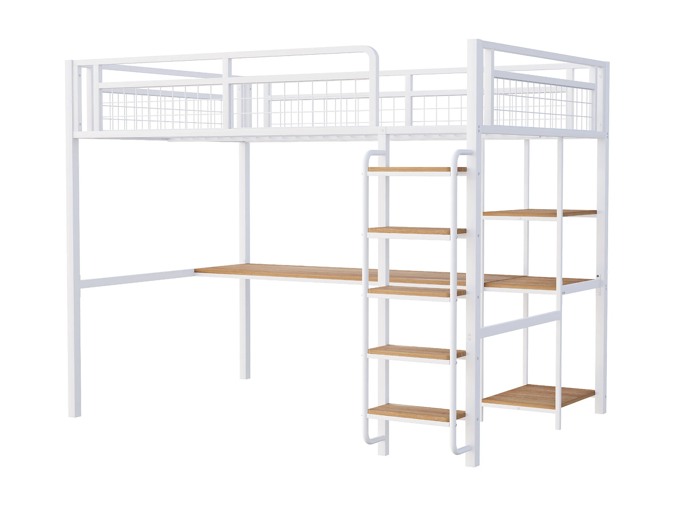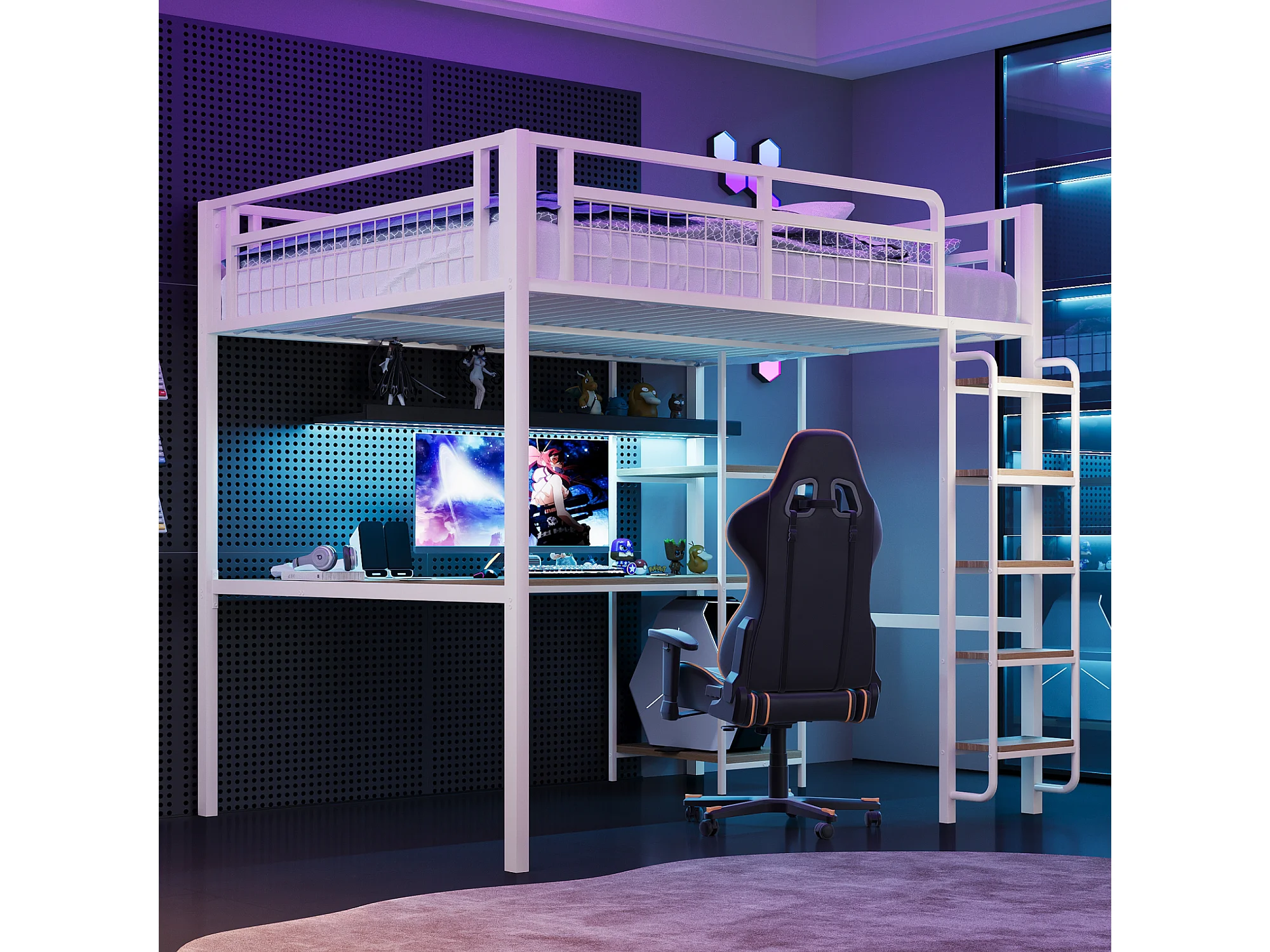 Lit mezzanine métallique avec échelle sécurisée, table et étagère, blanc (140x200x182.5cm)
