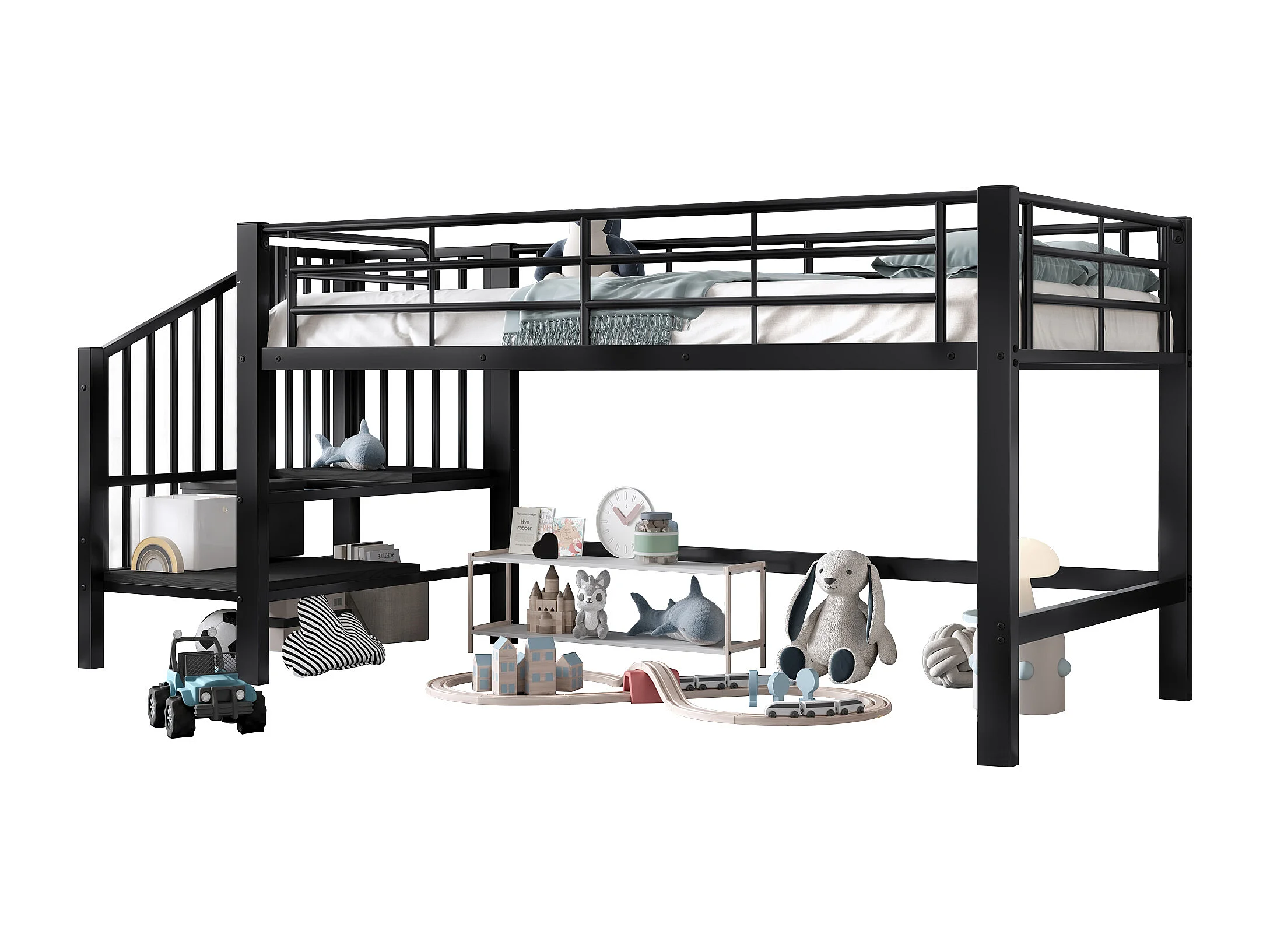 Lit mezzanine mi-hauteur en métal - 90 x 200 - avec escalier de rangement - MDF + métal - noir