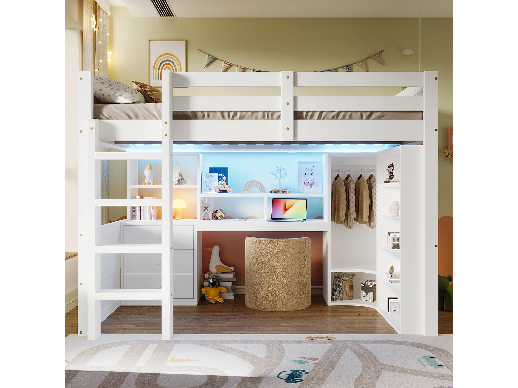 Lit mezzanine pour enfant - 140 x 200 cm - avec Leds + armoire + bureau + tiroirs + étagère de rangement - bois - blanc
