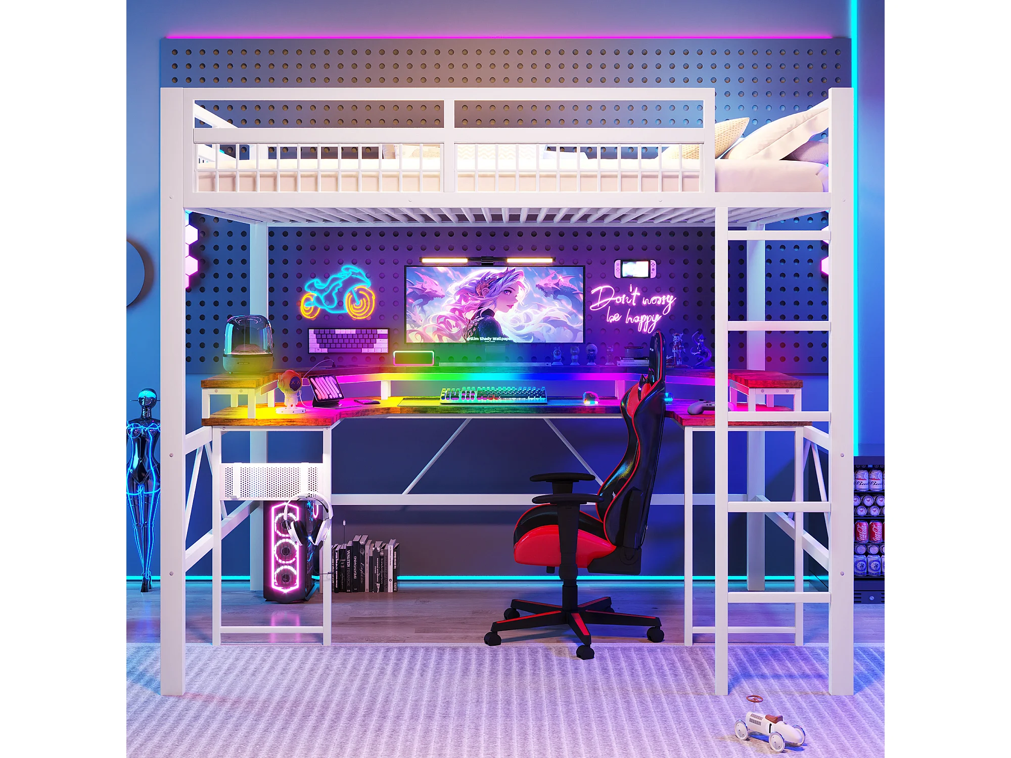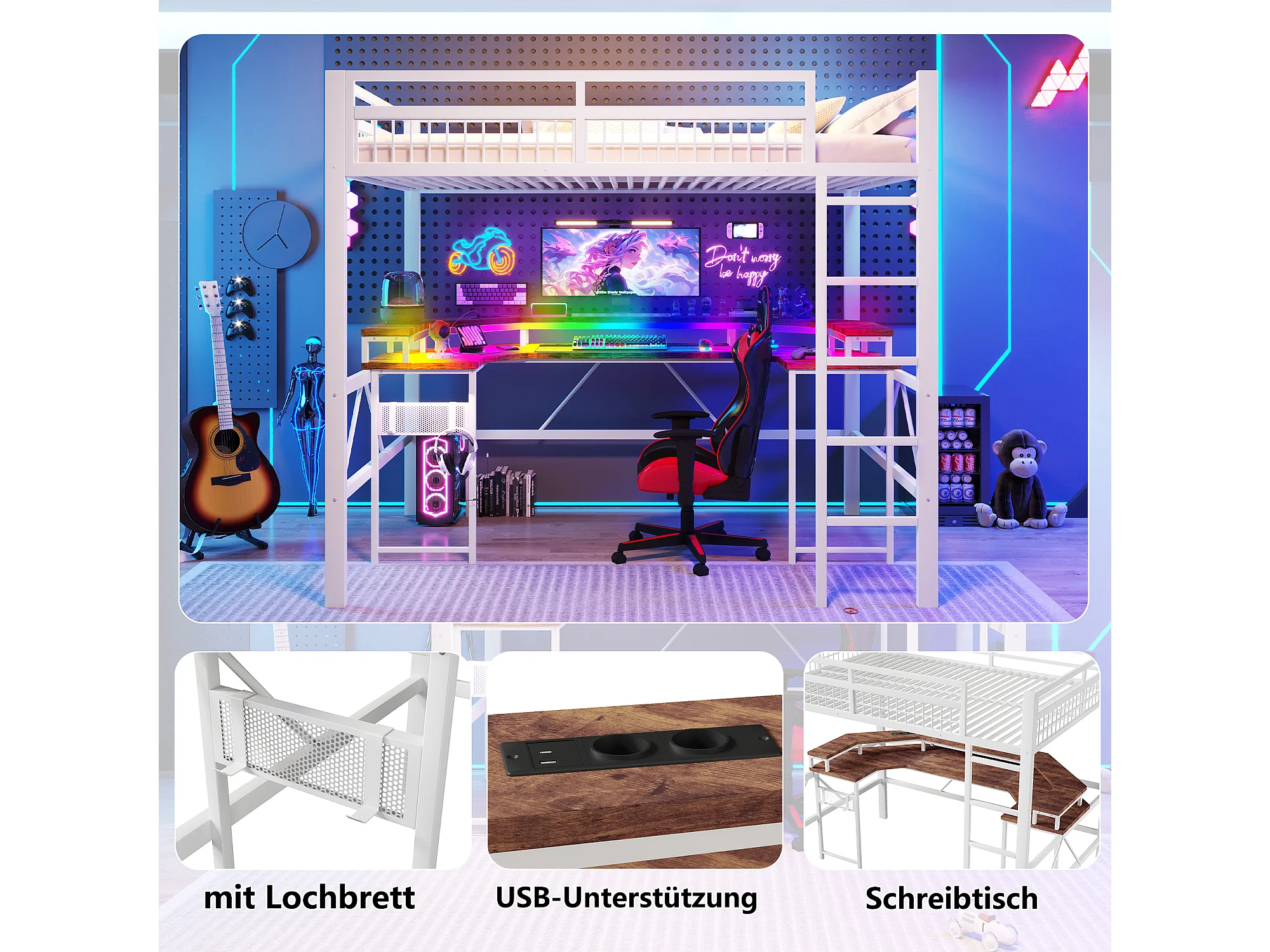 Lit mezzanine pour enfant - 140 x 200 cm - structure en fer - avec Leds + bureau + USB + prise - métal - blanc