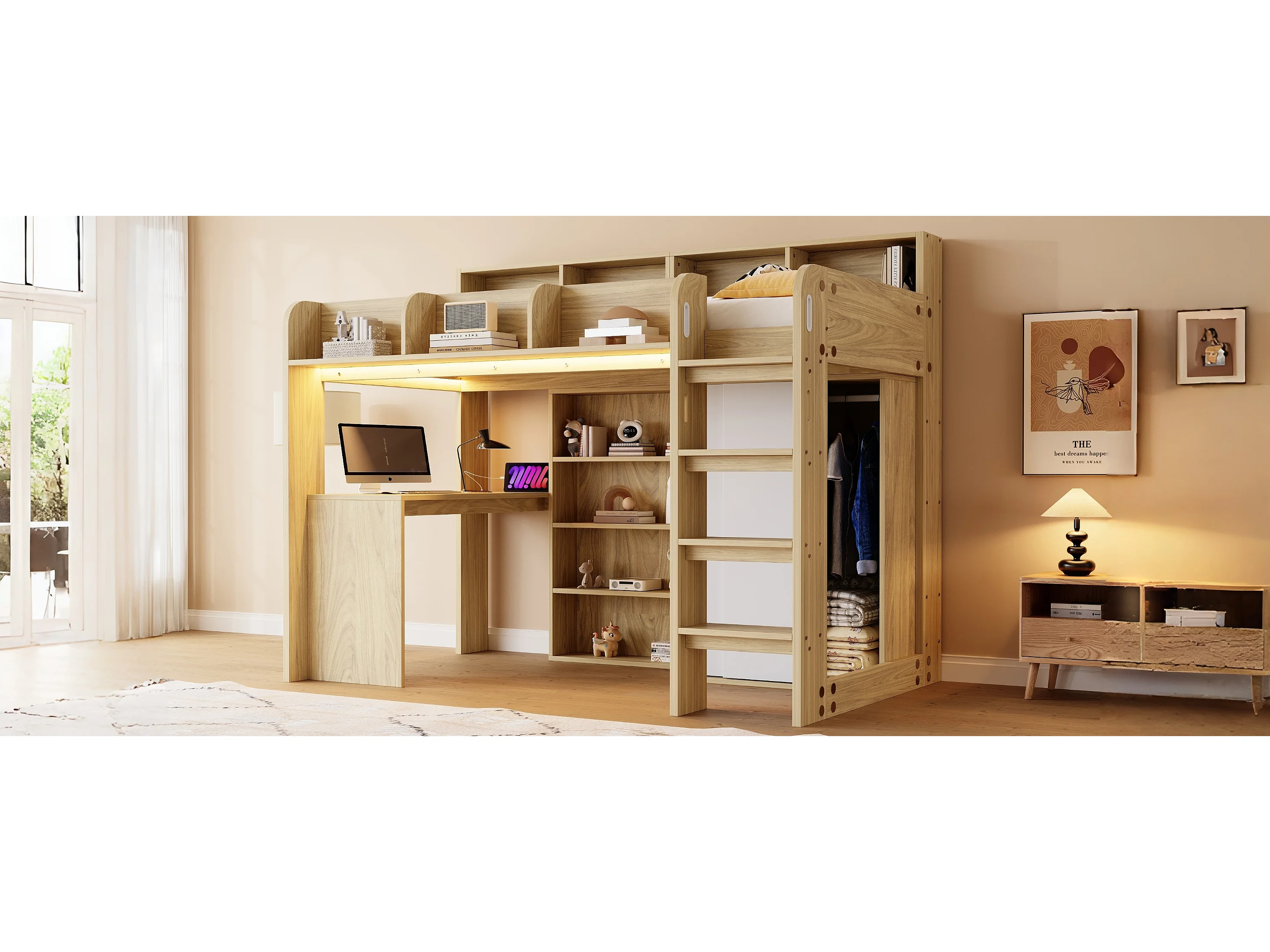 Lit mezzanine pour enfant - 90 x 200 cm - avec bureau + armoire + meuble de rangement + Leds - MDF + aggloméré - naturel