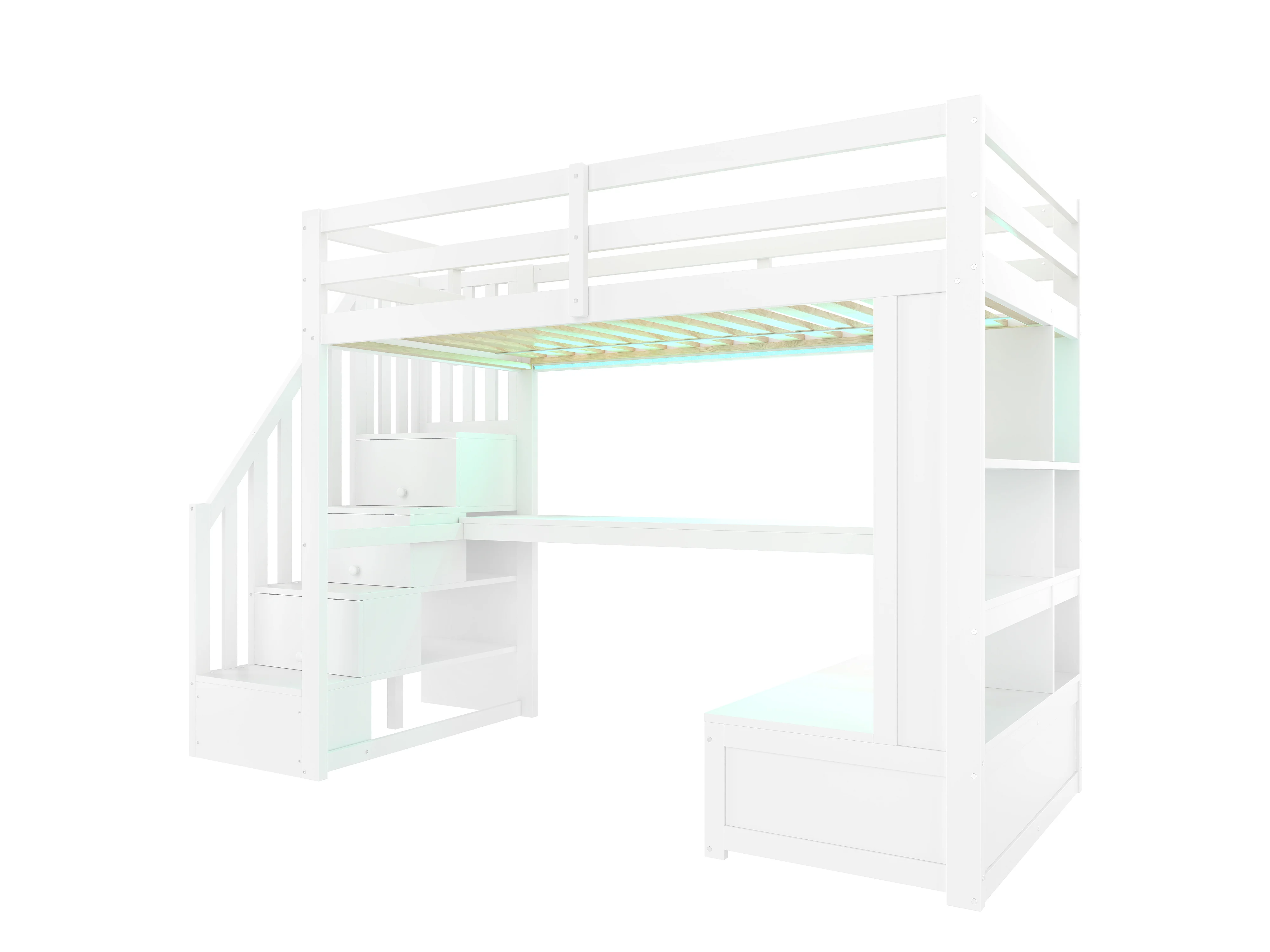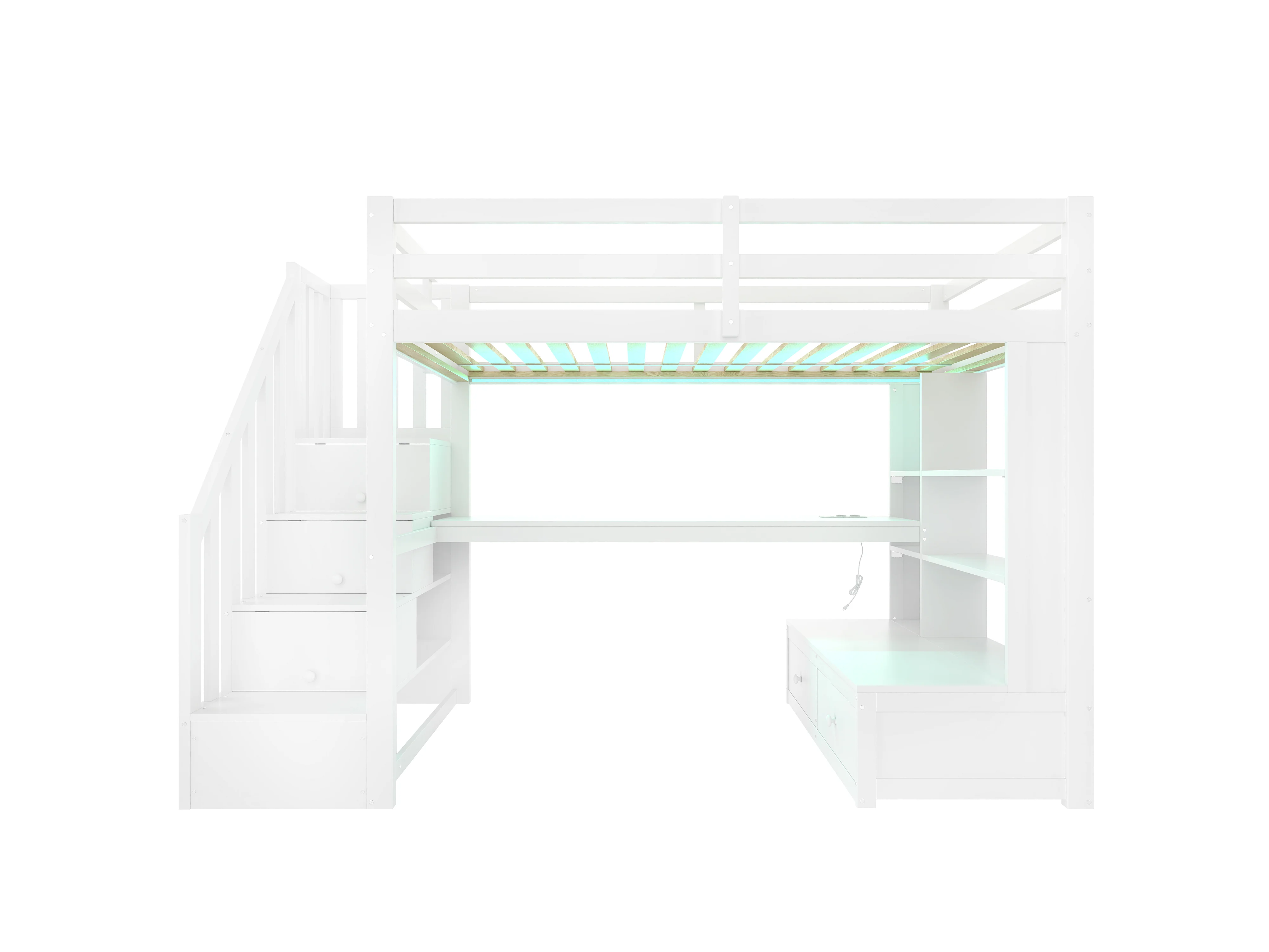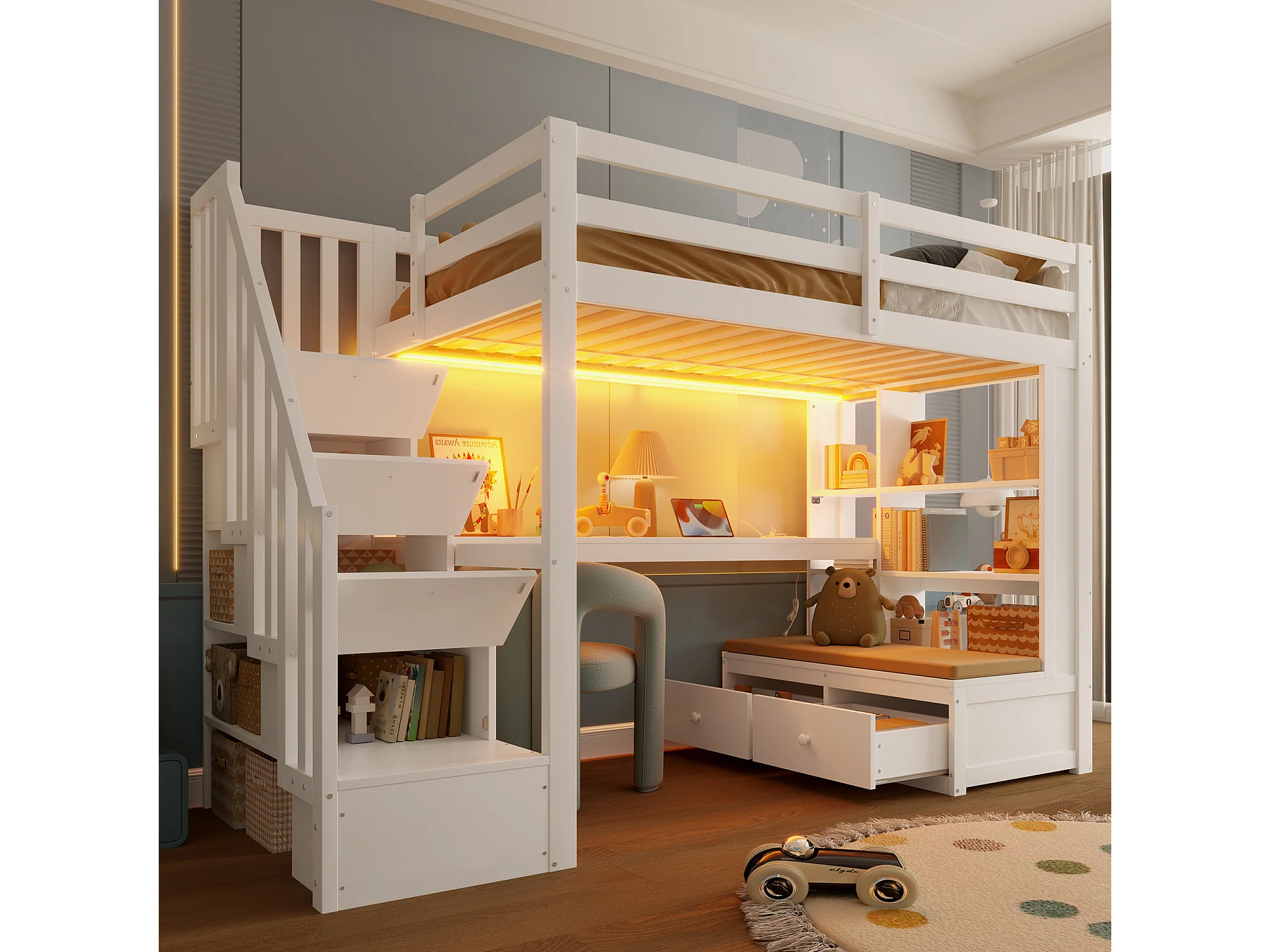 Lit mezzanine pour enfant - 90 x 200 cm - avec bureau + étagères + 2 tiroirs + escalier de rangement - MDF + bois - blanc