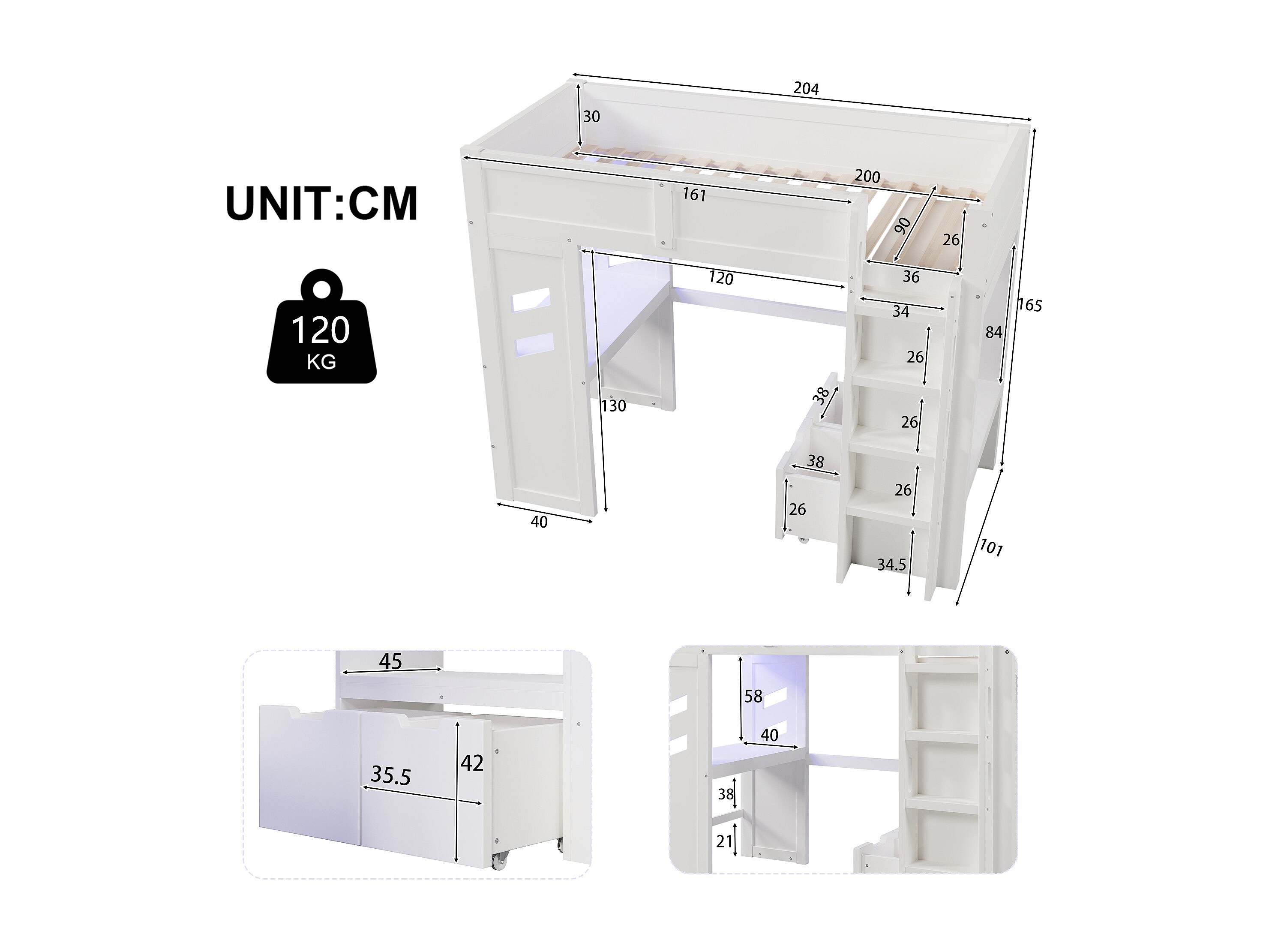 Lit mezzanine pour enfant - 90 x 200 cm - avec bureau + Leds + port USB + 2 tiroirs - bois - blanc