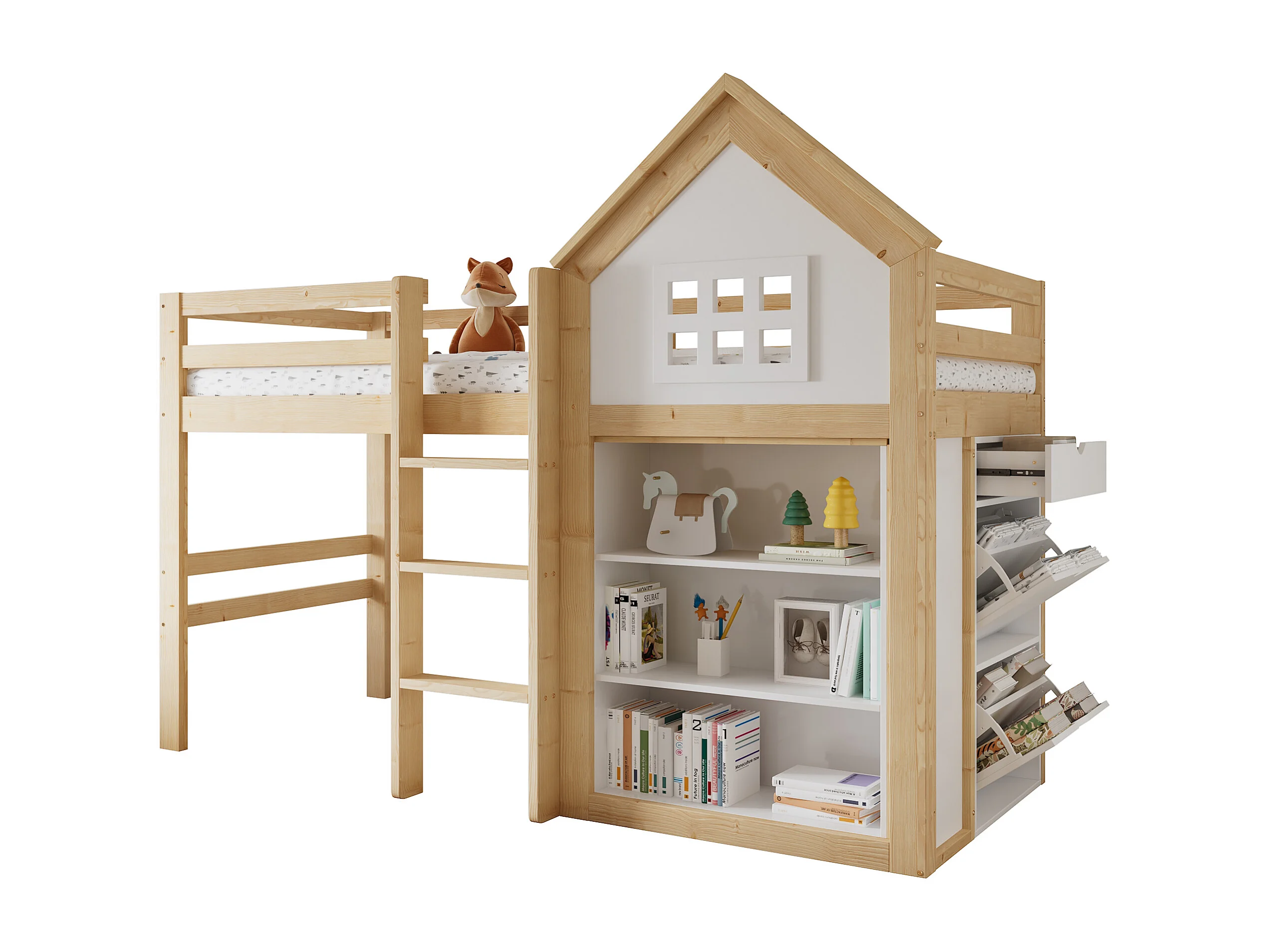 Lit mezzanine pour enfant - 90 x 200 cm - avec étagère de rangements + tiroirs + barrière - pin + MDF - blanc + naturel