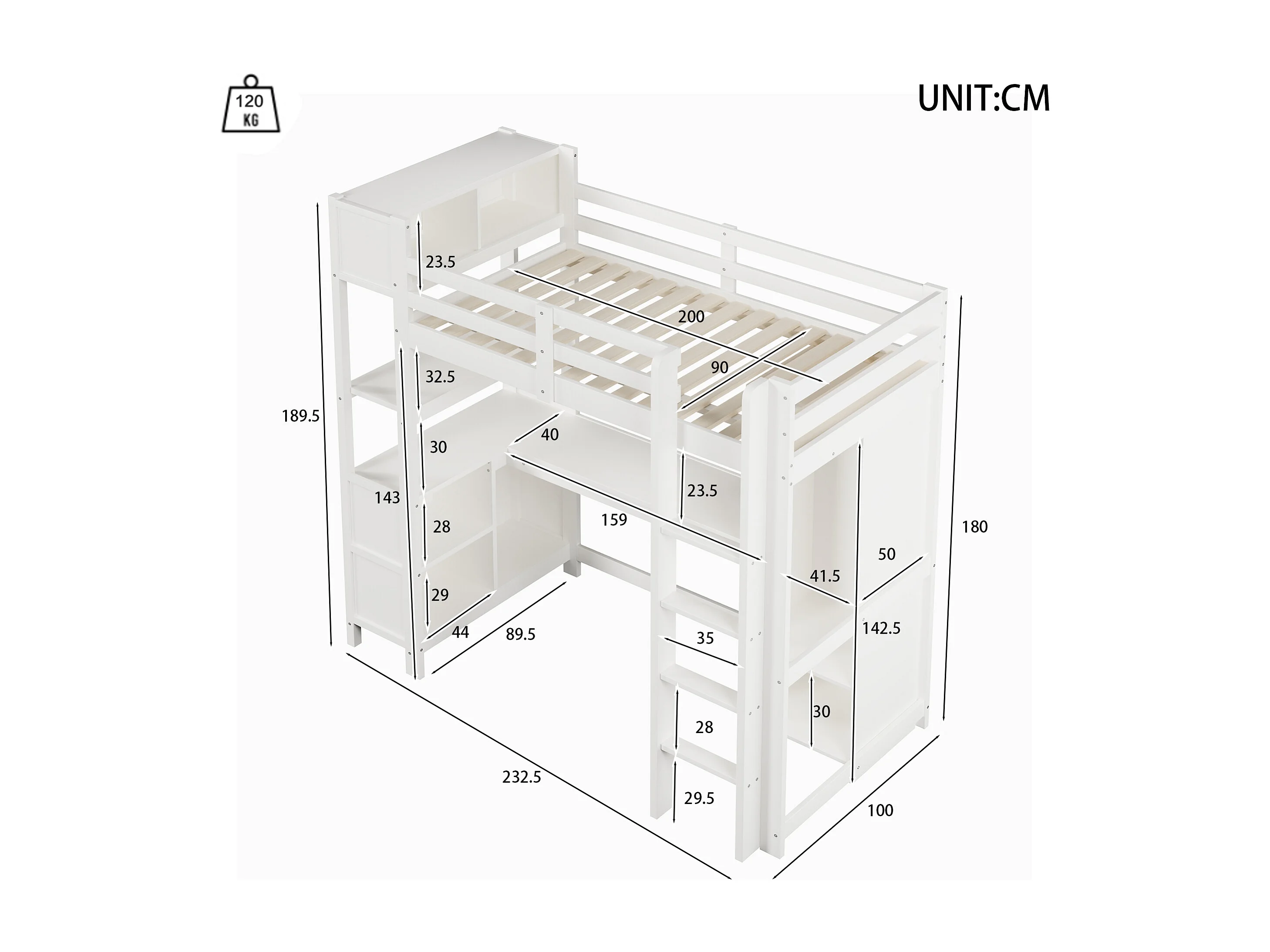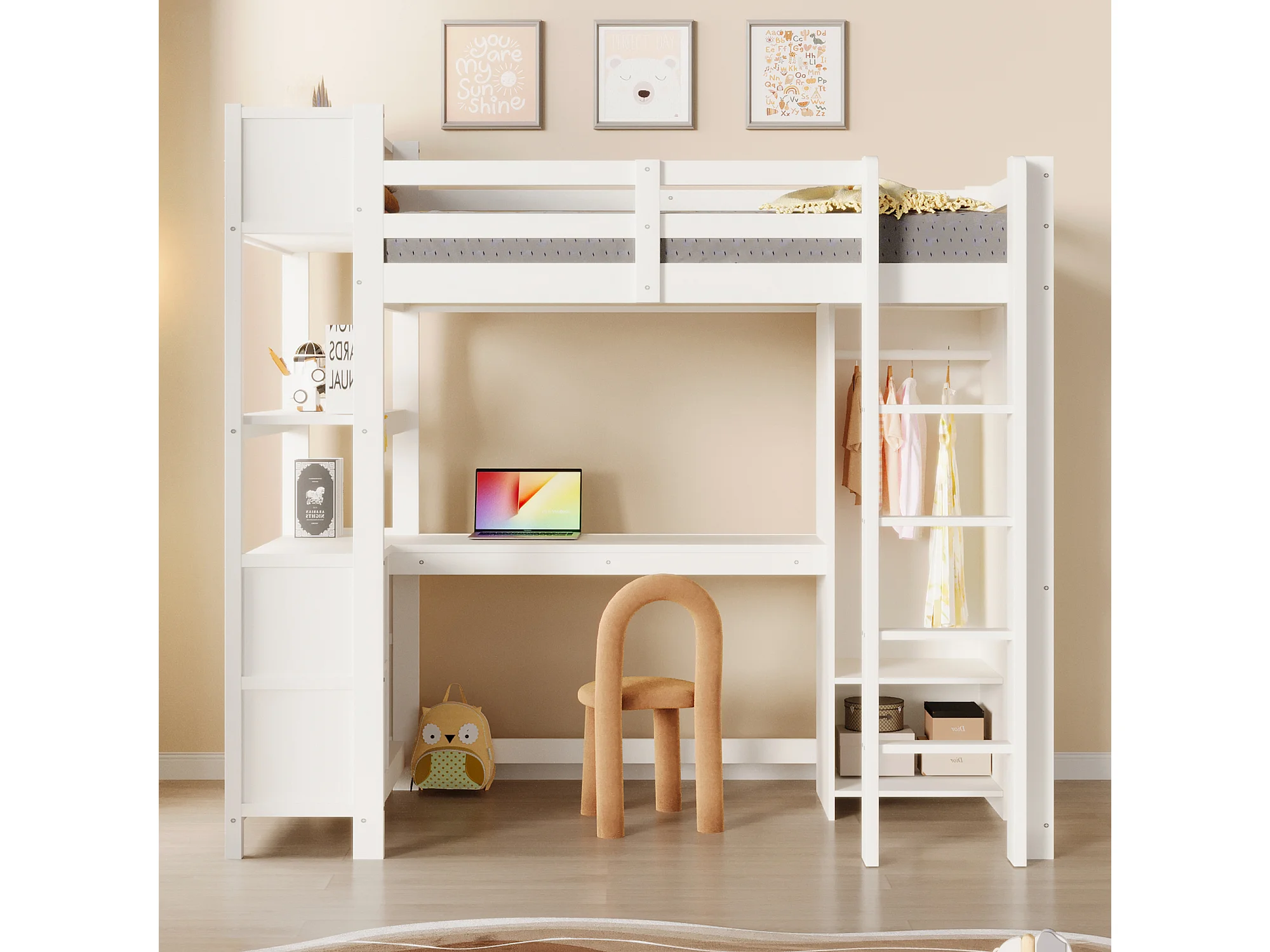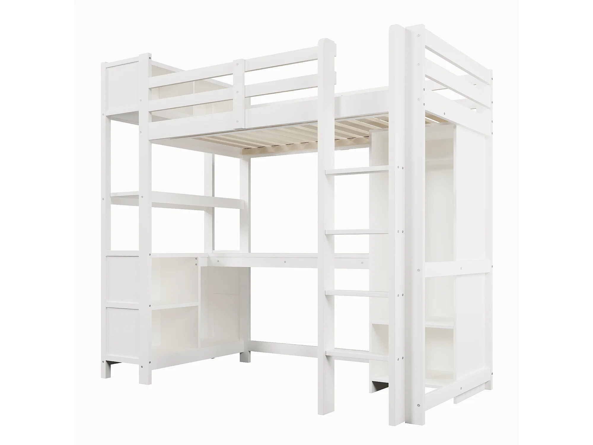 Lit mezzanine pour enfant - 90 x 200 cm - avec étagères de rangement + bureau + armoire - bois - blanc