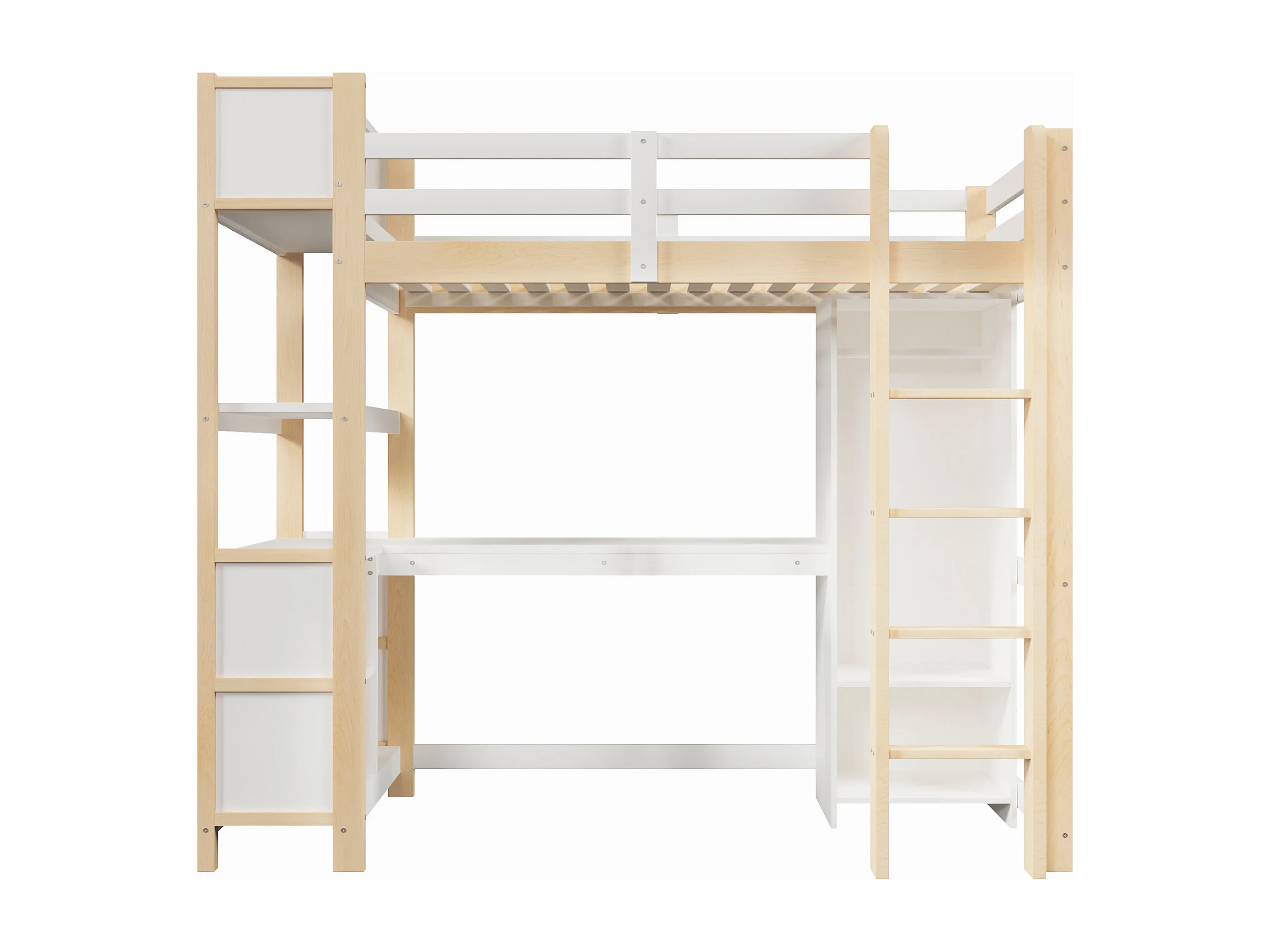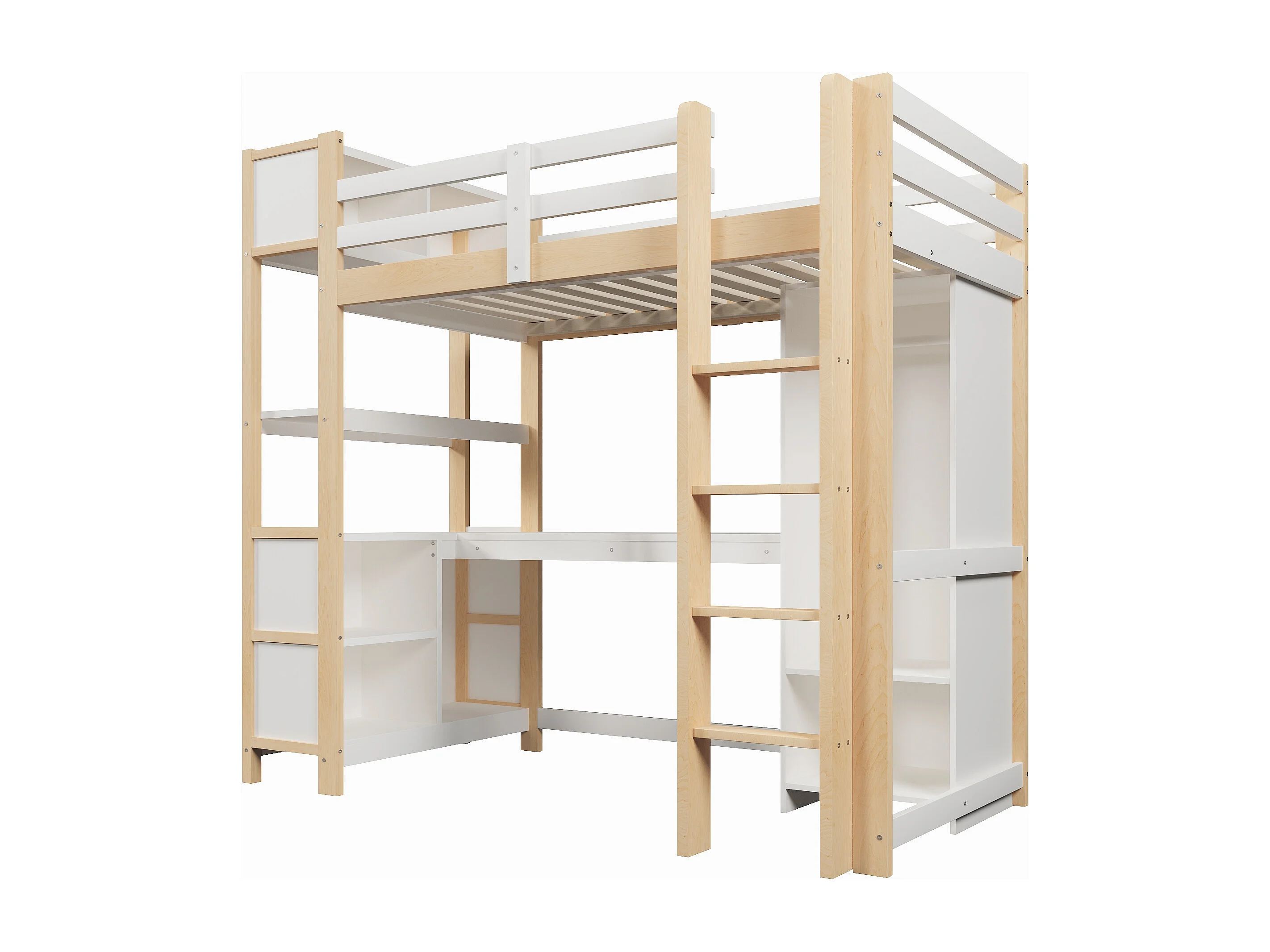 Lit mezzanine pour enfant - 90 x 200 cm - avec étagères de rangement + bureau + armoire - bois - naturel