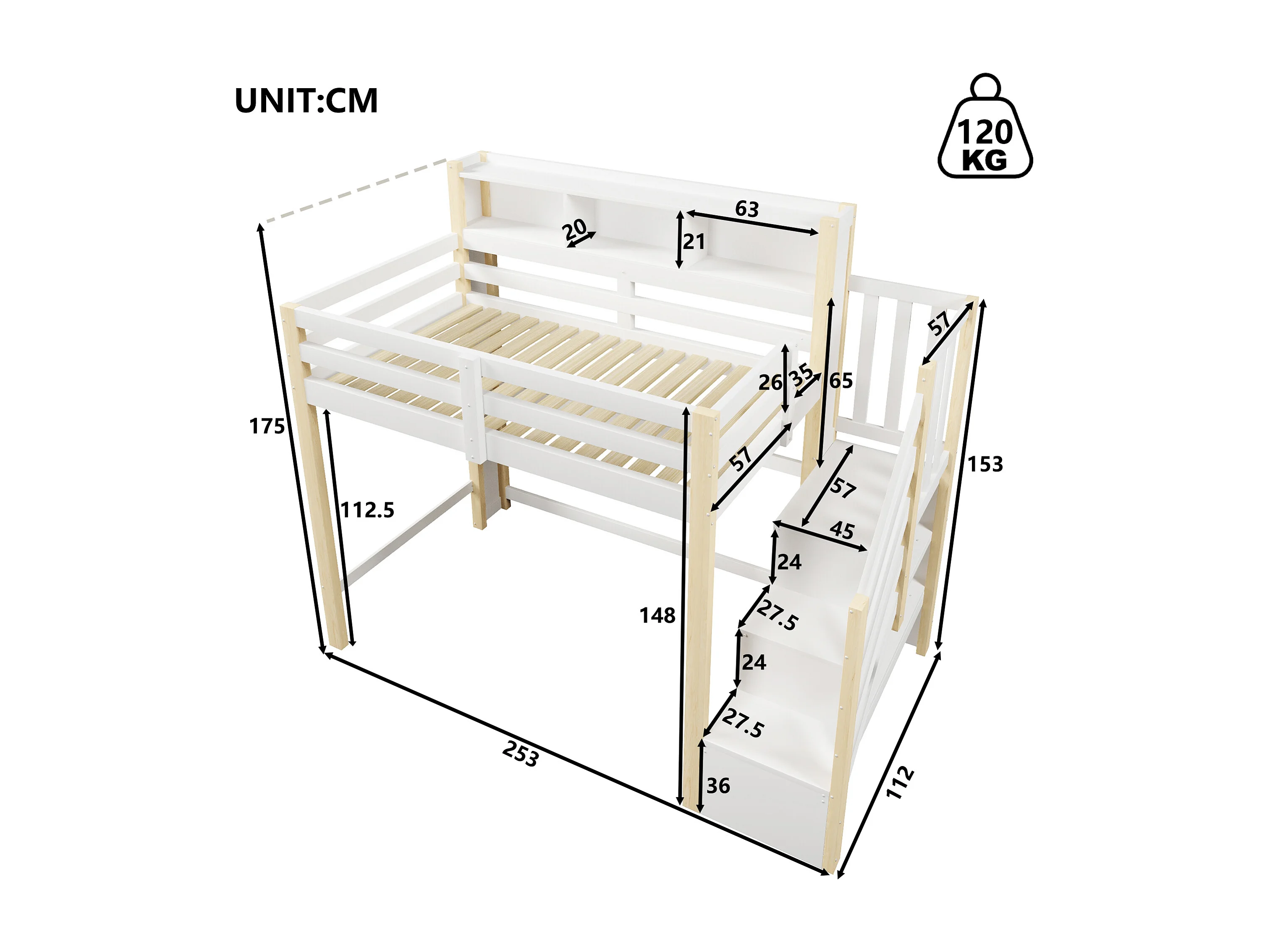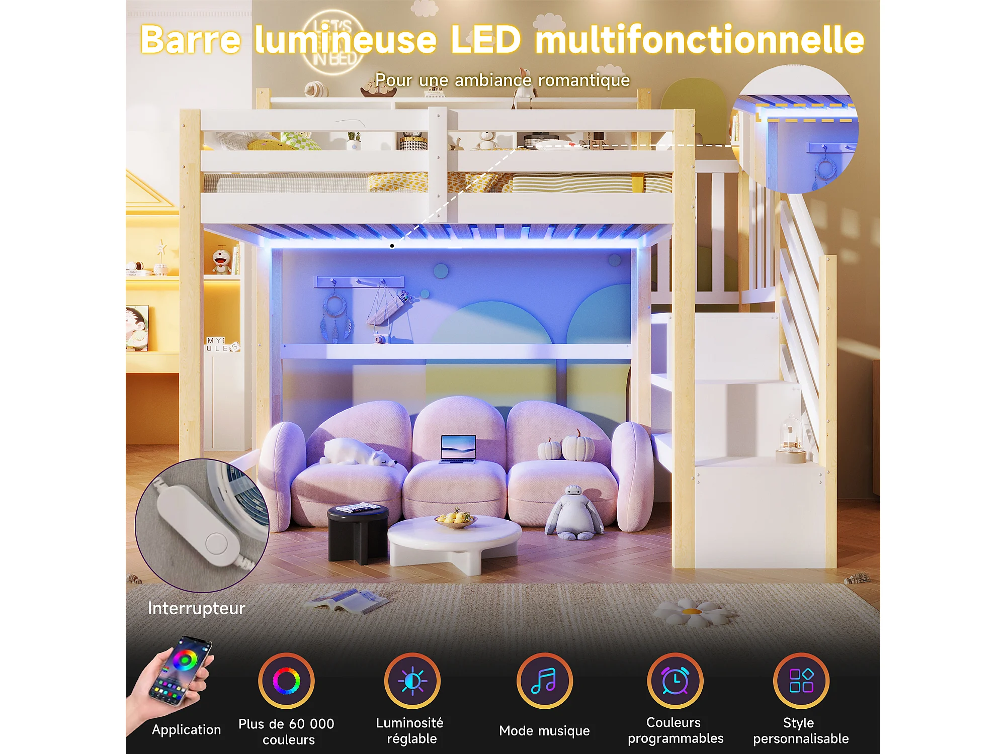 Lit mezzanine pour enfant - 90 x 200 cm - avec Leds + échelle de rangement + étagère de rangement - bois - blanc + naturel