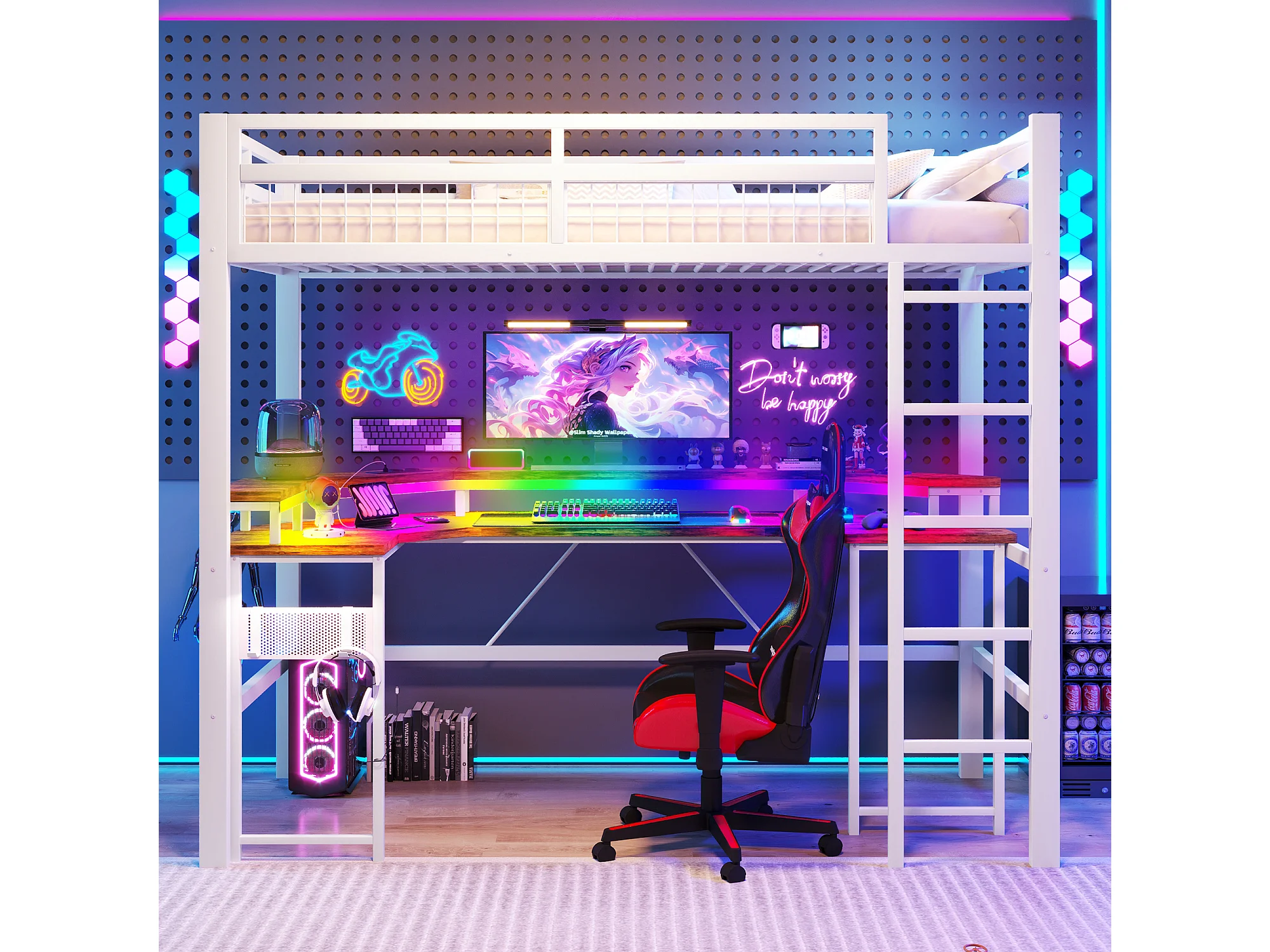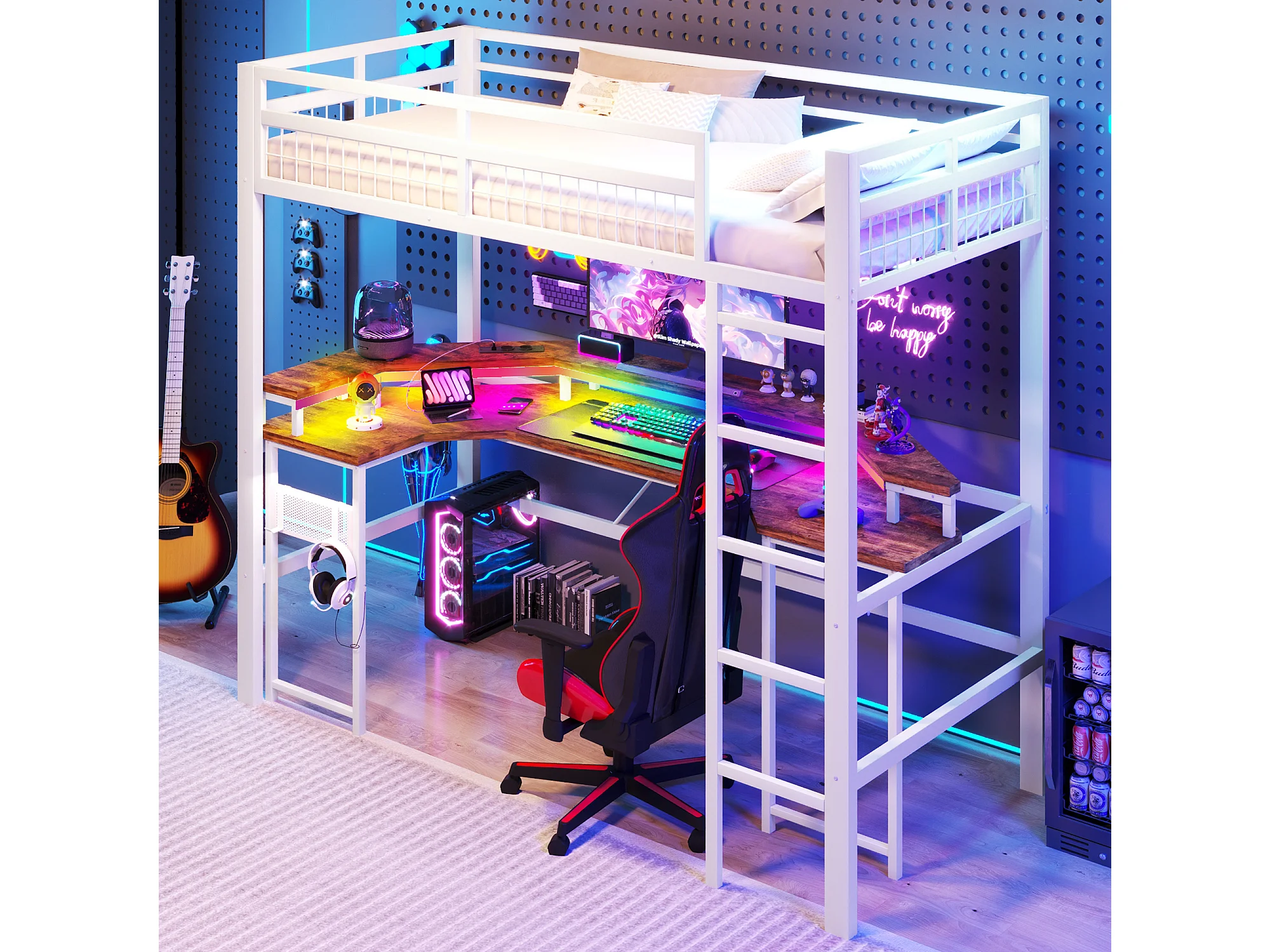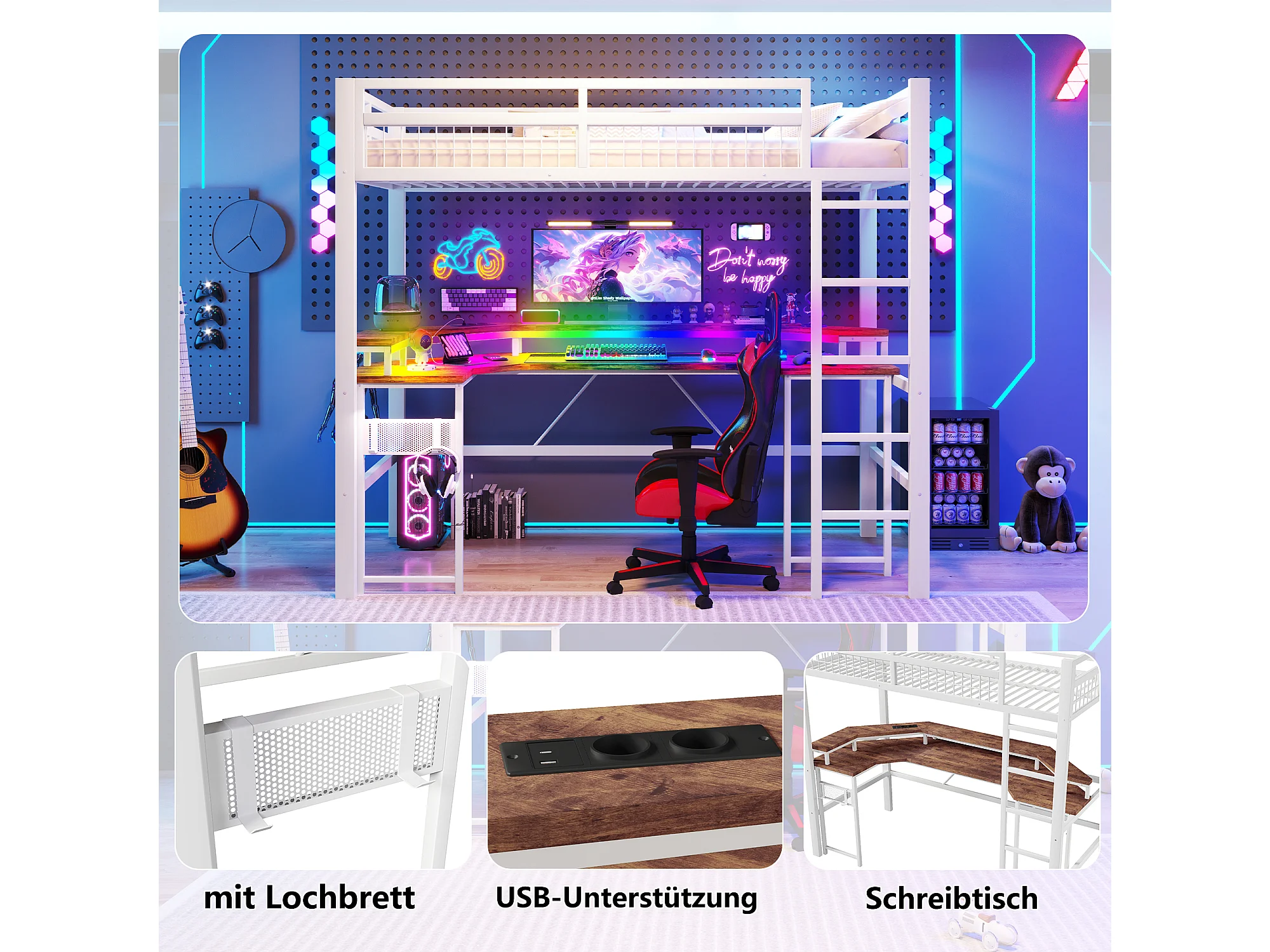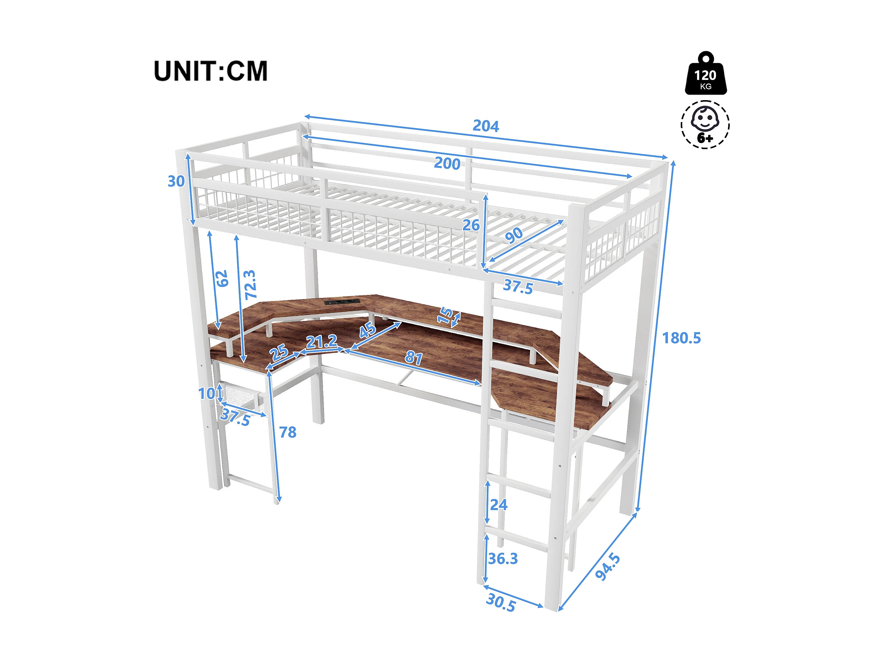 Lit mezzanine pour enfant - 90 x 200 cm - structure en fer - avec Leds + bureau + USB + prise - métal - blanc