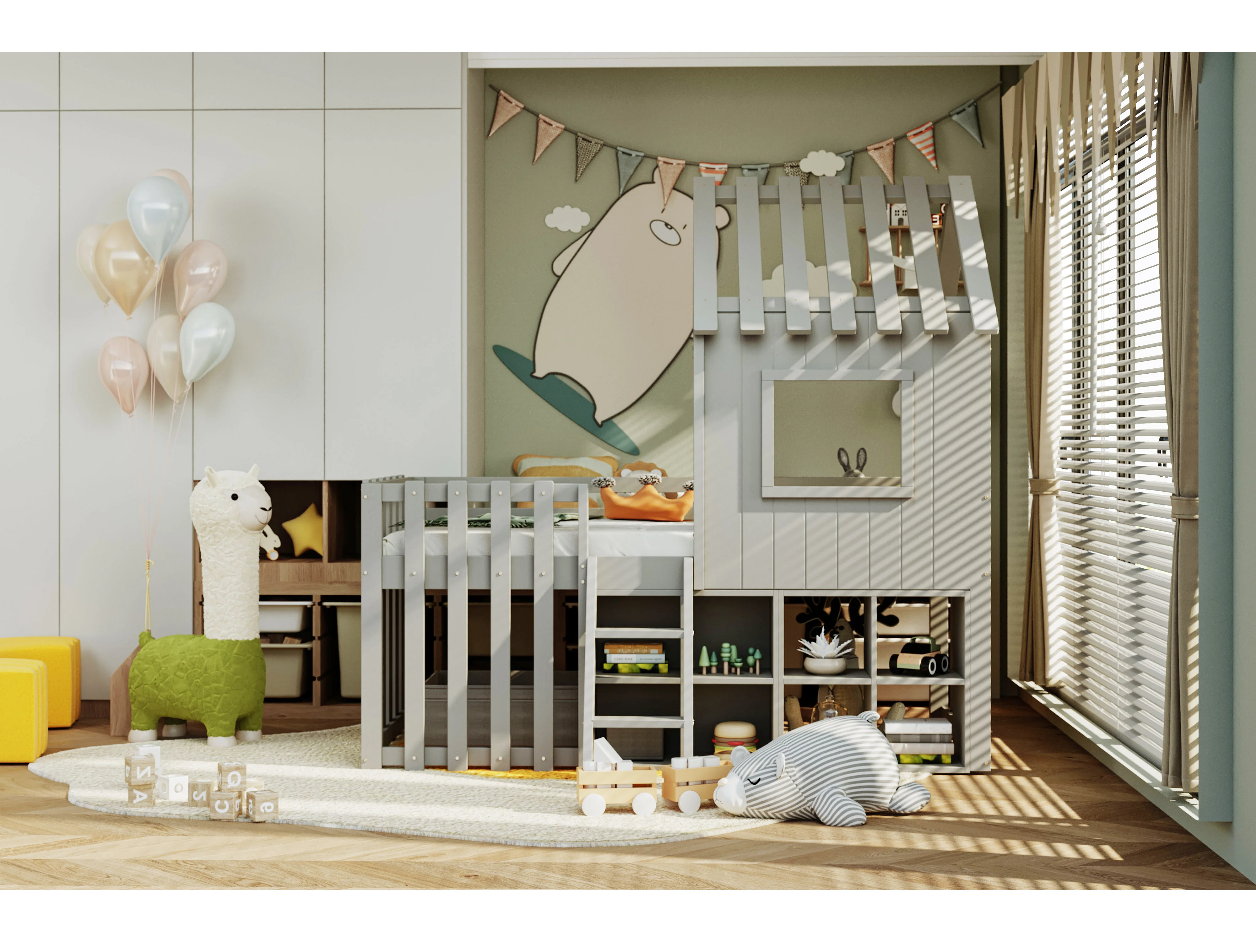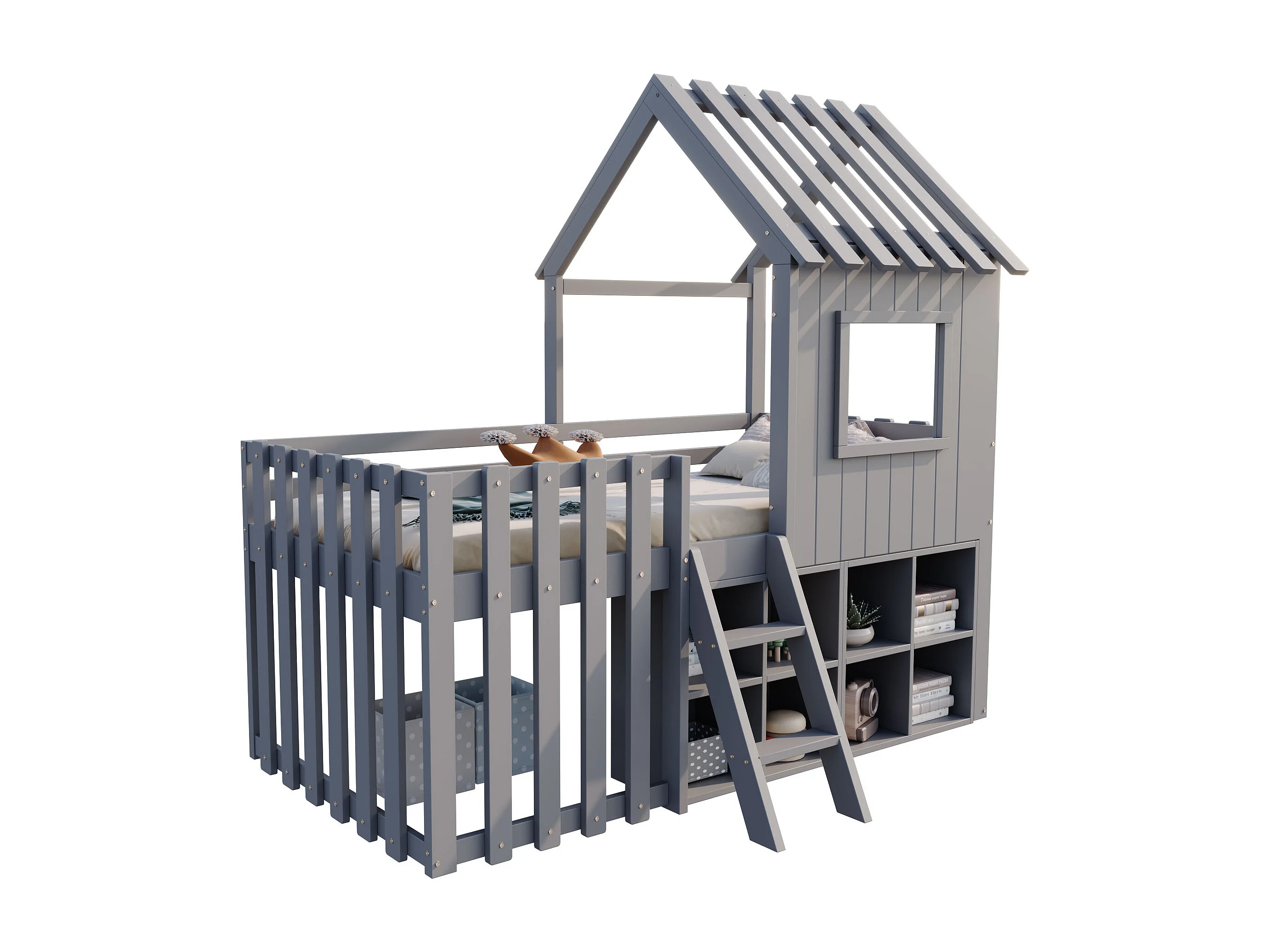 Lit mezzanine pour enfant 90x200, avec toit, fenêtres, espace de rangement et échelle, bois massif, gris (204.5x95x201 cm)