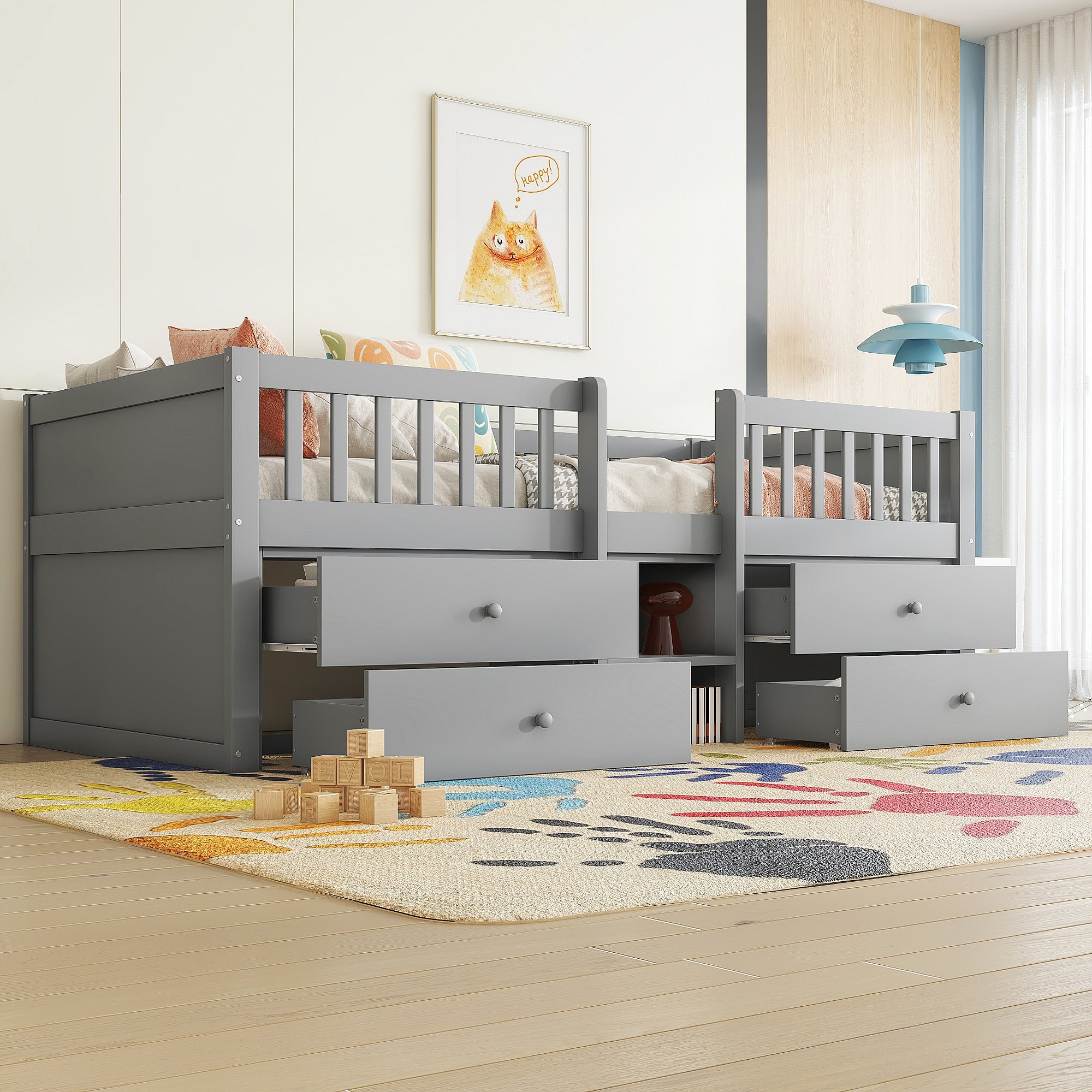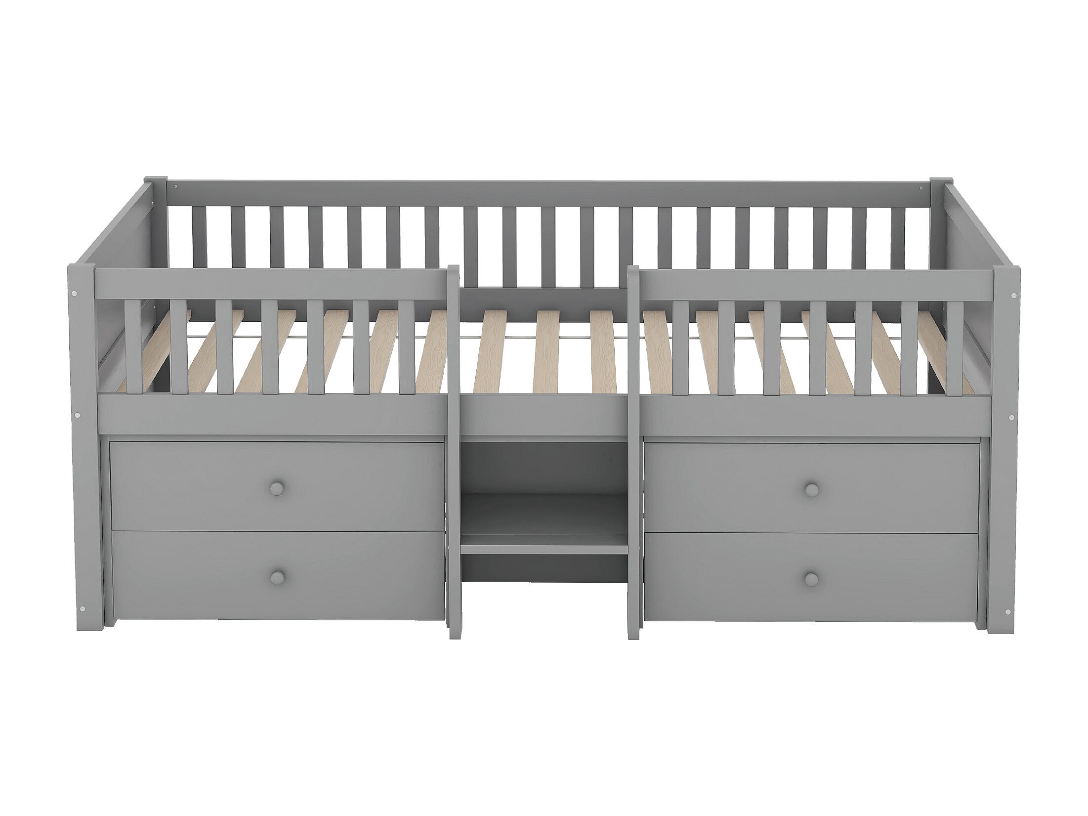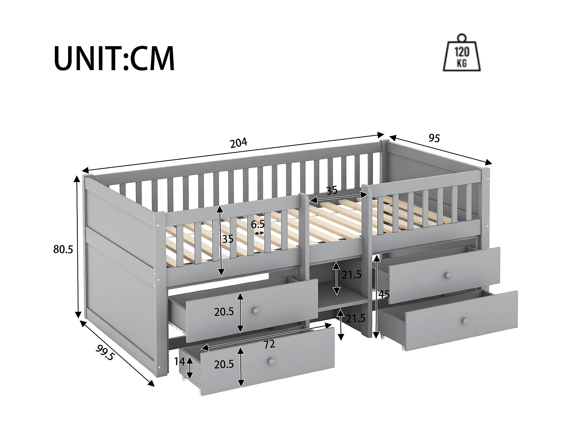 Lit mi-haut 90x200 cm, 4 tiroirs, barrière de sécurité, échelle, pin, sans matelas, style minimaliste, gris