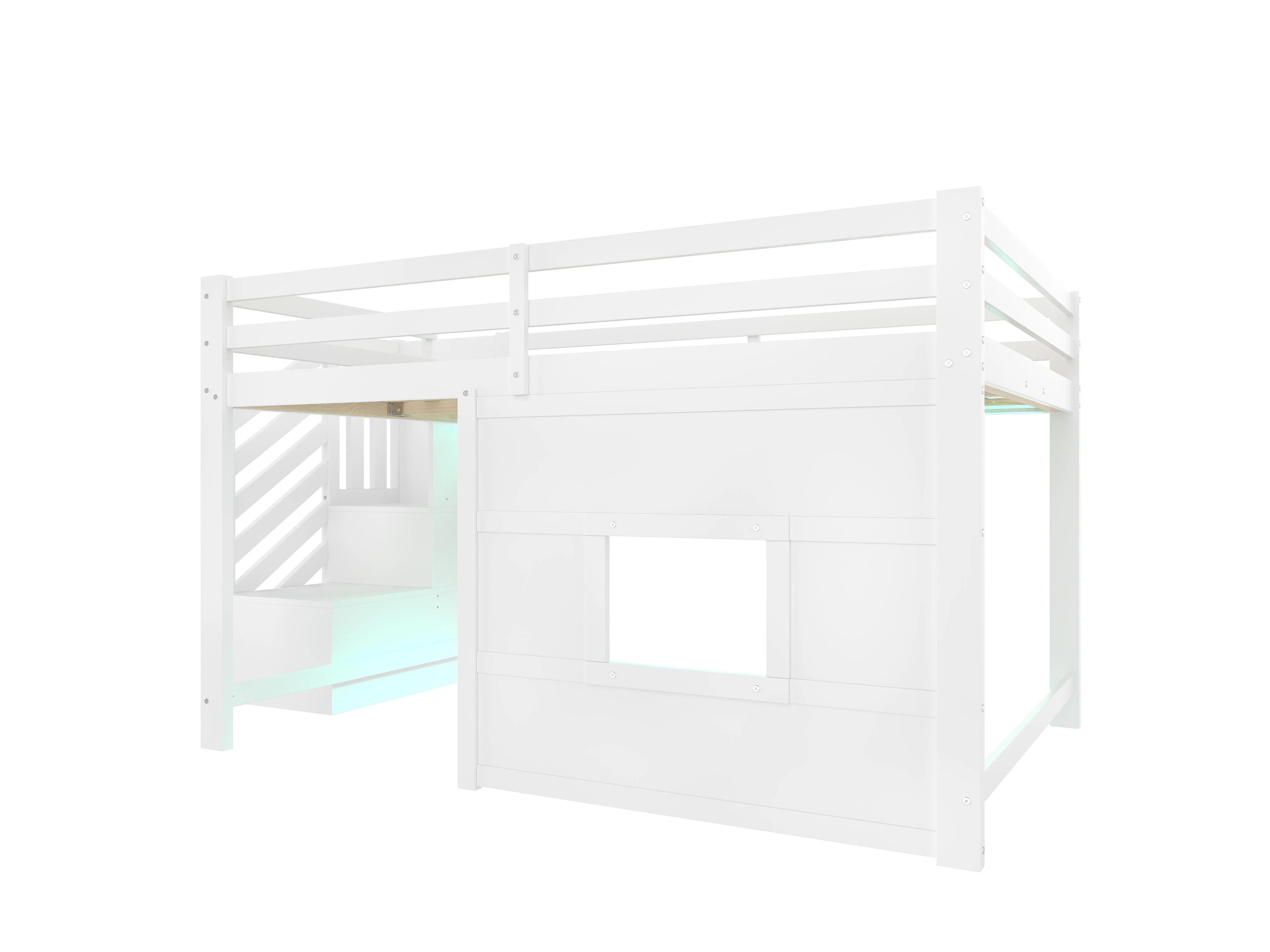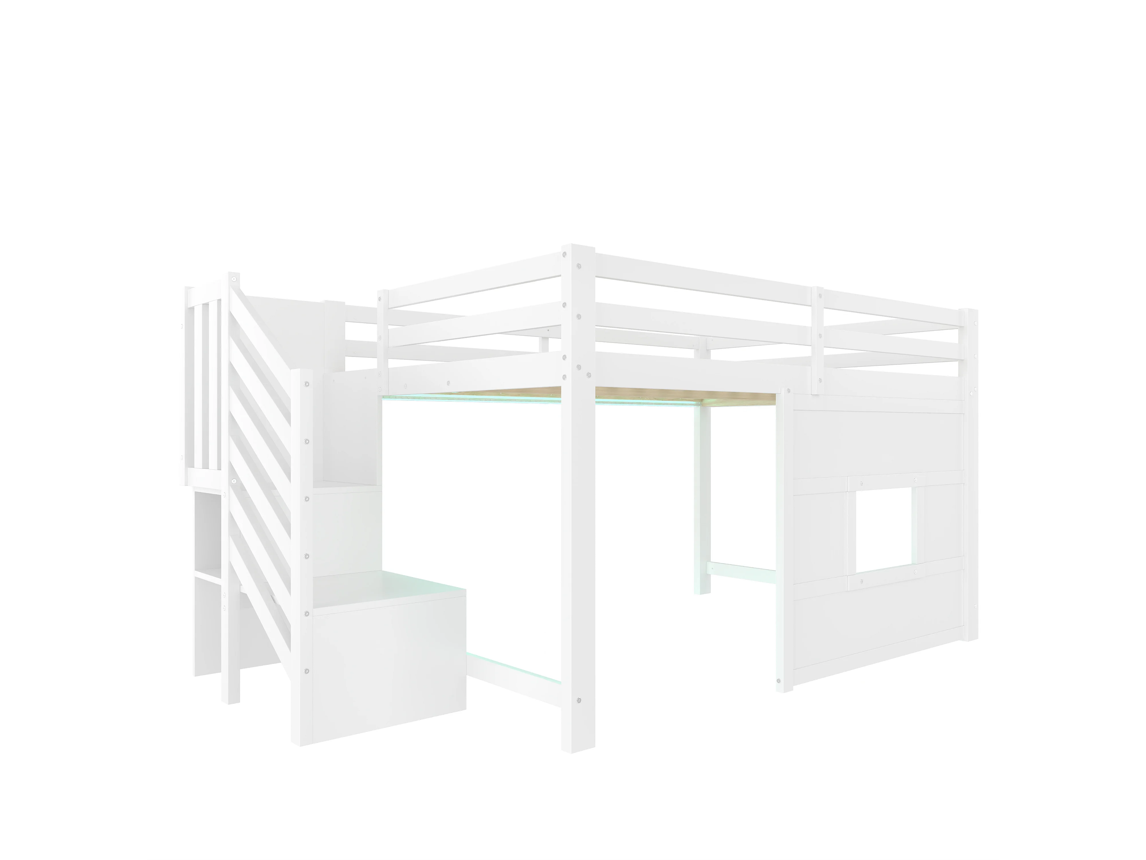 Lit mi-haut enfant 140x200 cm avec LED, escalier de rangements et fenêtre - Blanc