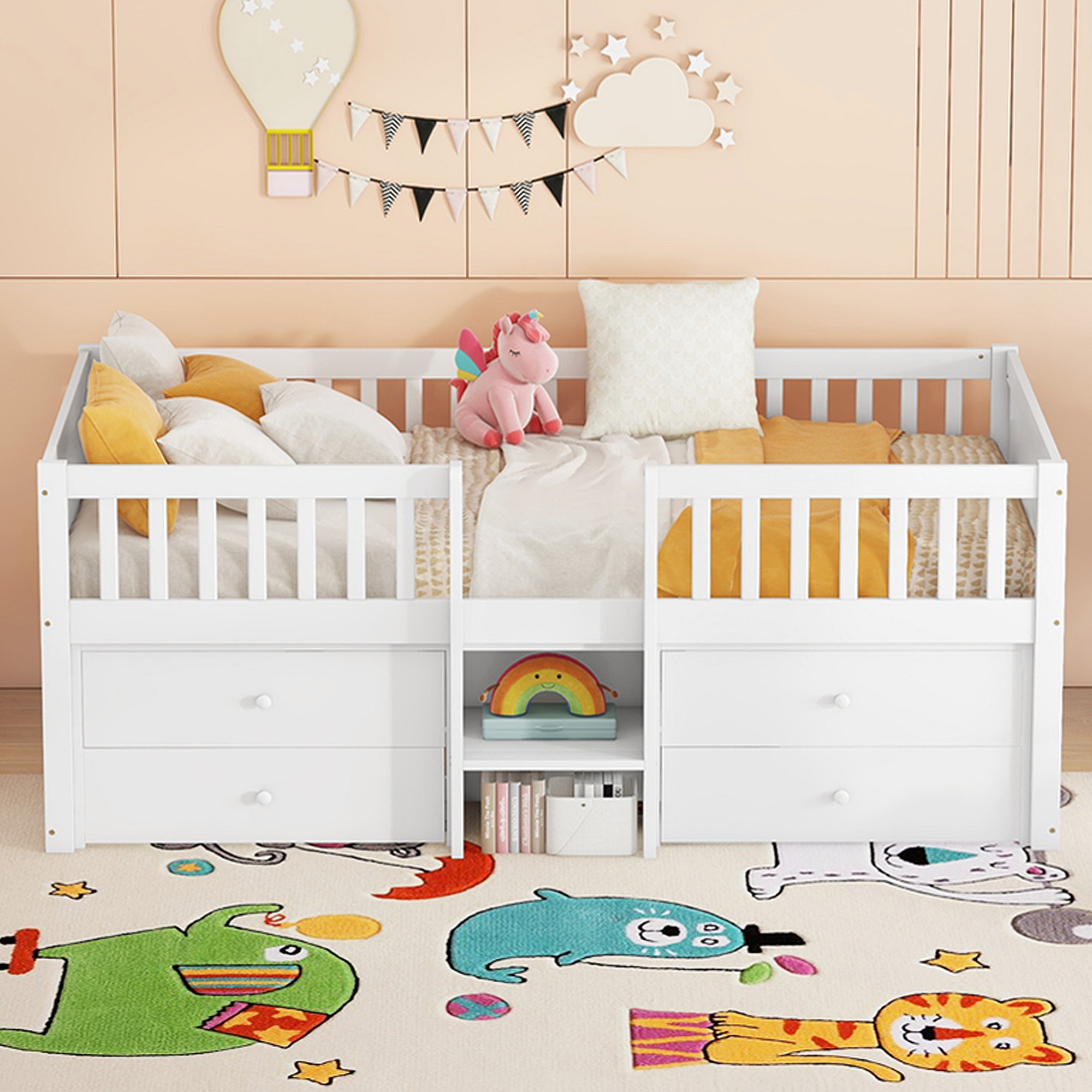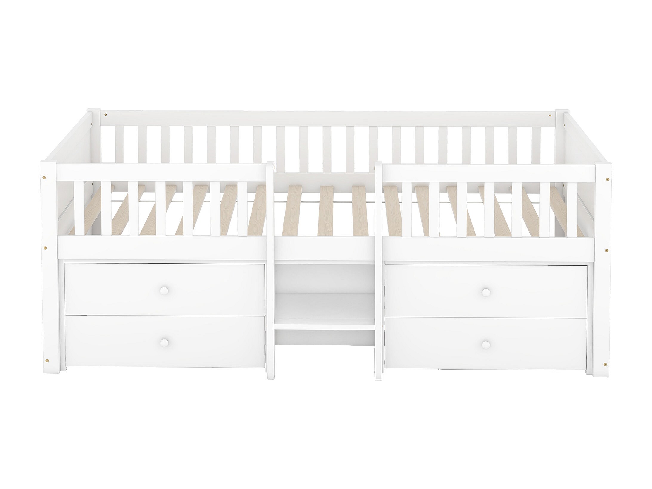 Lit mi-hauteur 90x200 cm, avec 4 tiroirs, garde-corps et échelle, en pin massif, design minimaliste, couleur blanche (matelas non inclus)