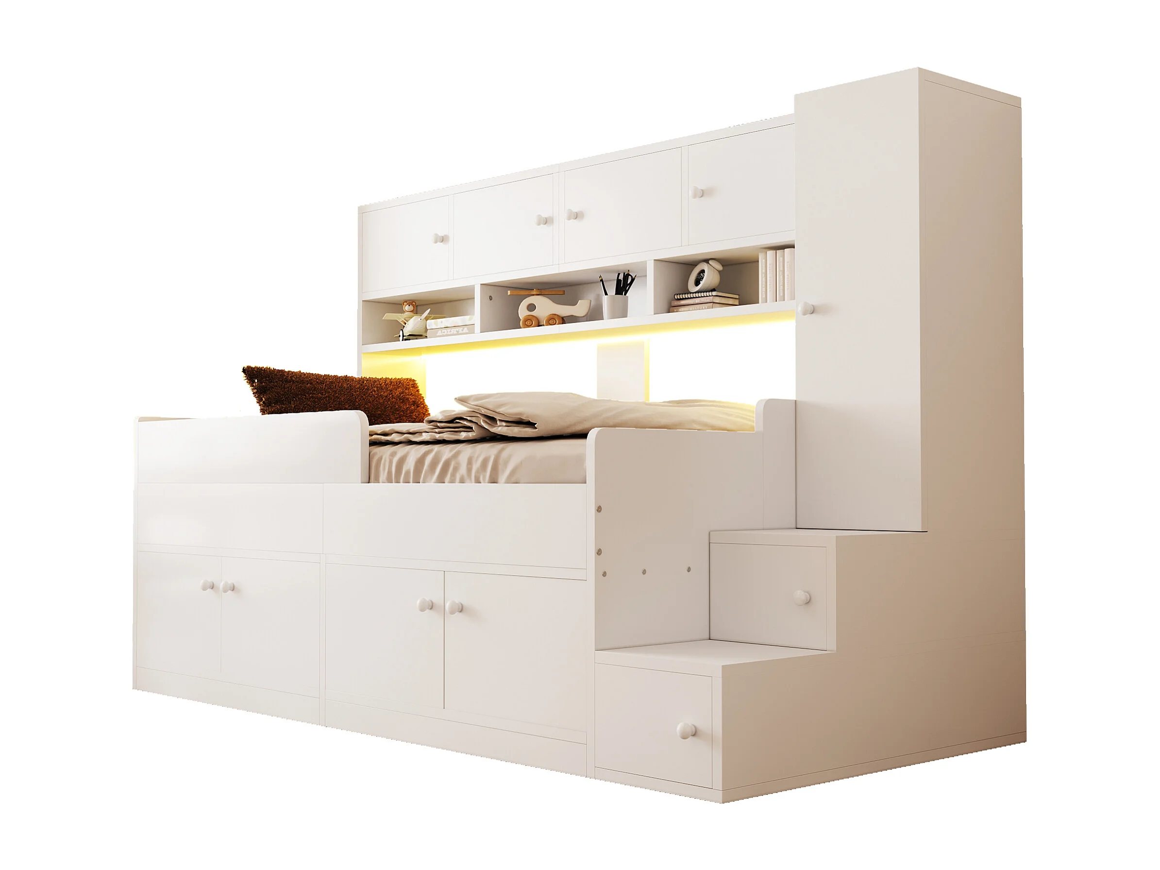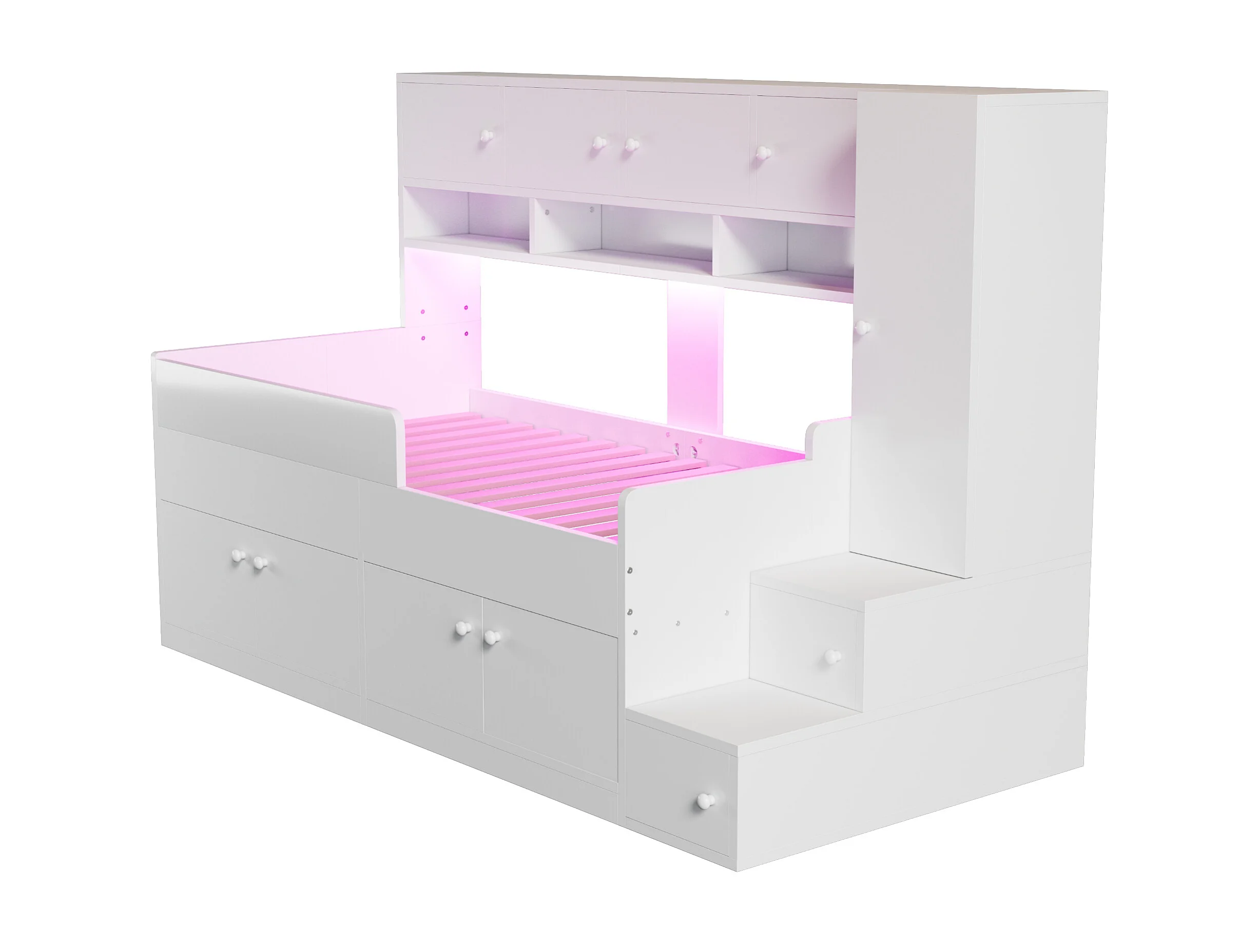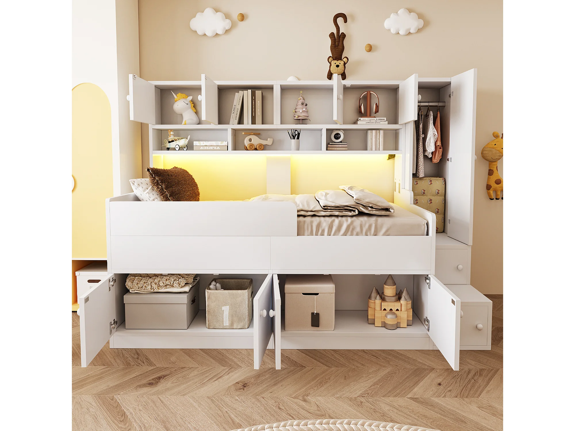 Lit mi-hauteur 90x200 cm avec LED, rangements et armoire - Bois blanc