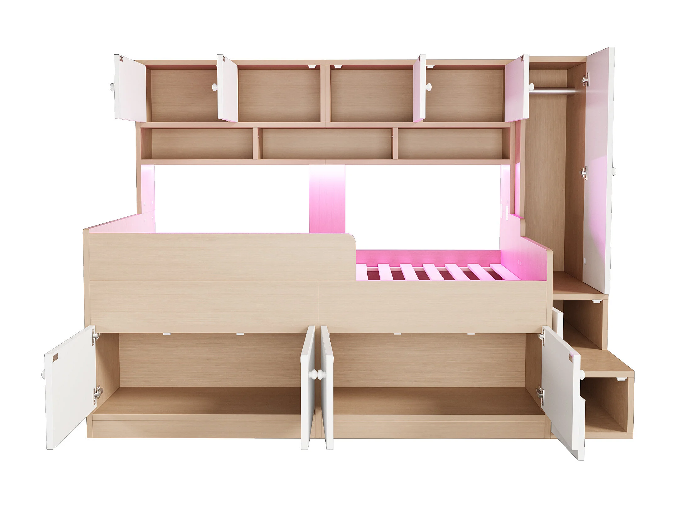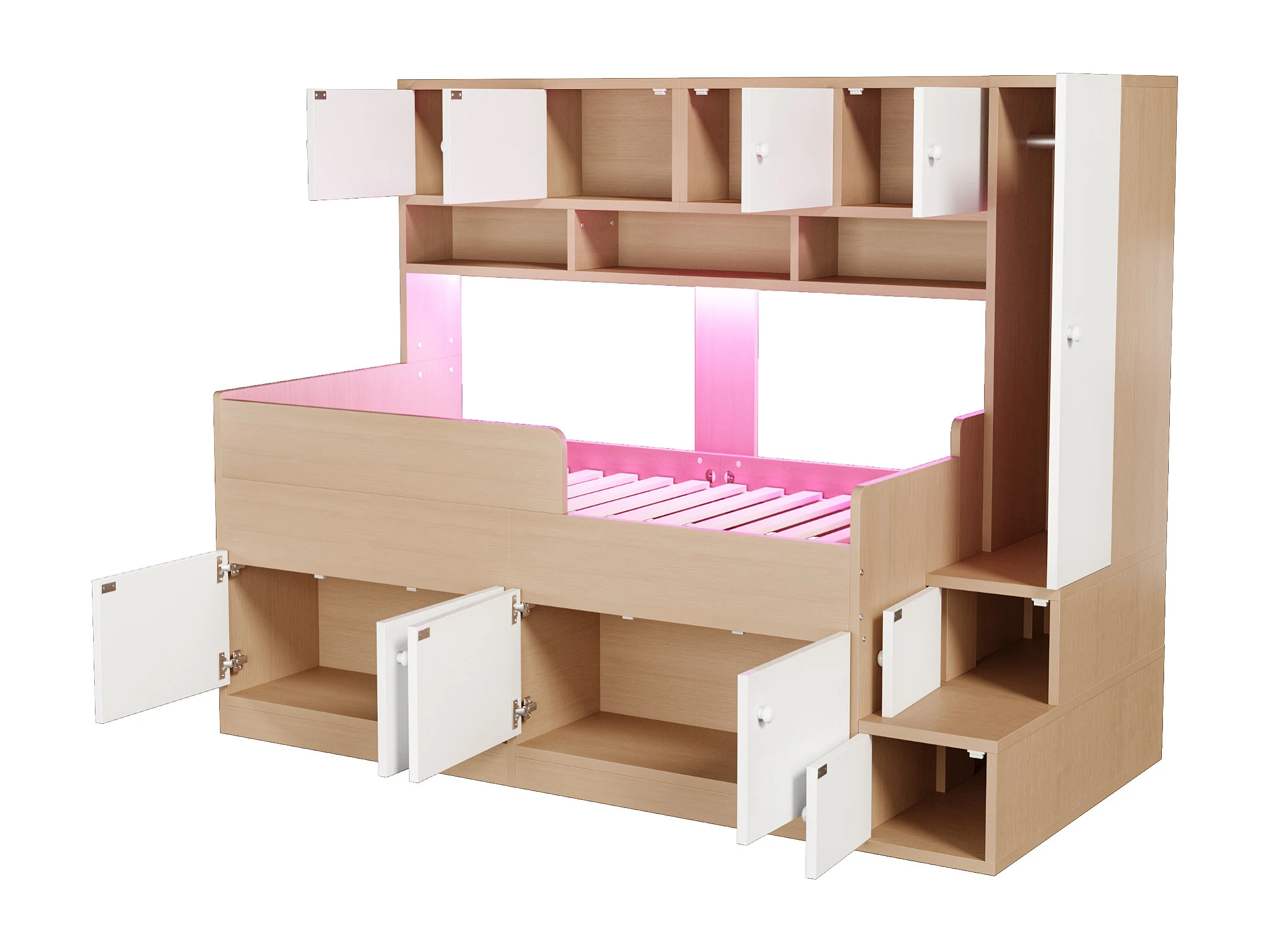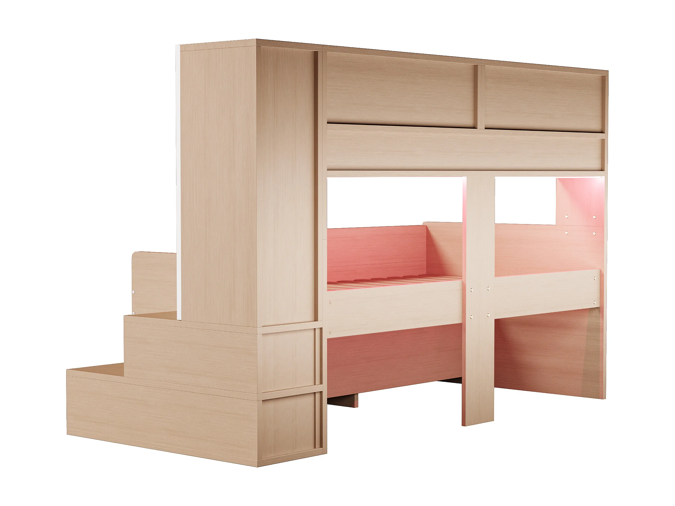 Lit mi-hauteur 90x200 cm avec LED, rangements et armoire - Bois blanc et naturel clair