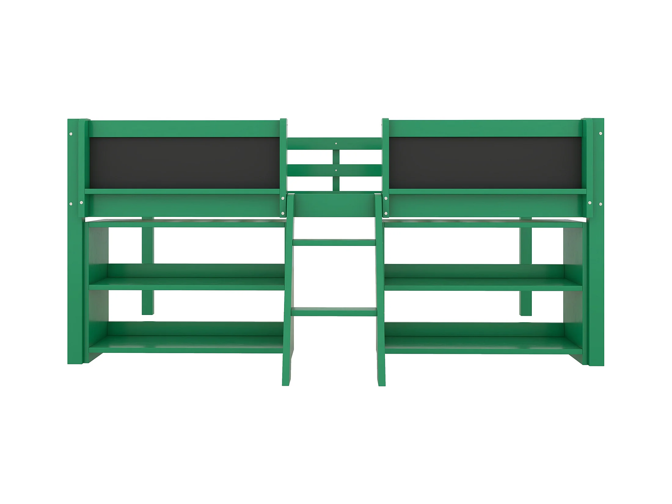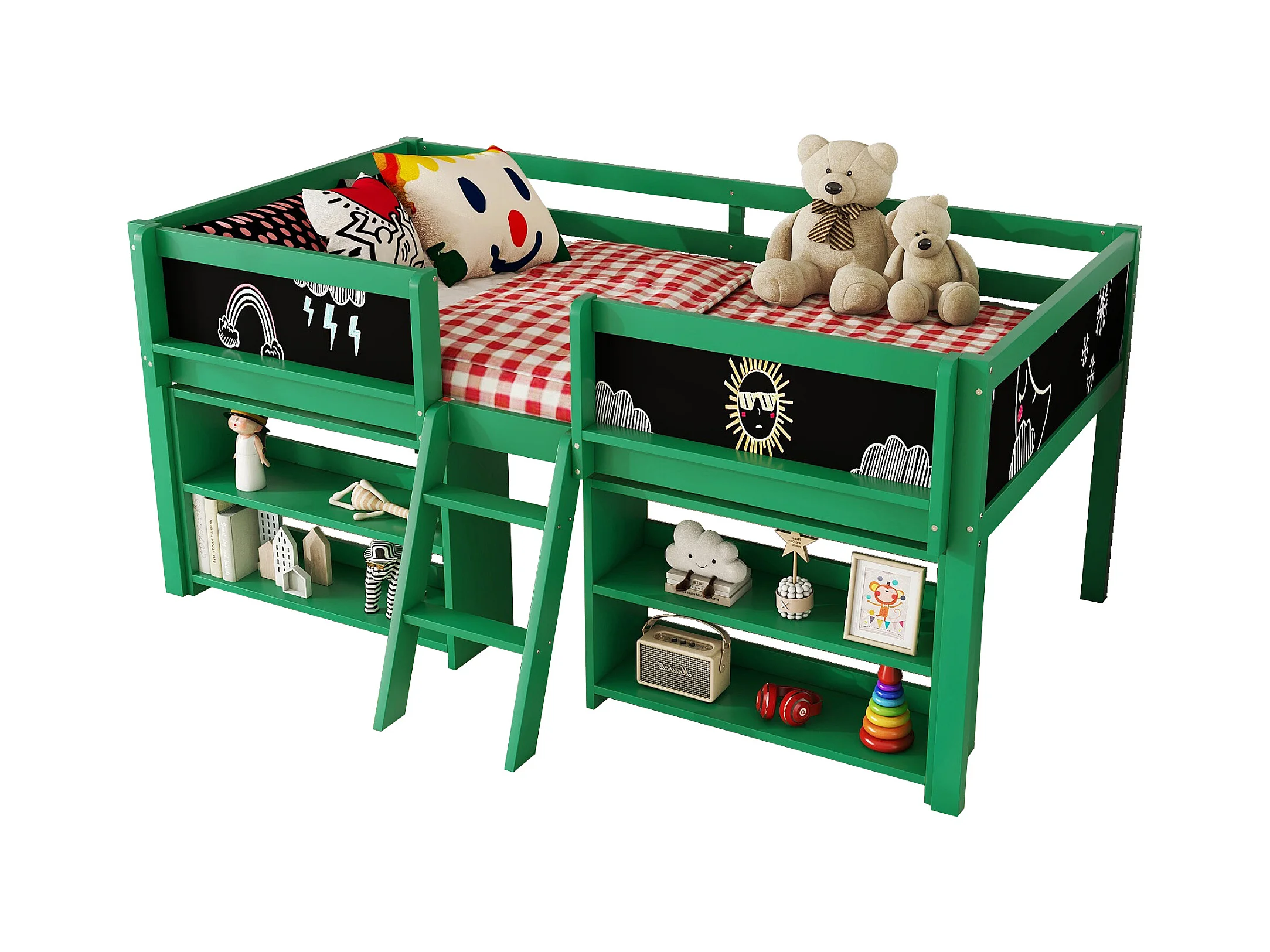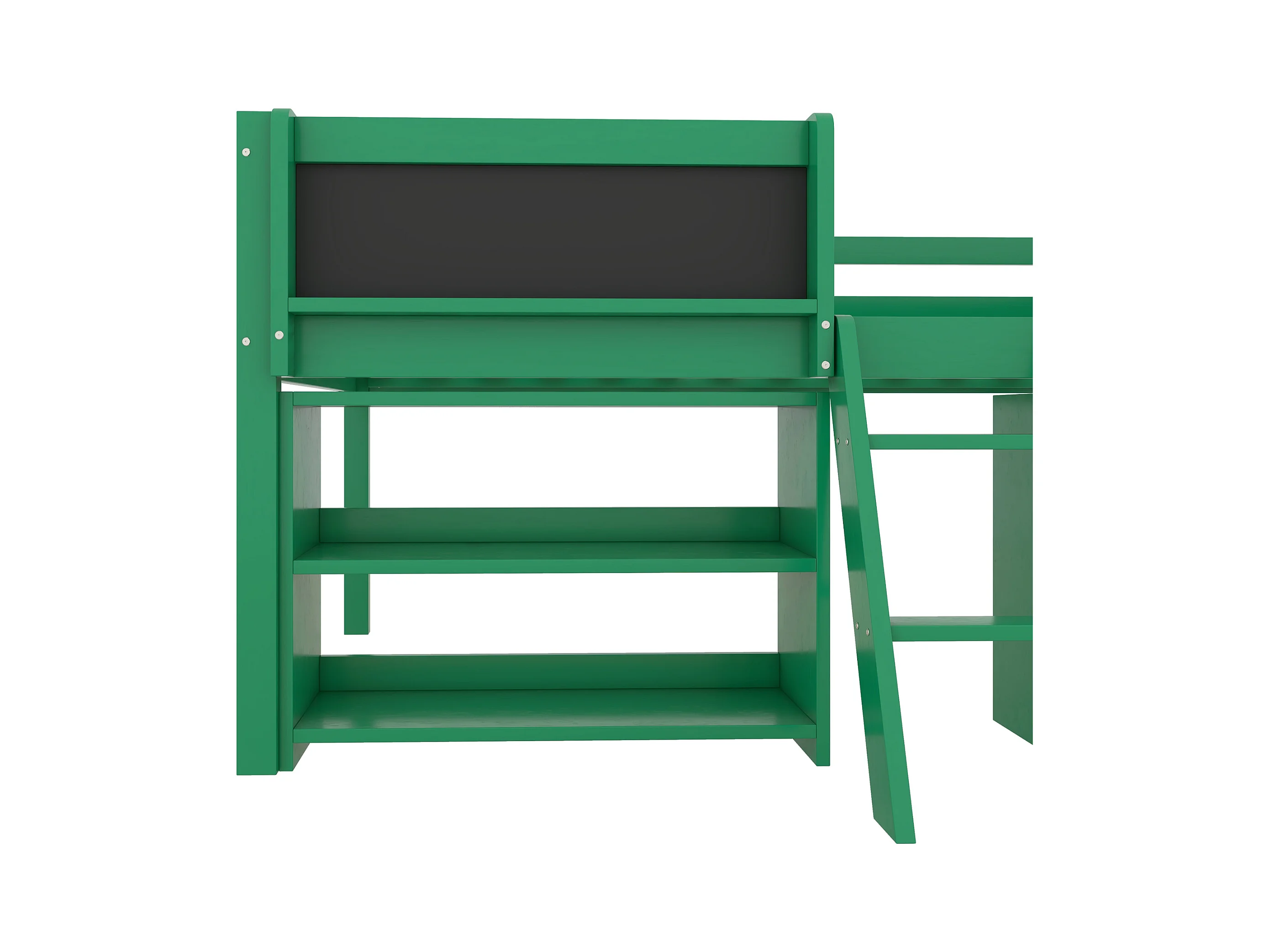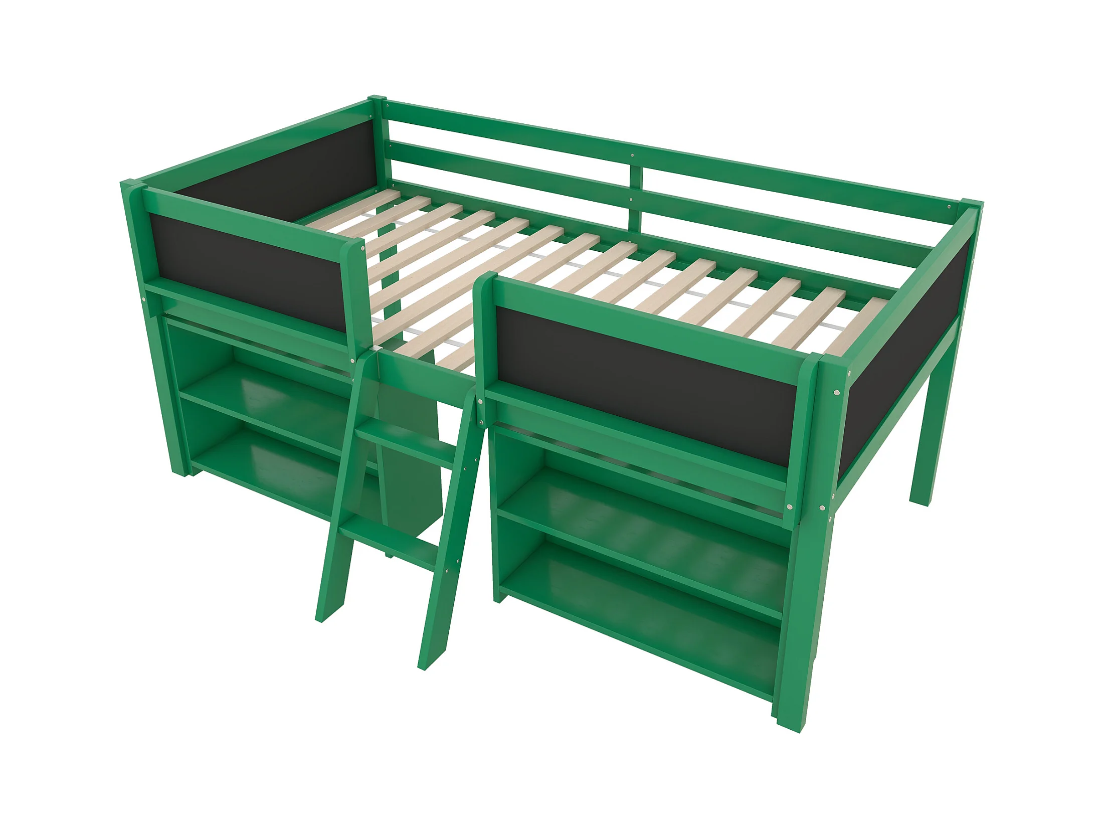 Lit mi-hauteur 90x200 cm en pin vert - lit enfant Plusieurs étagères de rangement et échelle (sans matelas)