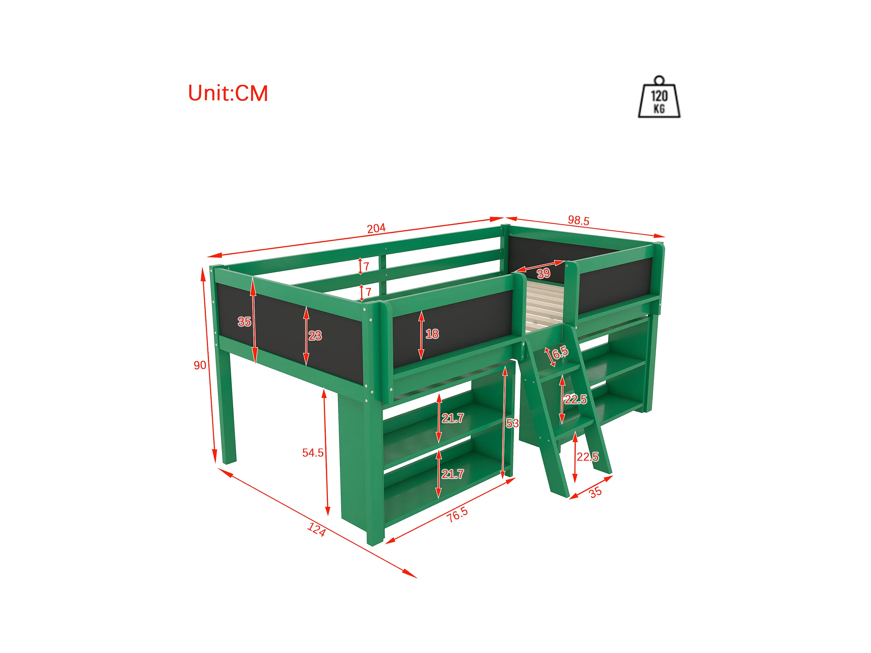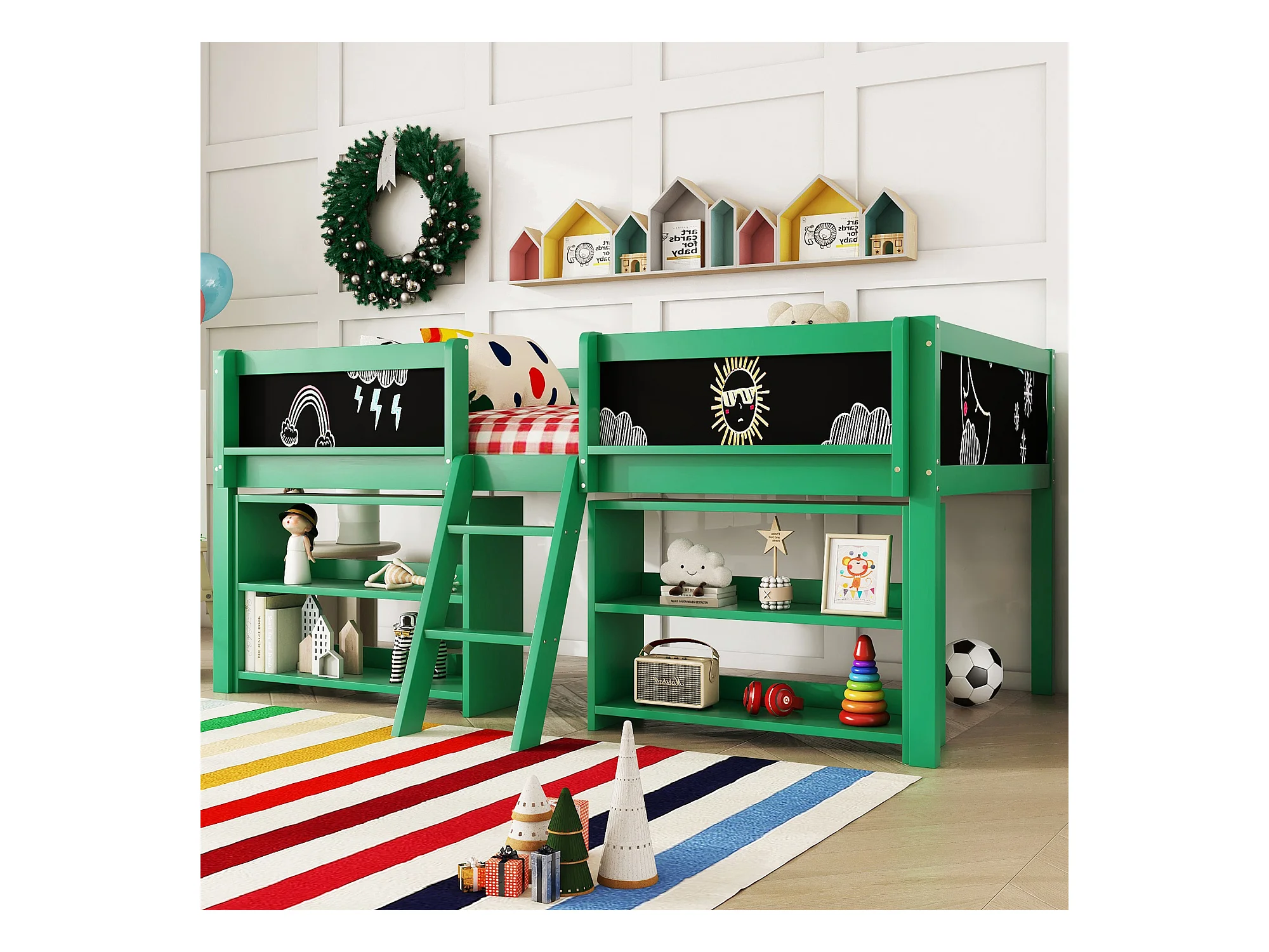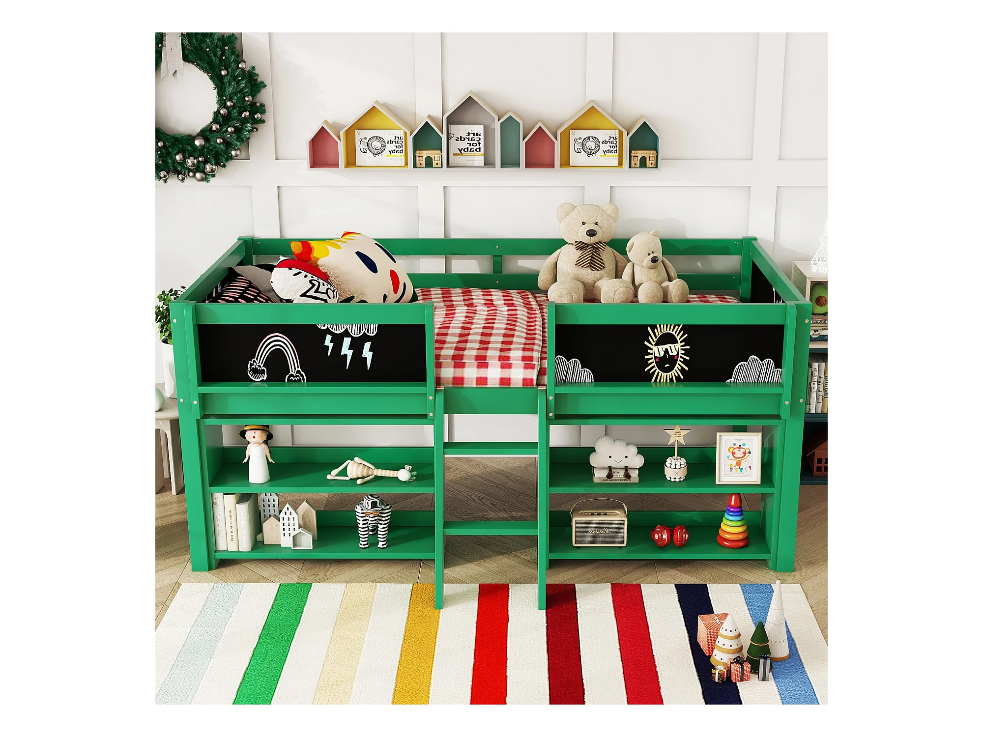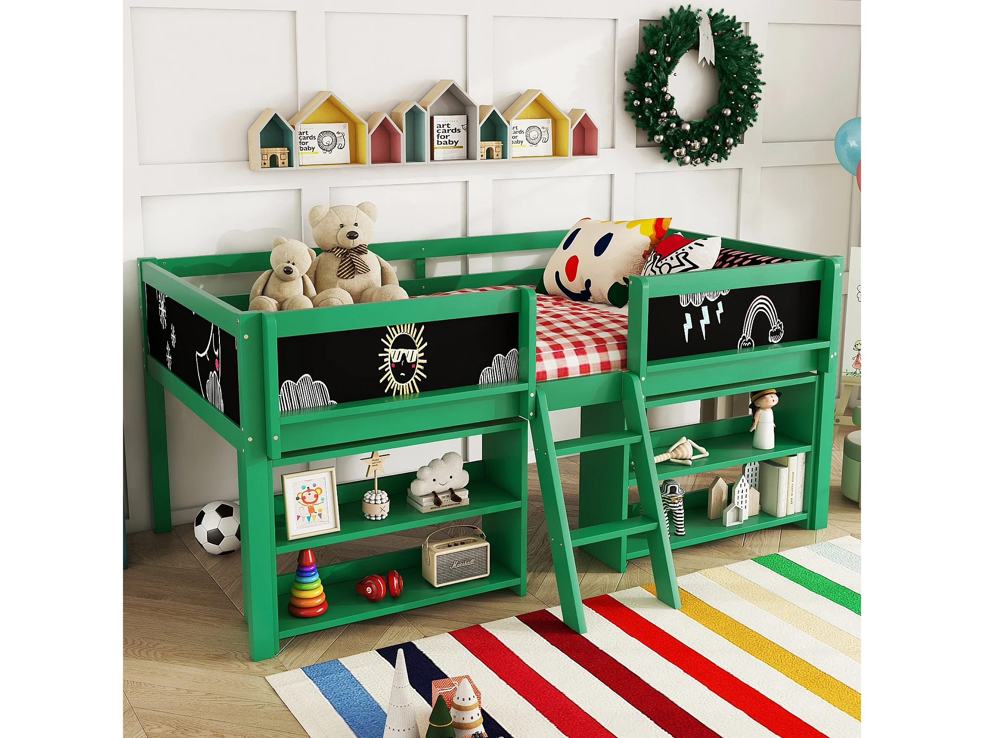 Lit mi-hauteur 90x200 cm en pin vert - lit enfant Plusieurs étagères de rangement et échelle (sans matelas)