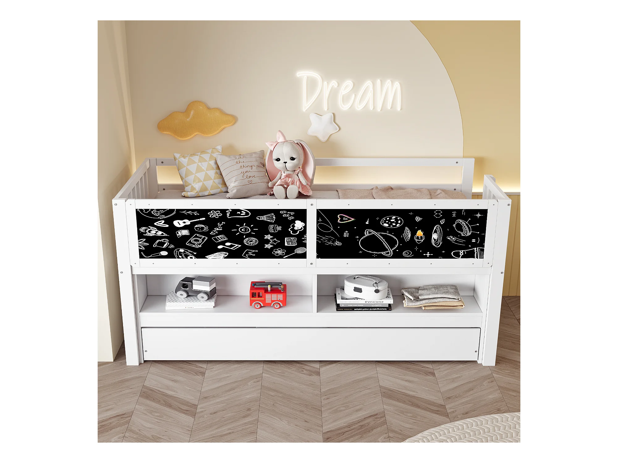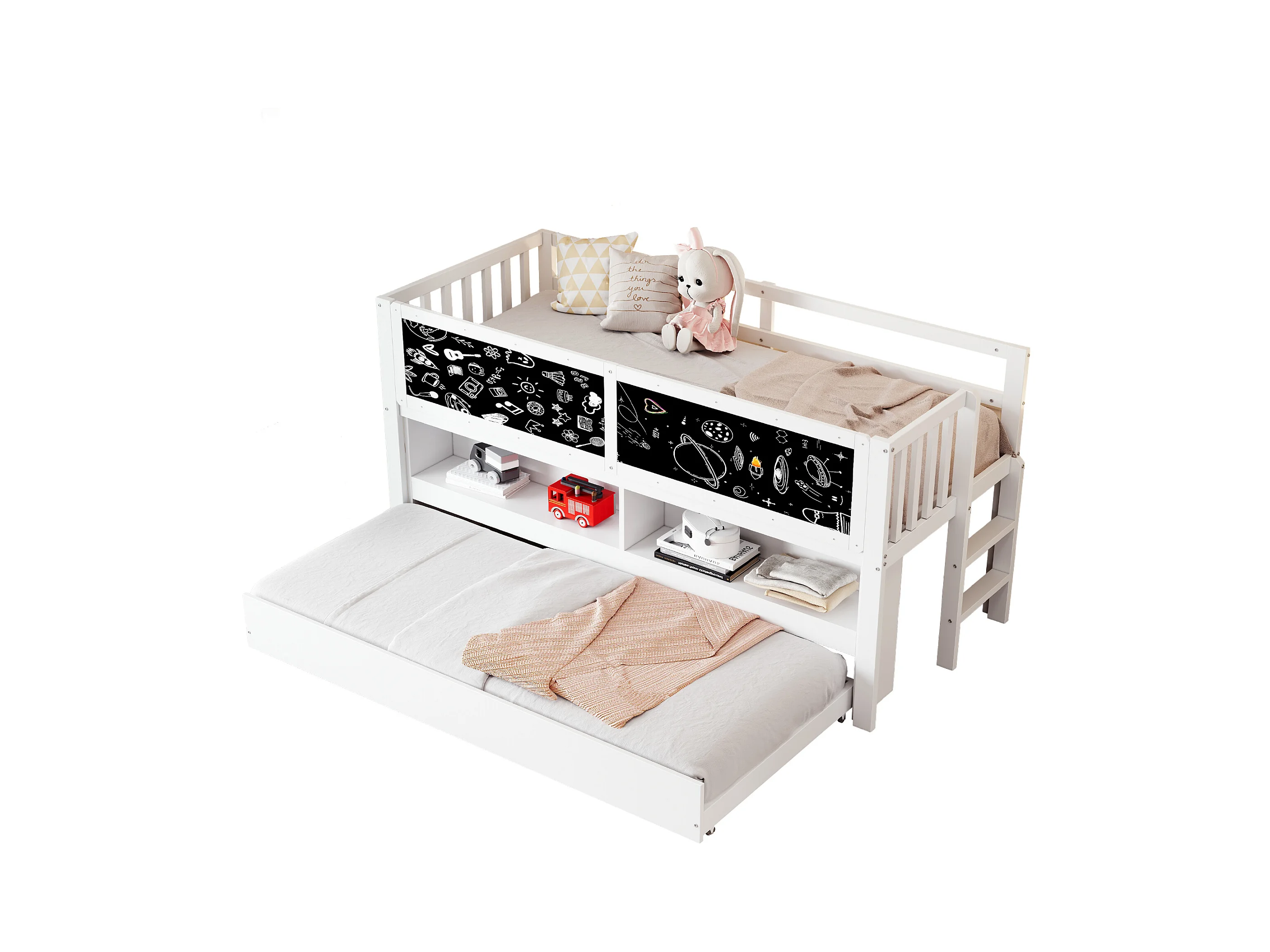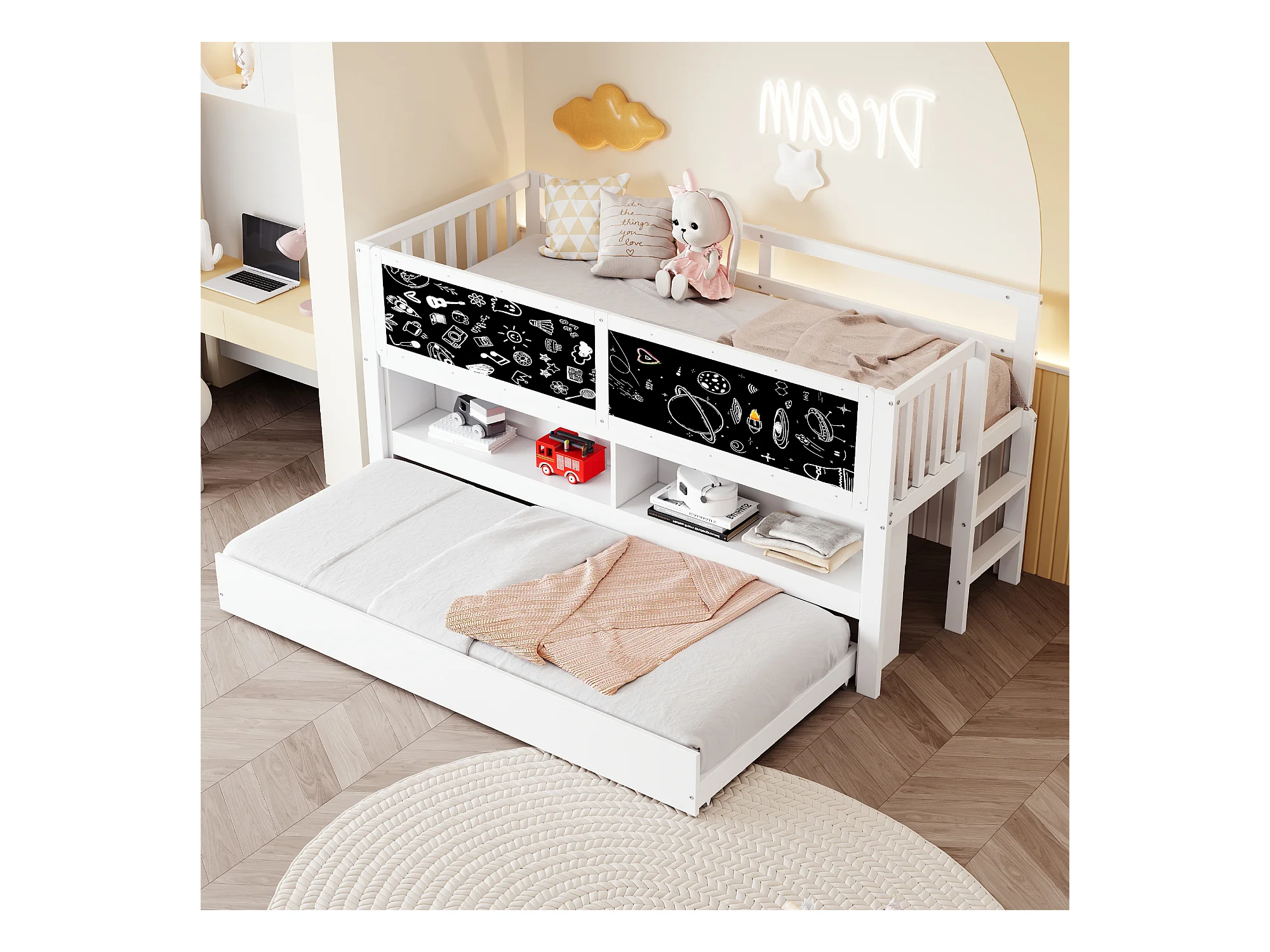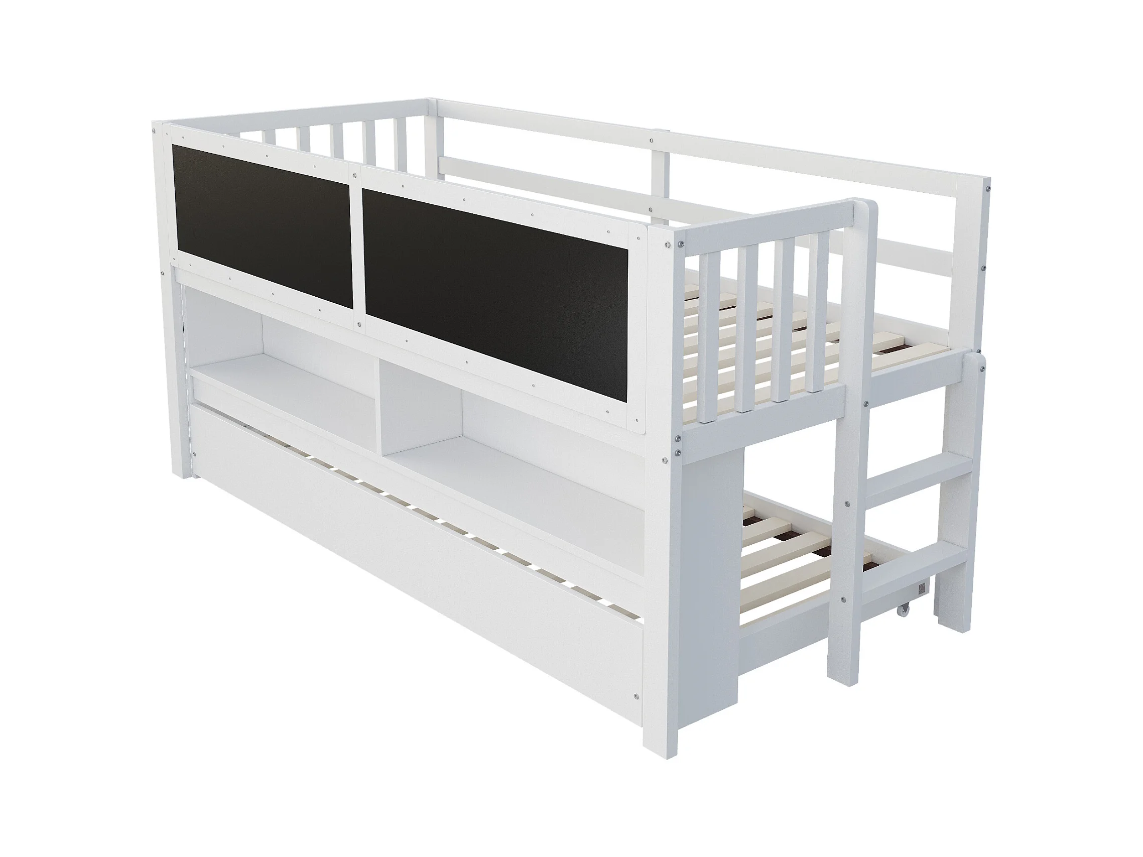 Lit mi hauteur enfant - 90 x 200 - avec lit gigogne 90 x 190 cm - avec tableau + rangement ouvert - bois - blanc