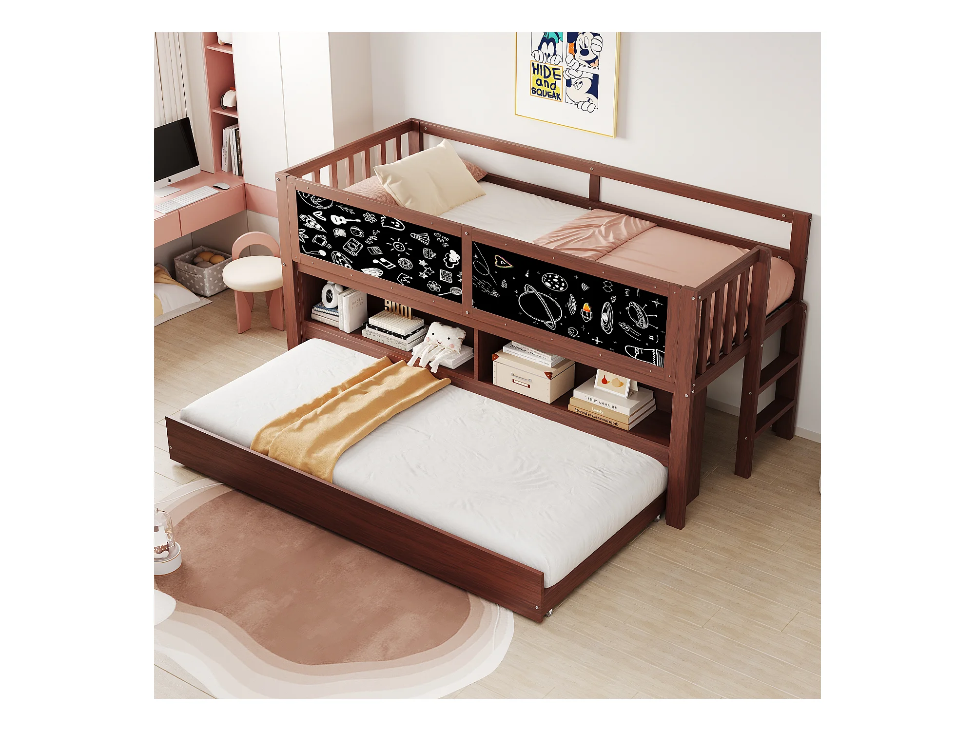 Lit mi hauteur enfant - 90 x 200 - avec lit gigogne 90 x 190 cm - avec tableau + rangement ouvert - bois - marron