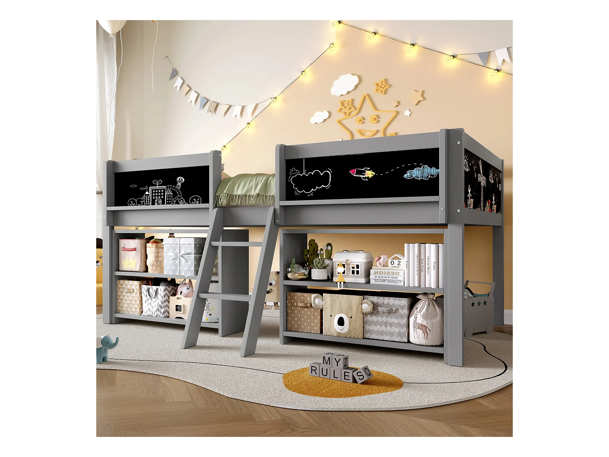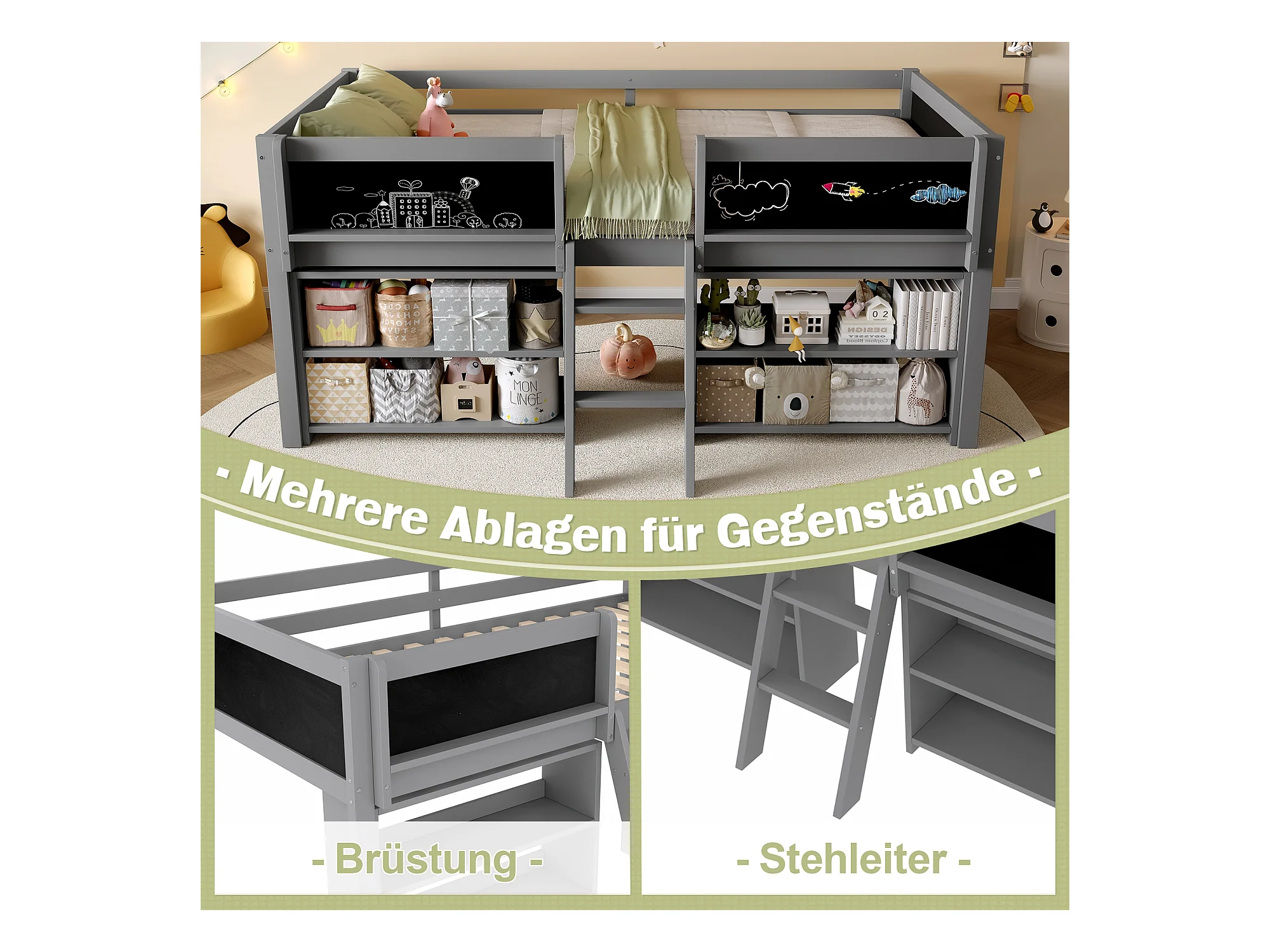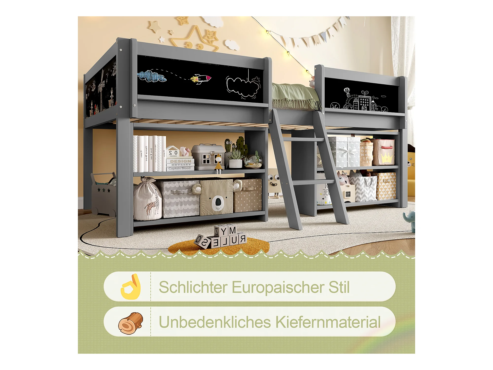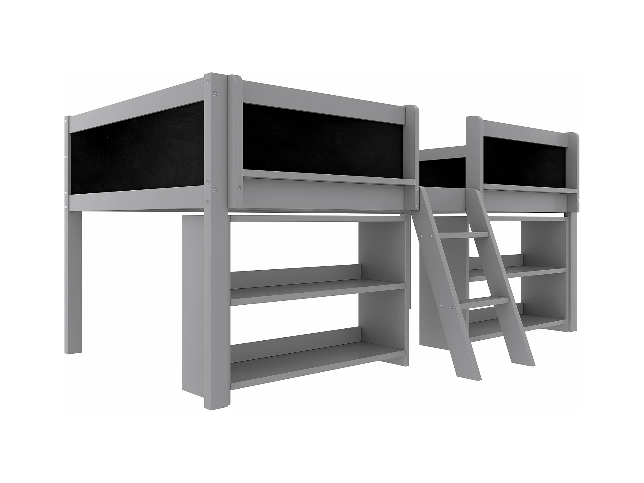Lit mi-hauteur enfant 90 x 200 cm avec étagères de rangement - Bois de pin + MDF - Sommier à lattes - gris