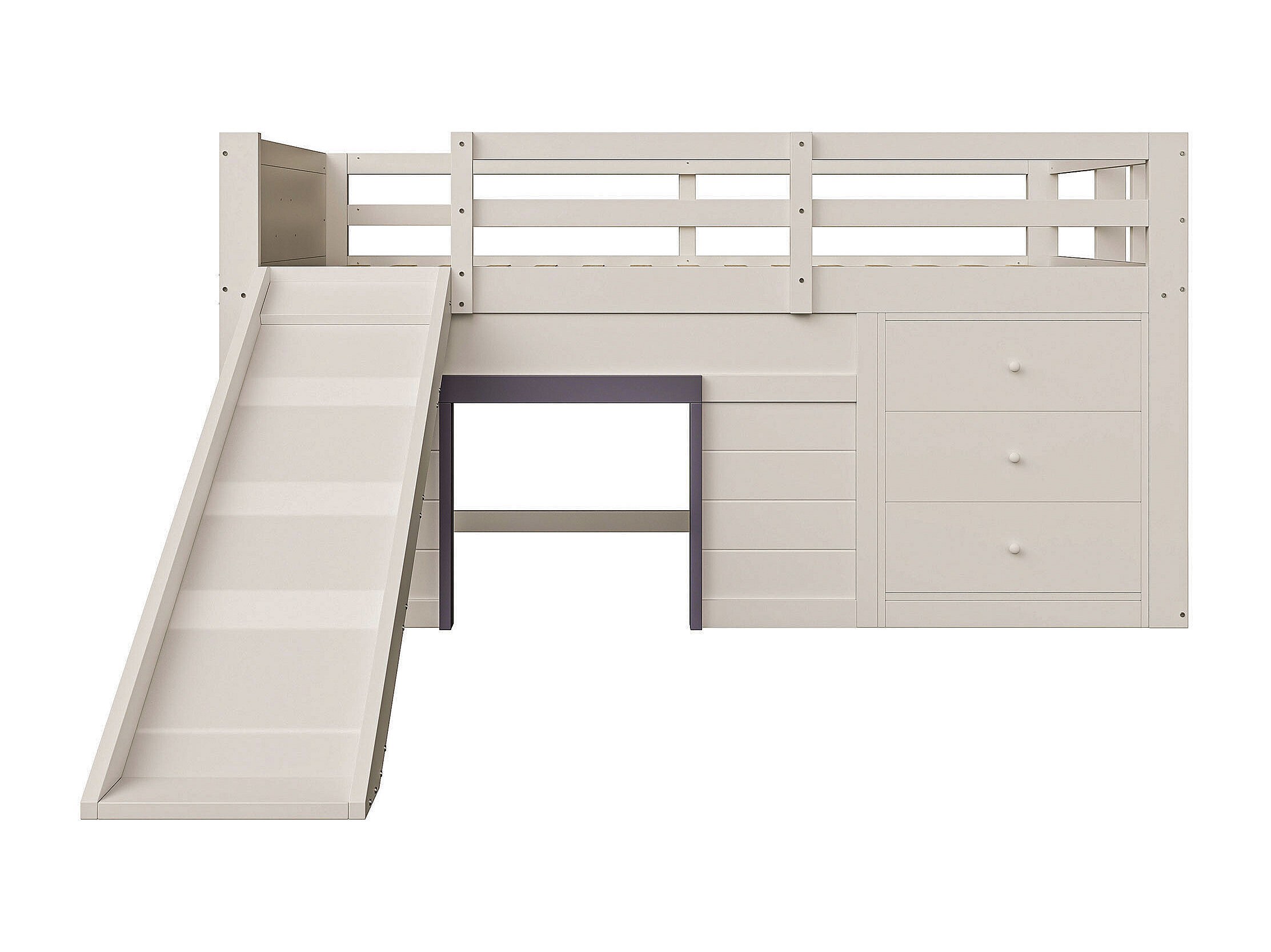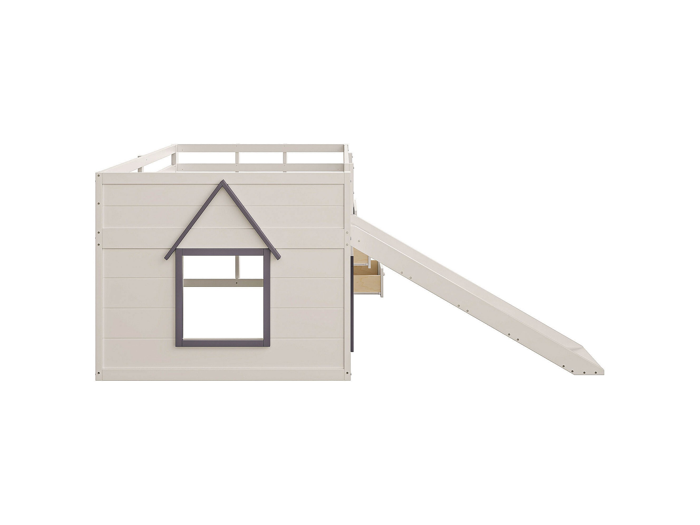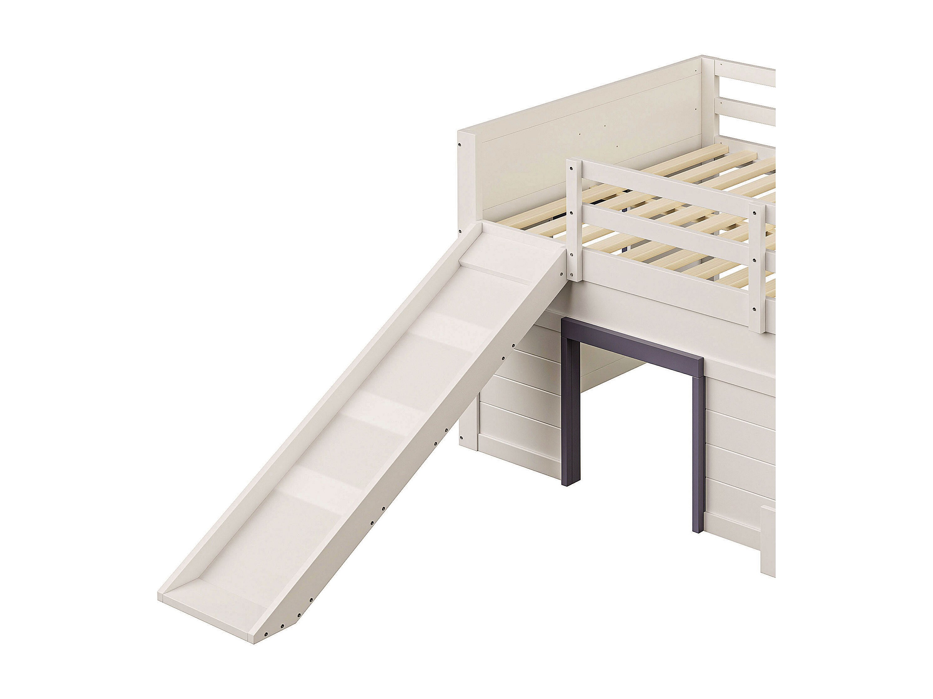 Lit mi-hauteur enfant couleur crème 140x200cm avec 3 tiroirs et glissière, design fenêtre, sans matelas