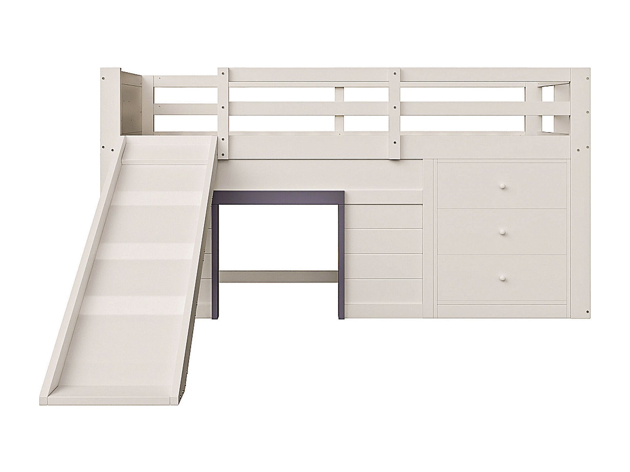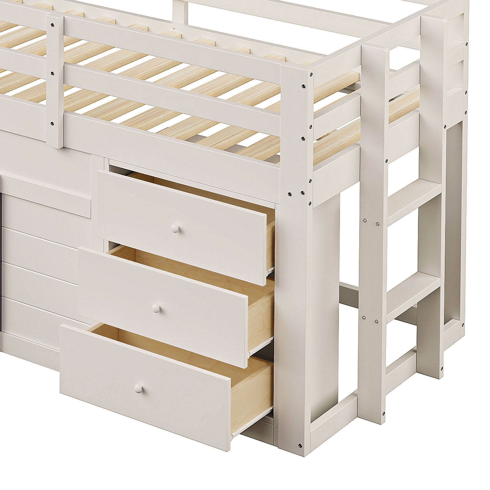 Lit mi-hauteur enfant couleur crème 90x200cm avec 3 tiroirs et glissière, design fenêtre, sans matelas