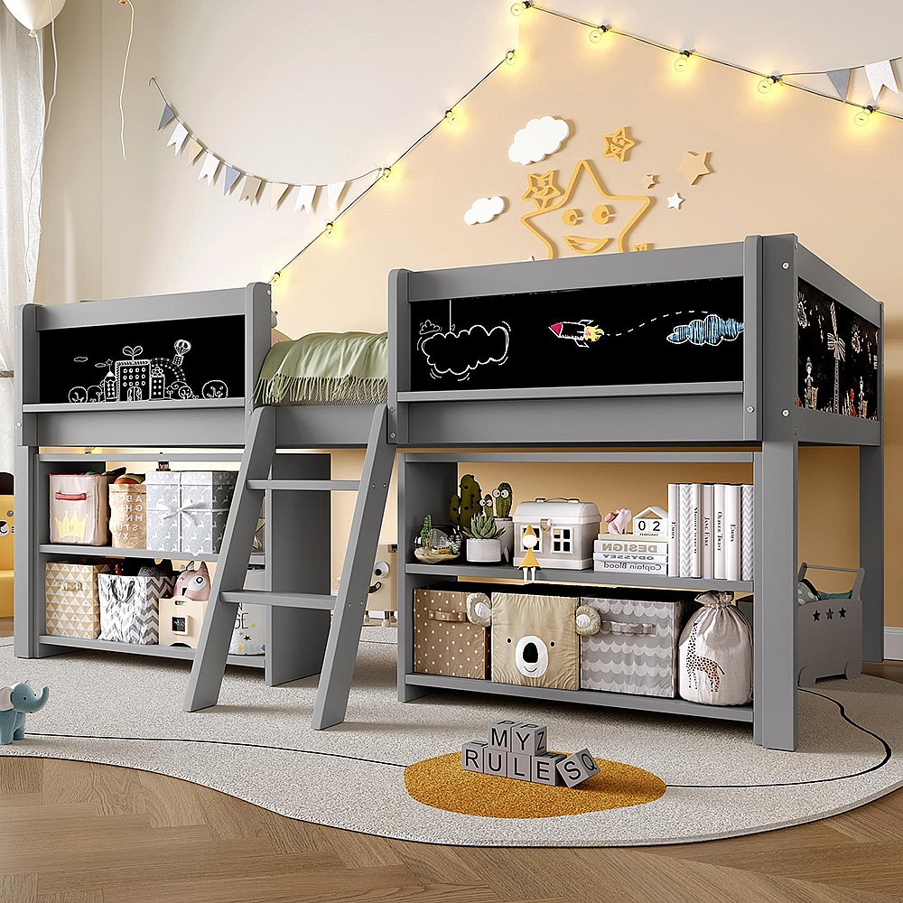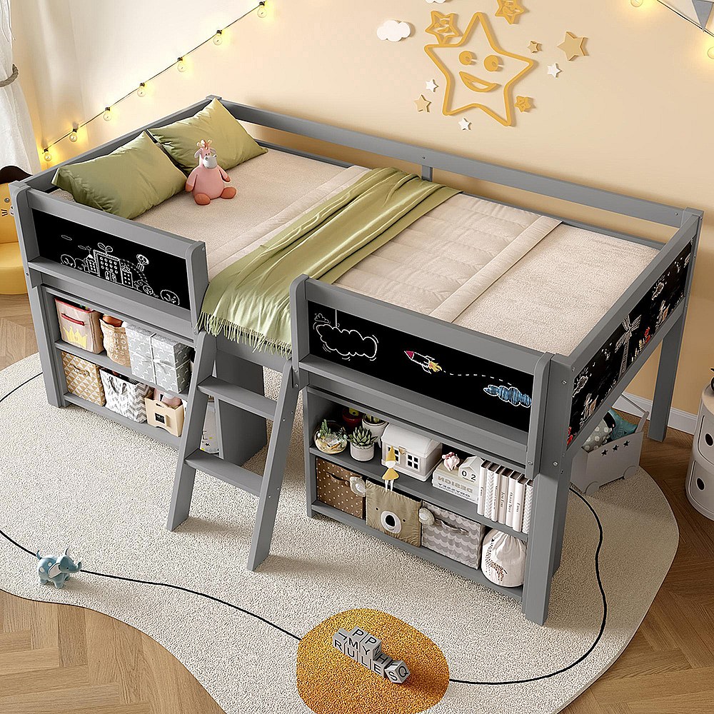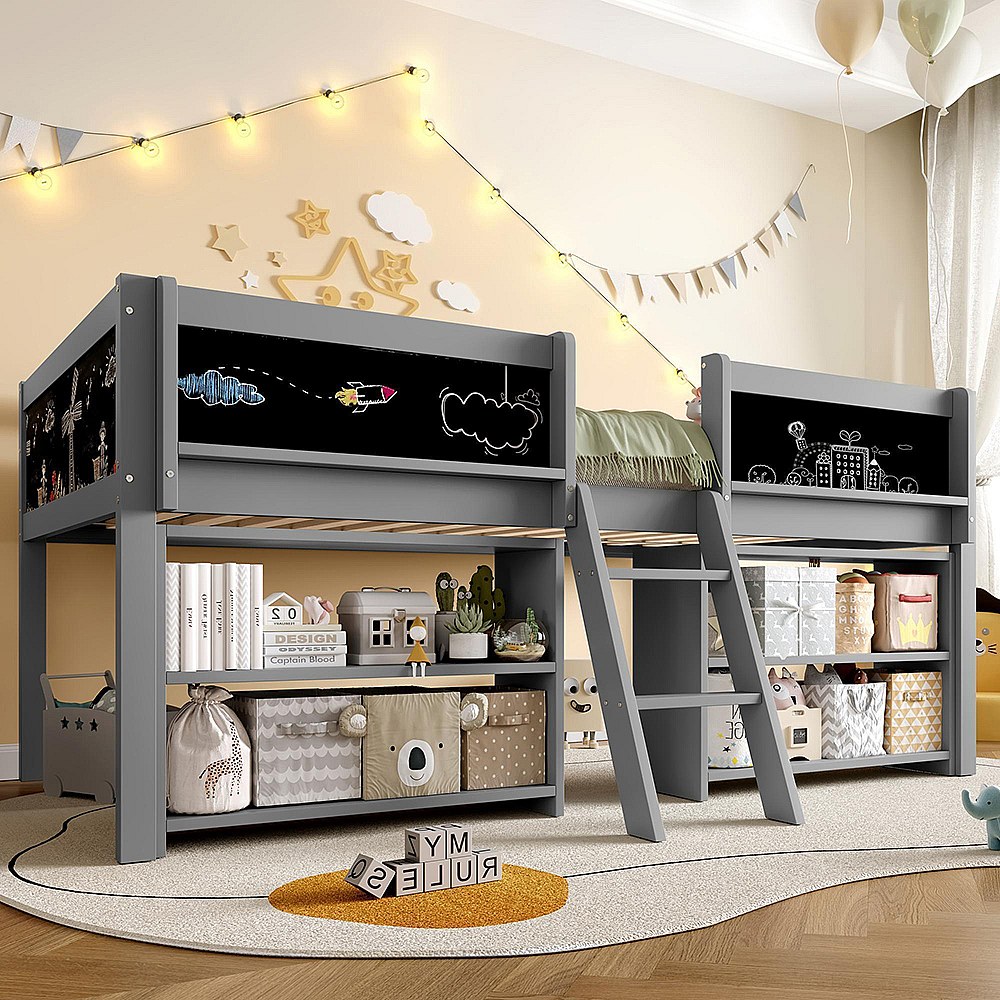 Lit mi hauteur lit mezzanine 90x200 cm pin gris sans matelas échelle barrières étagères style minimaliste