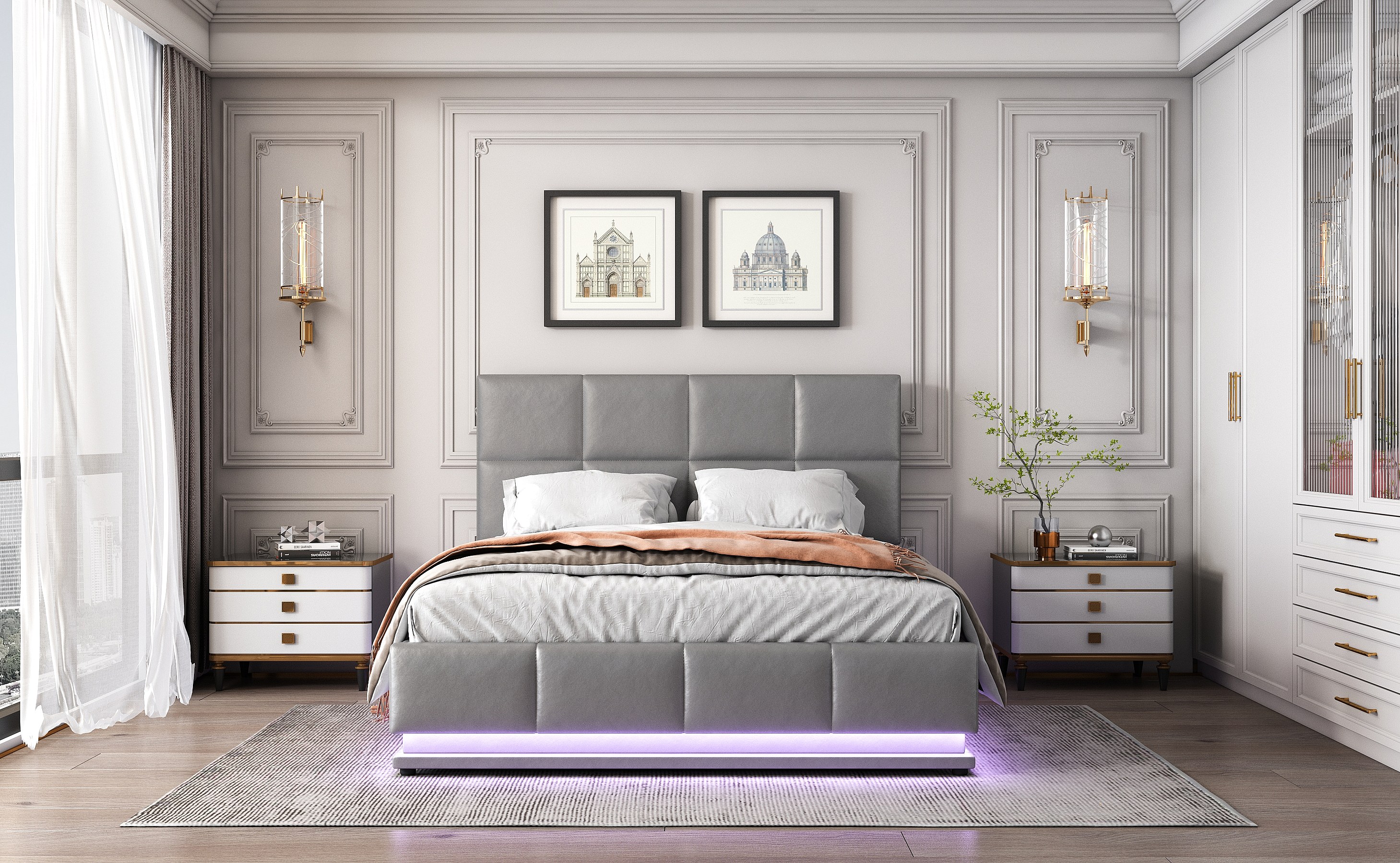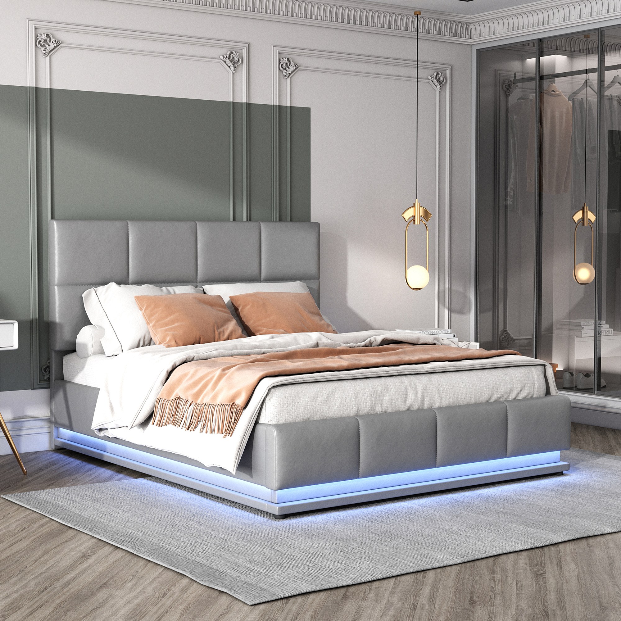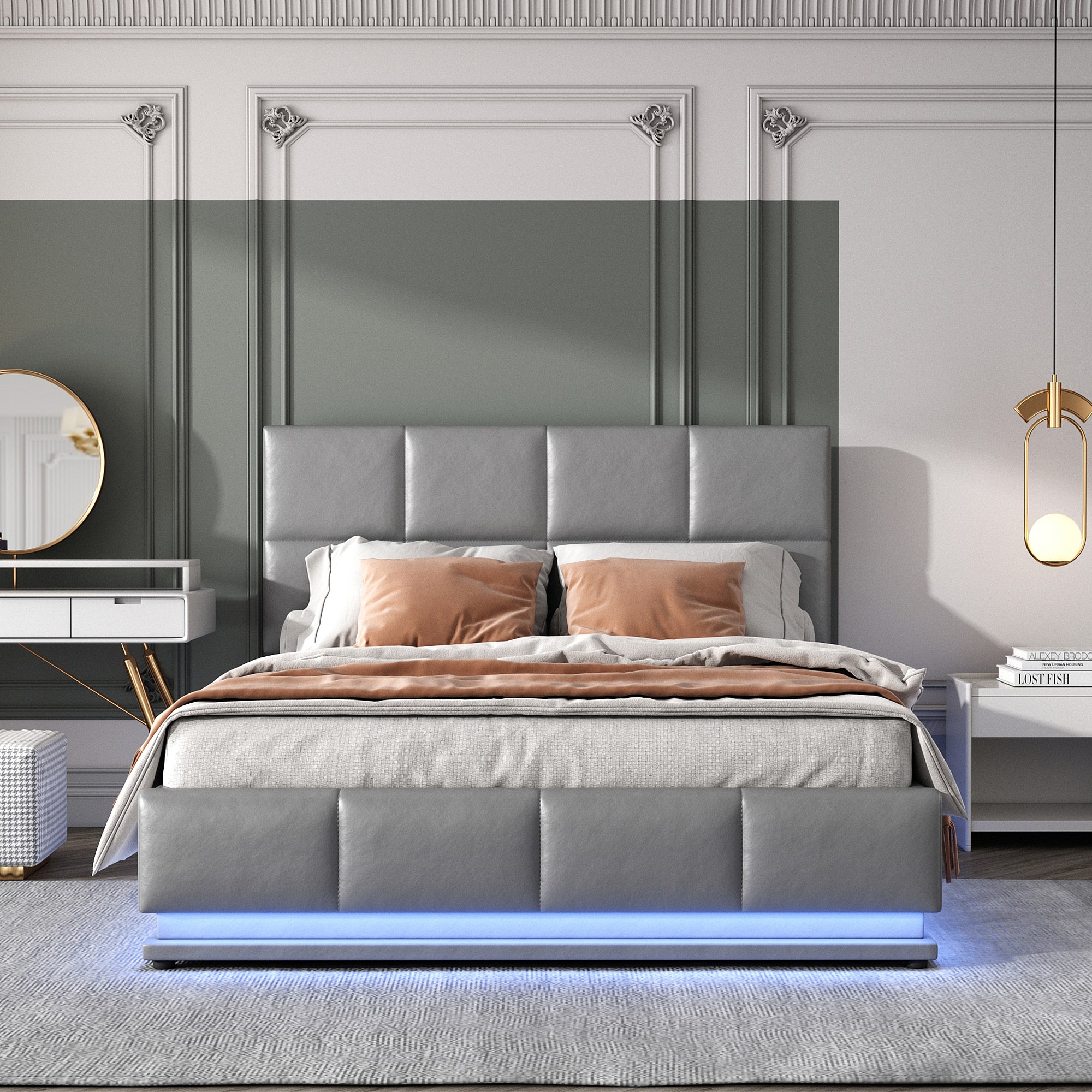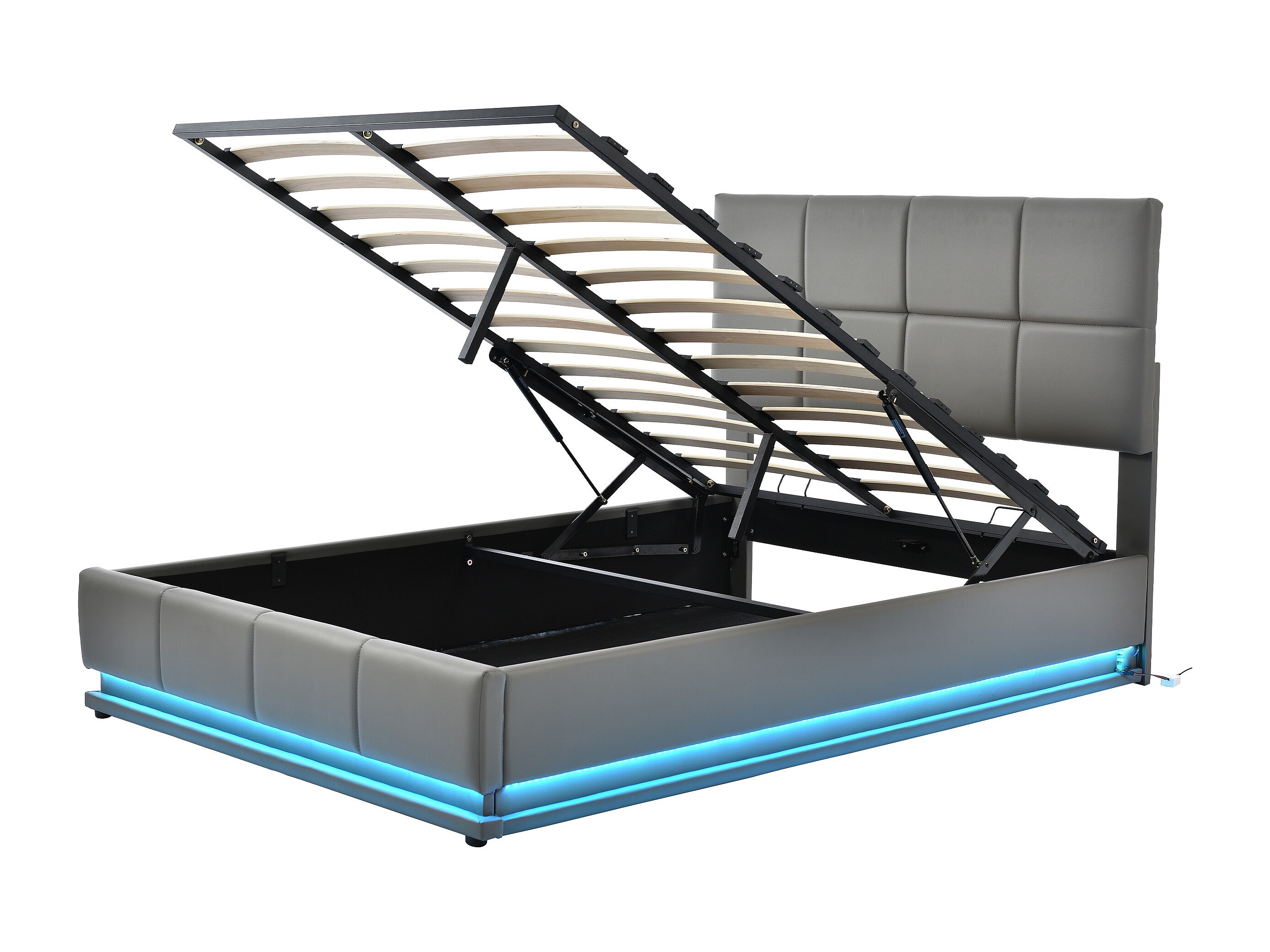 Lit moderne 140x200 cm avec éclairage LED et espace de rangement hydraulique en simili cuir gris