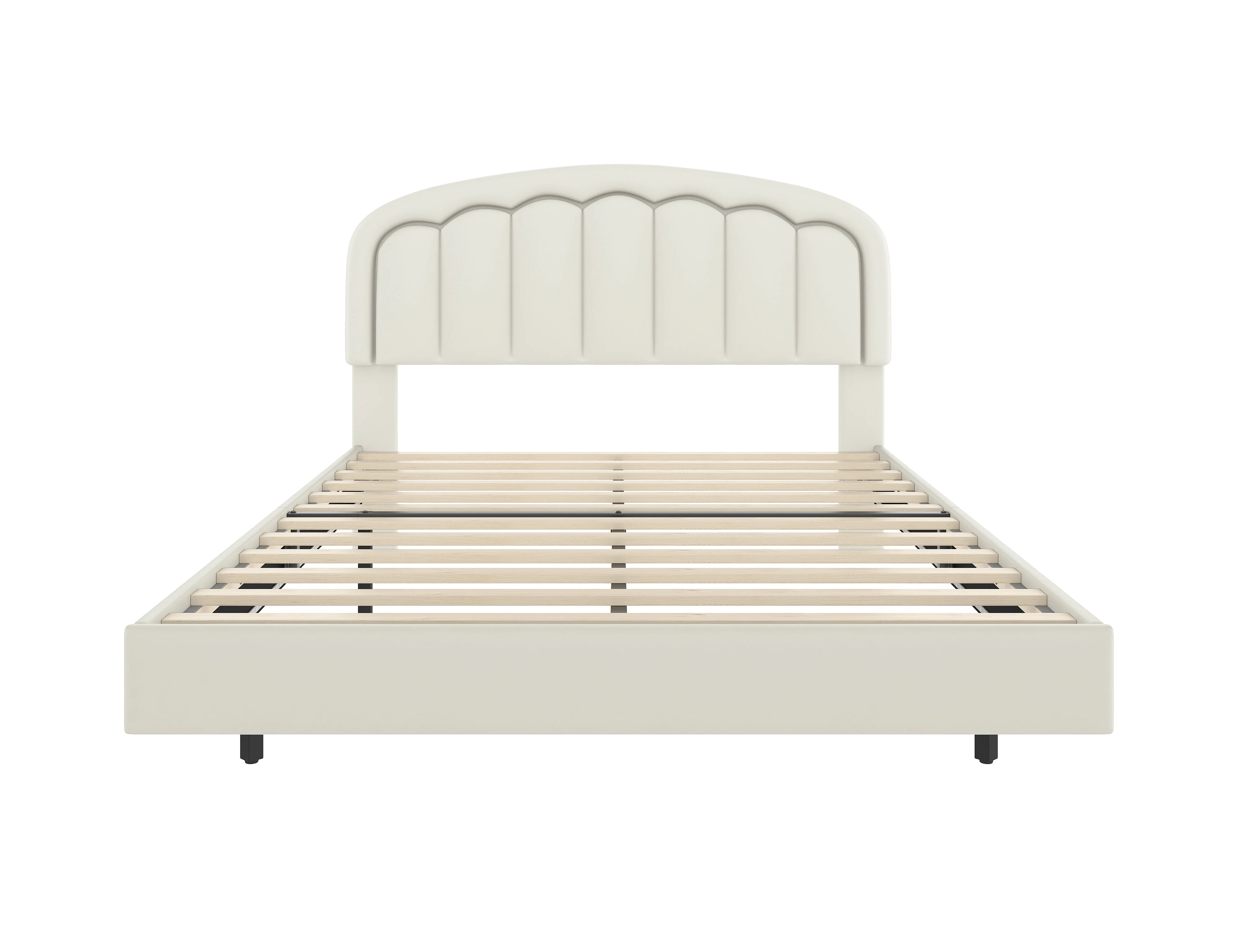 Lit moderne 140x200 cm blanc, design suspendu, LED, port USB-C, tête de lit en forme de pétale et espace de rangement pratique – élégant et confortable.