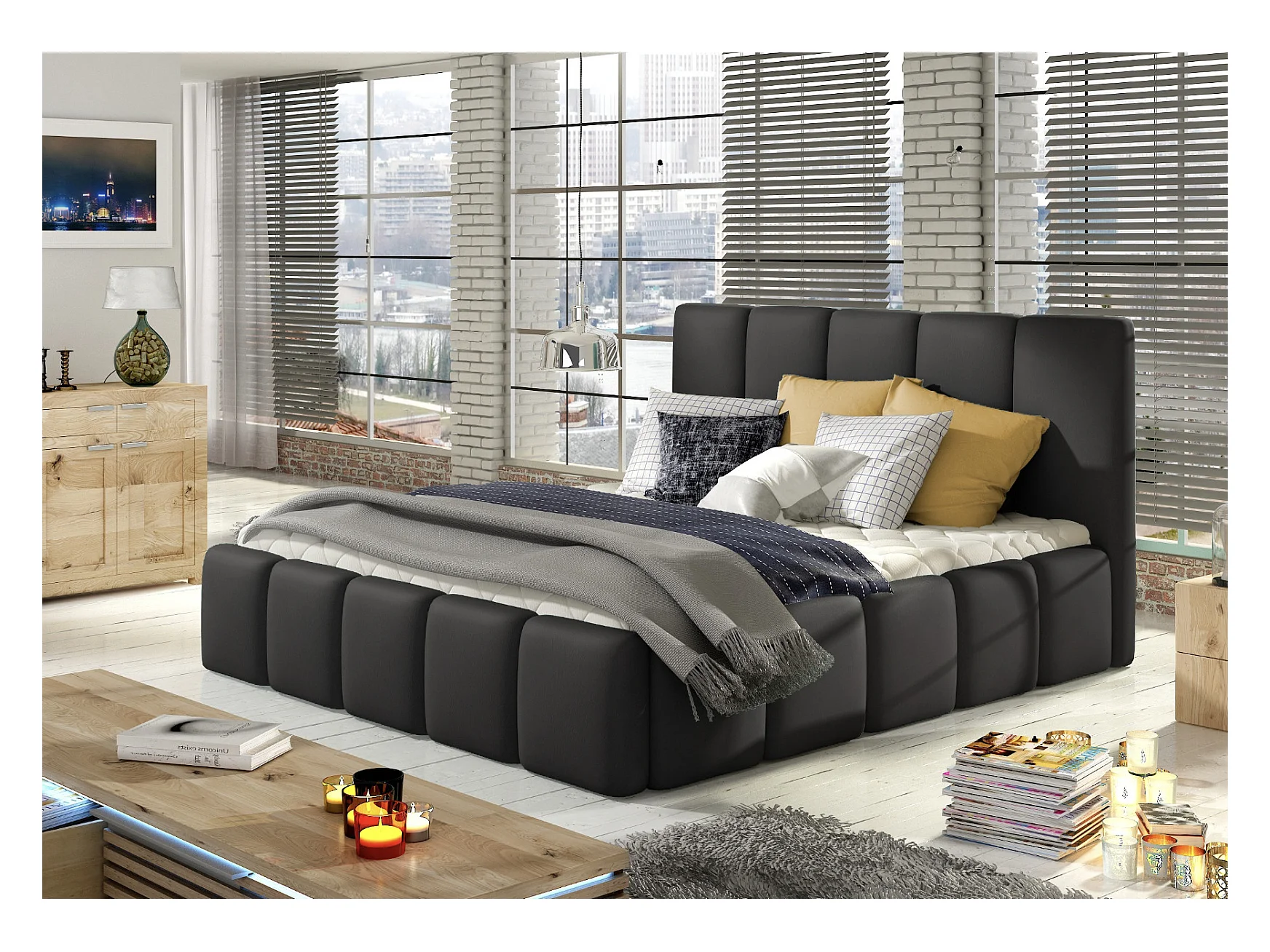 Lit moderne capitonné cuir synthétique Vika-Couleur Noir-180x200-Version avec sommier